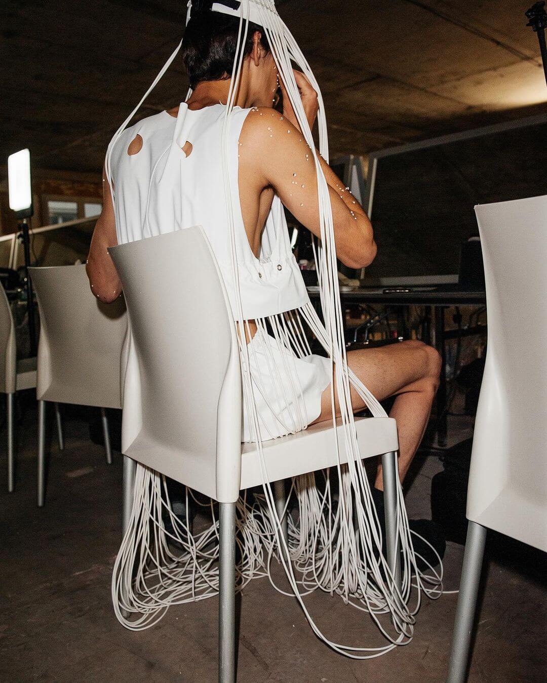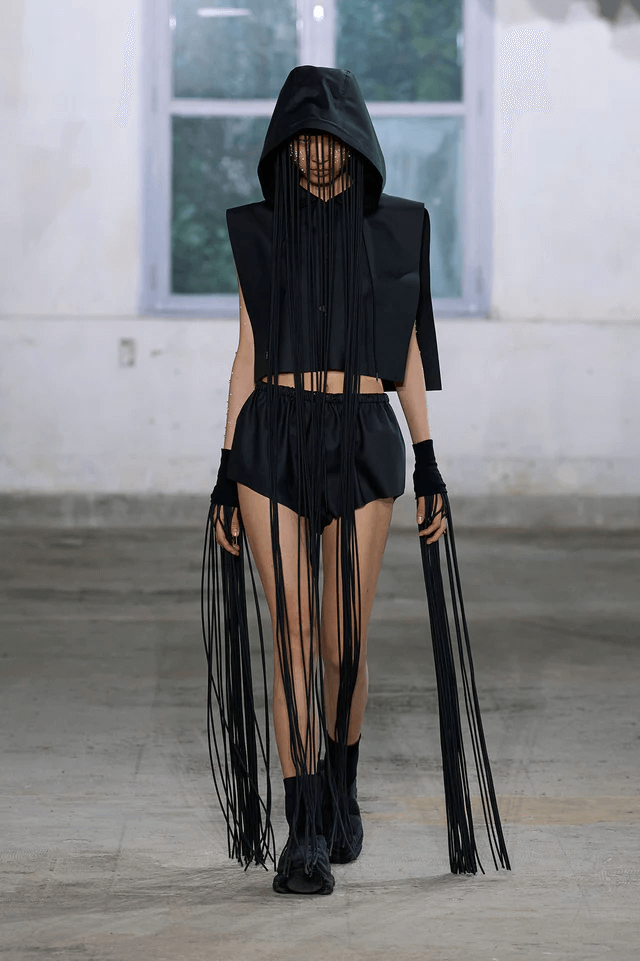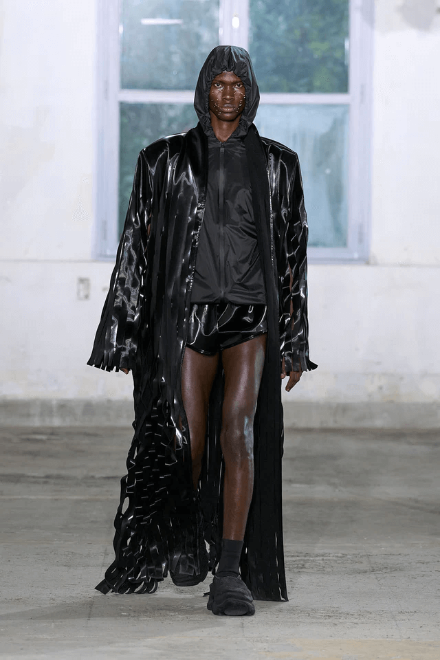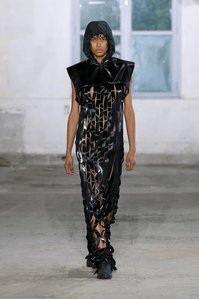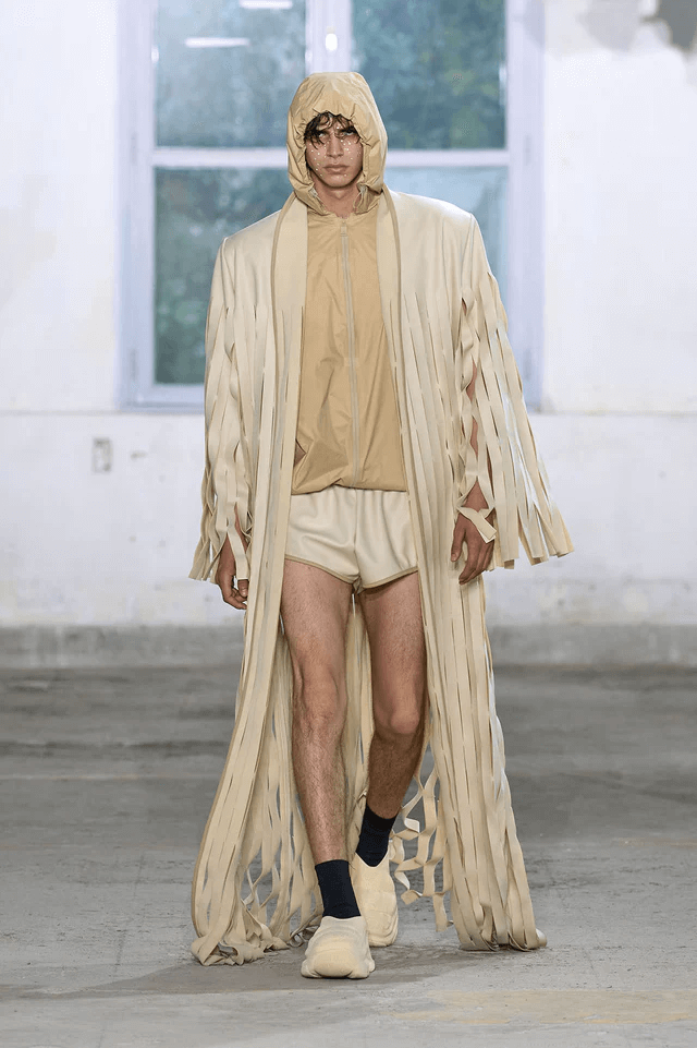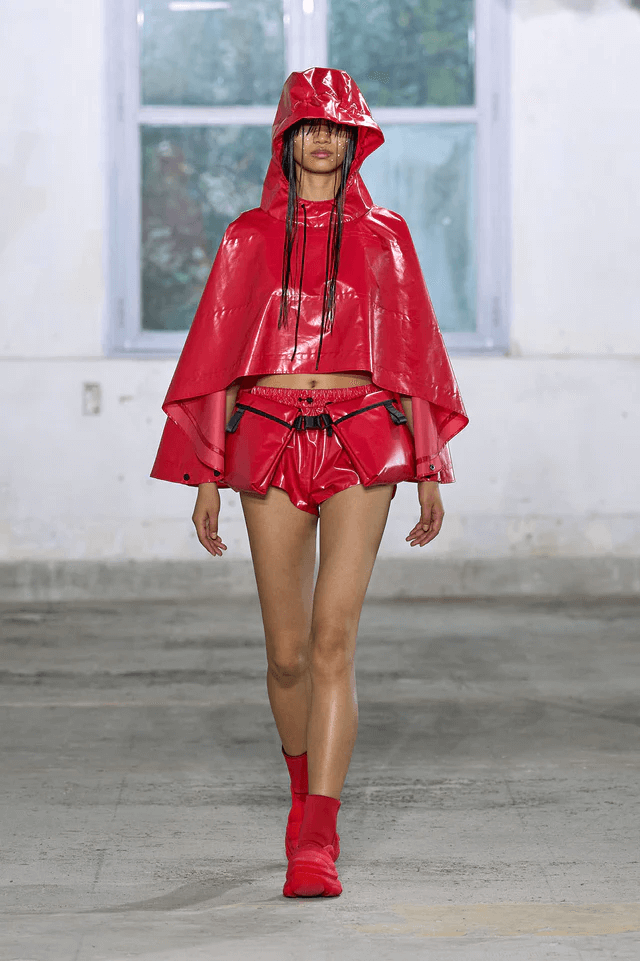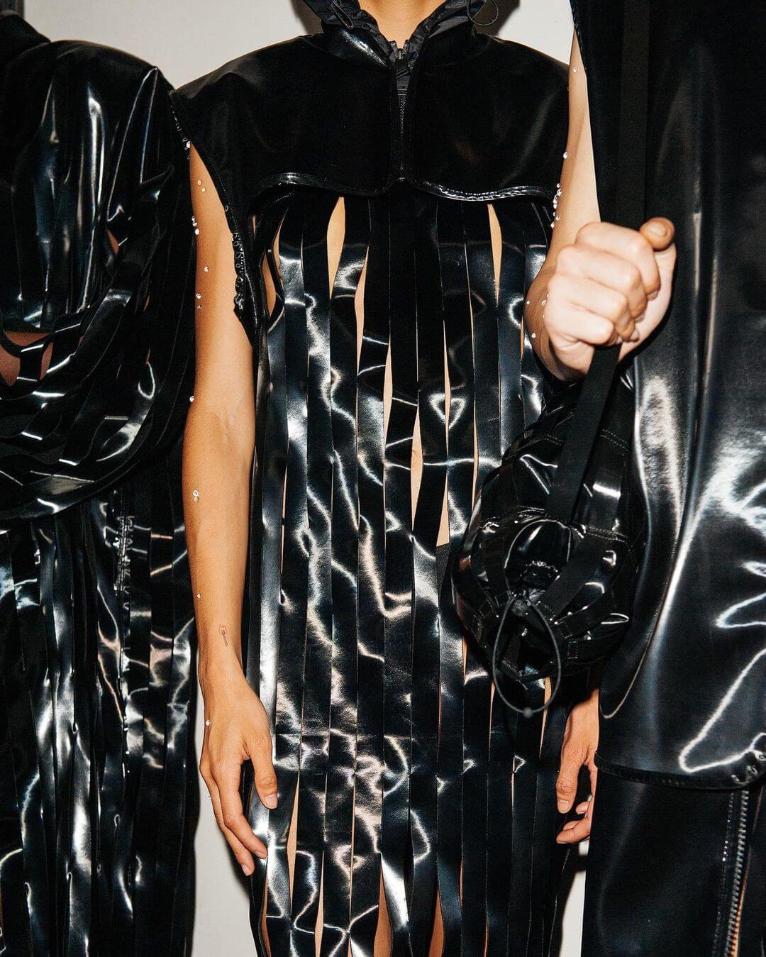 首席設計師 TANNE VINTER 一如既往地融合功能性的設計,利用聚氨酯 POLYURETHANE 展示紡織品在結構和紋理上的多功能性。將尖端創新的紡織技術與當代斯堪的納維亞美學相結合,透過結構紋理處理對紡織品進行改造,將雨衣製作出成超薄款式,甚至能造出皺褶變形的效果,打造出充滿活力、實用且植根於雨水的服裝系列;其中包括色彩豐富的連帽外套、超大尺寸剪裁的雨衣、褶邊斗篷和短款雨衣外套等更具新鮮感的設計。令人深刻的一些慵懶流蘇的單品,帶出雨中自由落體的錯覺。輔以穿著套裝時的疊搭單品及防水塗層物料的配飾,將雨衣的經典重新詮釋,形象驚豔全場。
