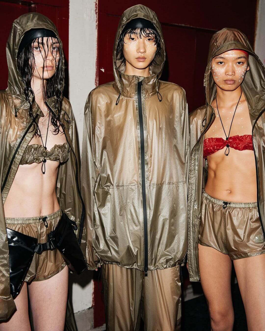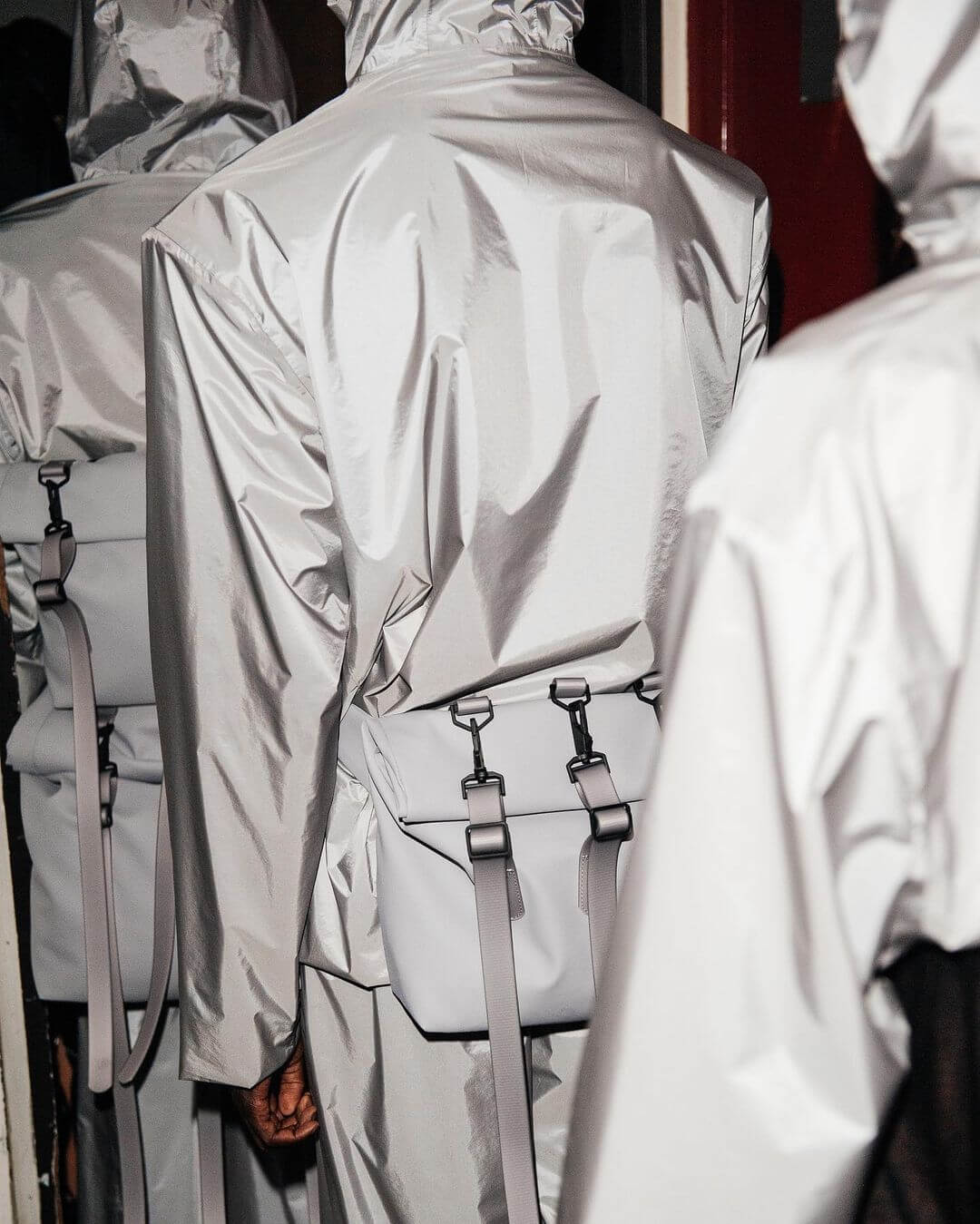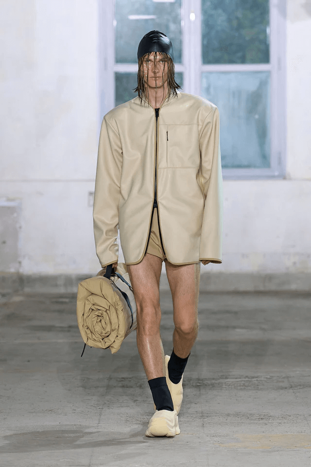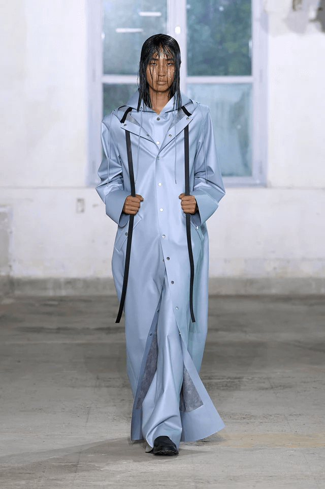 巴黎時裝週的陣雨天空下,丹麥外套品牌 RAINS 帶來 2024 年春夏時裝秀,地點為座落於巴黎的一座荒涼的倉庫裡時一場傾盆大雨覆蓋戶外,雨水從倉庫般的展示場地的柱上滴流下來,模特兒們魚貫而至,配合他們濕漉漉的頭髮造型, RAINS SS24 巧妙地以 DRENCHED (濕透) 命名,重新審視水,體現出擁抱水的自信,讓你陶醉在雨中漫步。