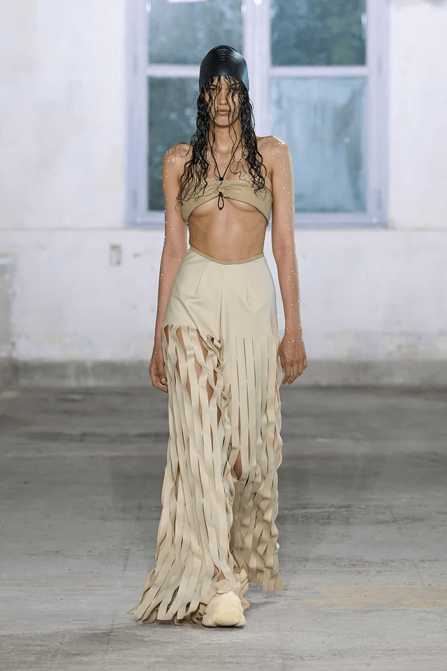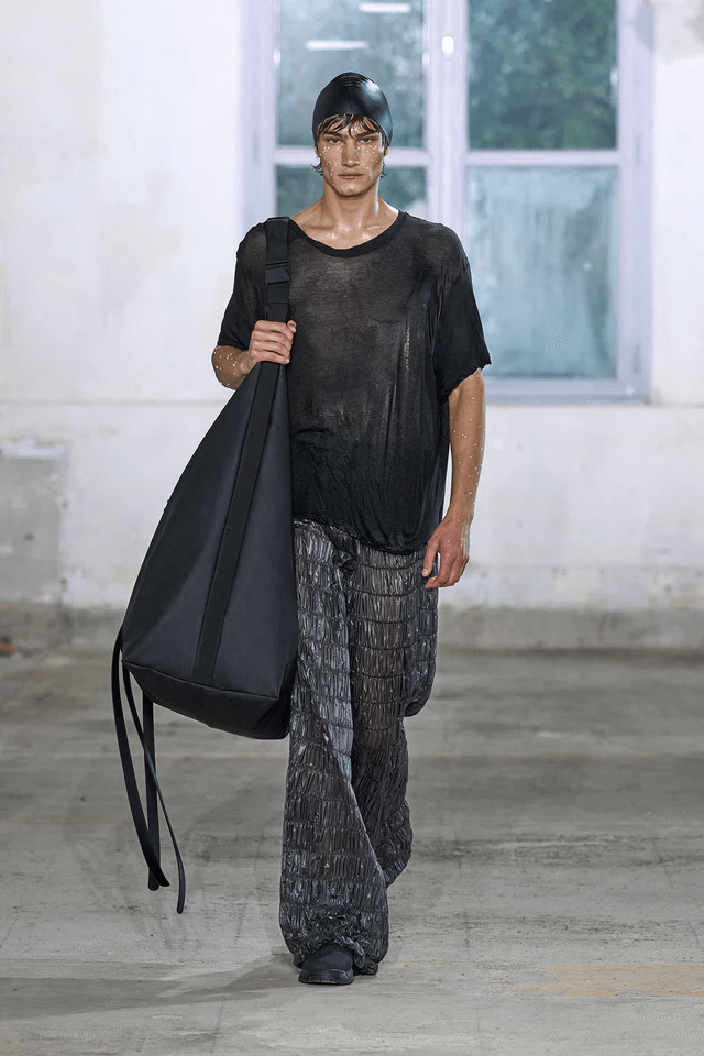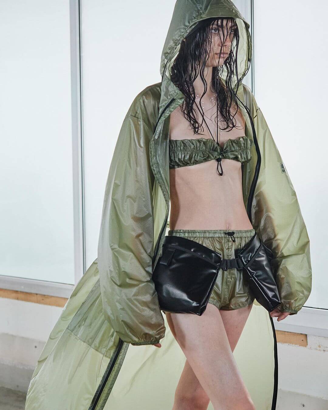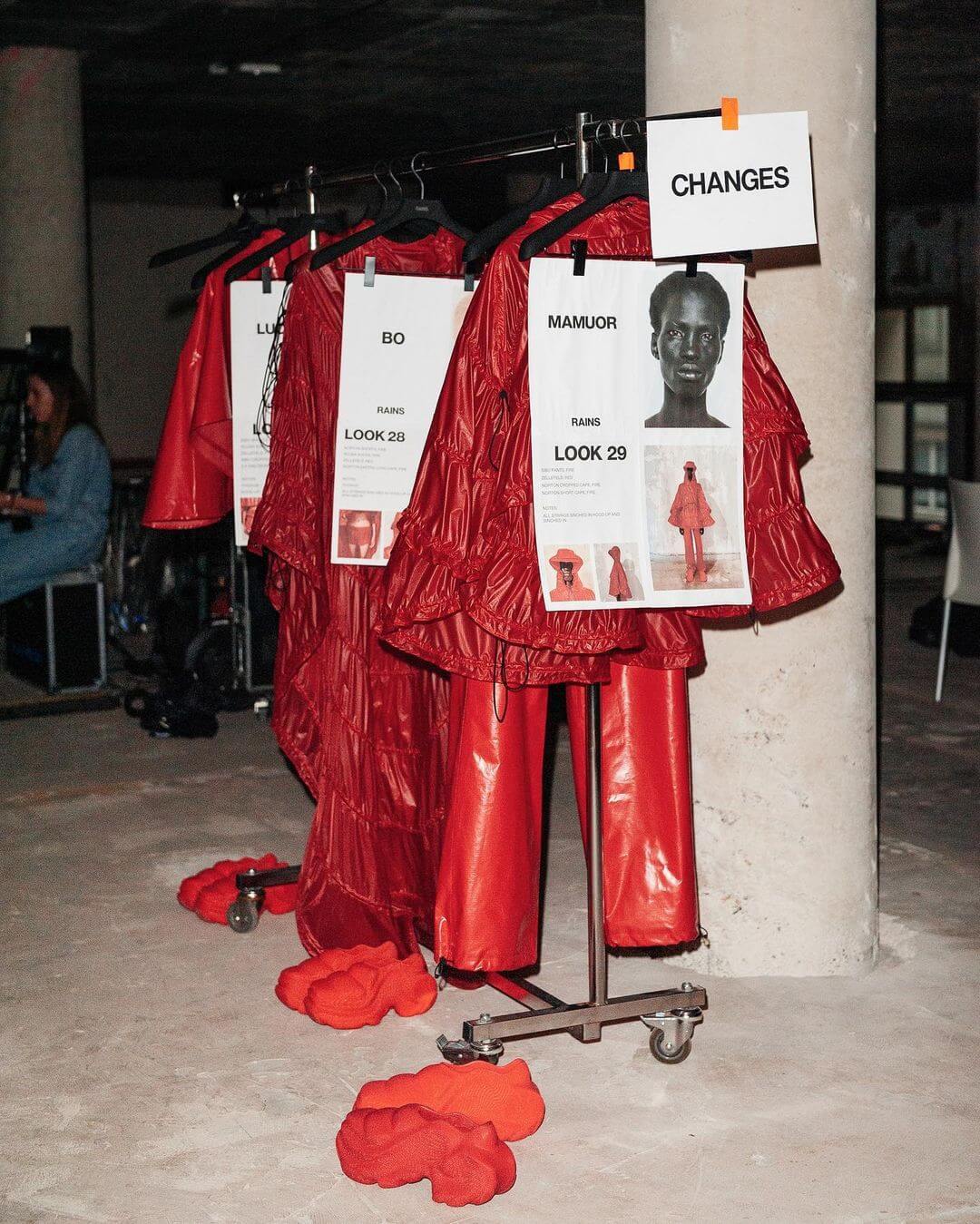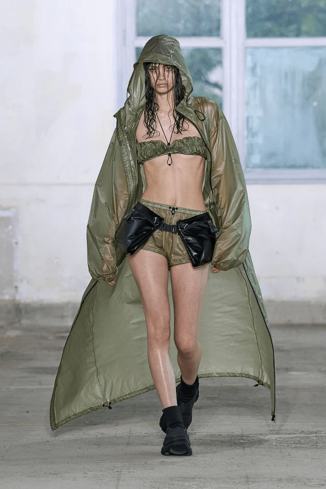 巴黎時裝週的陣雨天空下,丹麥外套品牌 RAINS 帶來 2024 年春夏時裝秀,地點為座落於巴黎的一座荒涼的倉庫裡時一場傾盆大雨覆蓋戶外,雨水從倉庫般的展示場地的柱上滴流下來,模特兒們魚貫而至,配合他們濕漉漉的頭髮造型, RAINS SS24 巧妙地以 DRENCHED (濕透) 命名,重新審視水,體現出擁抱水的自信,讓你陶醉在雨中漫步。