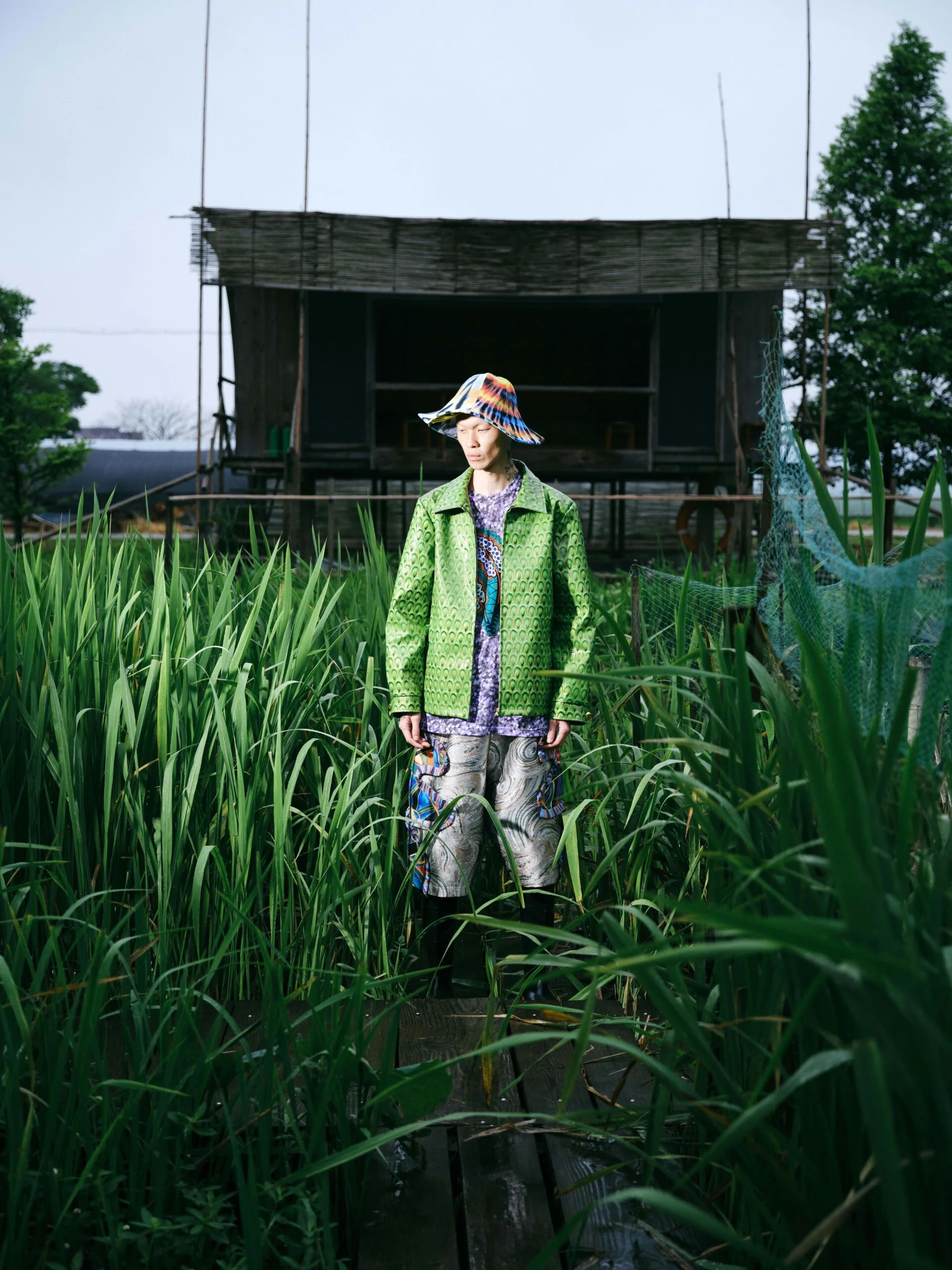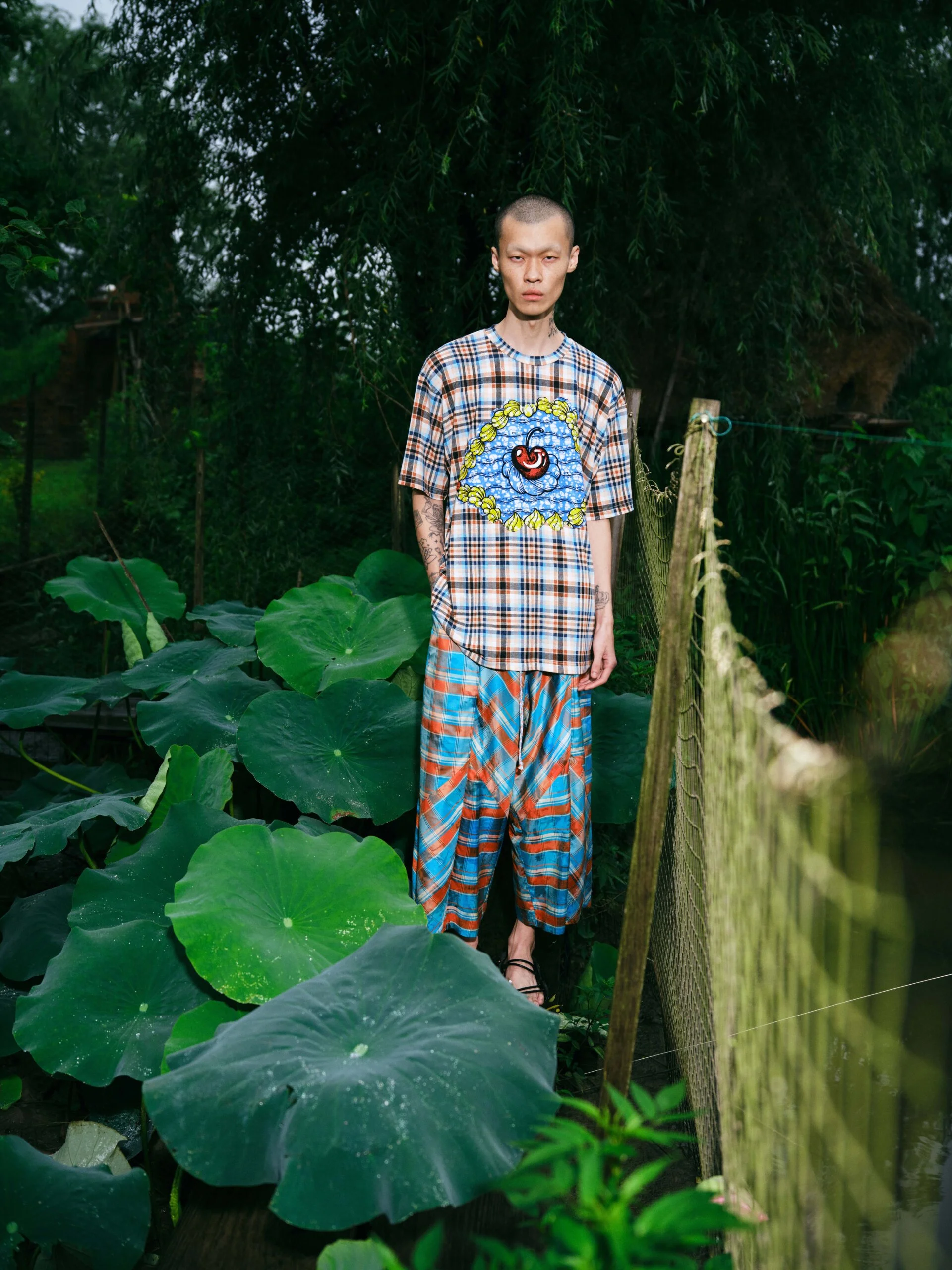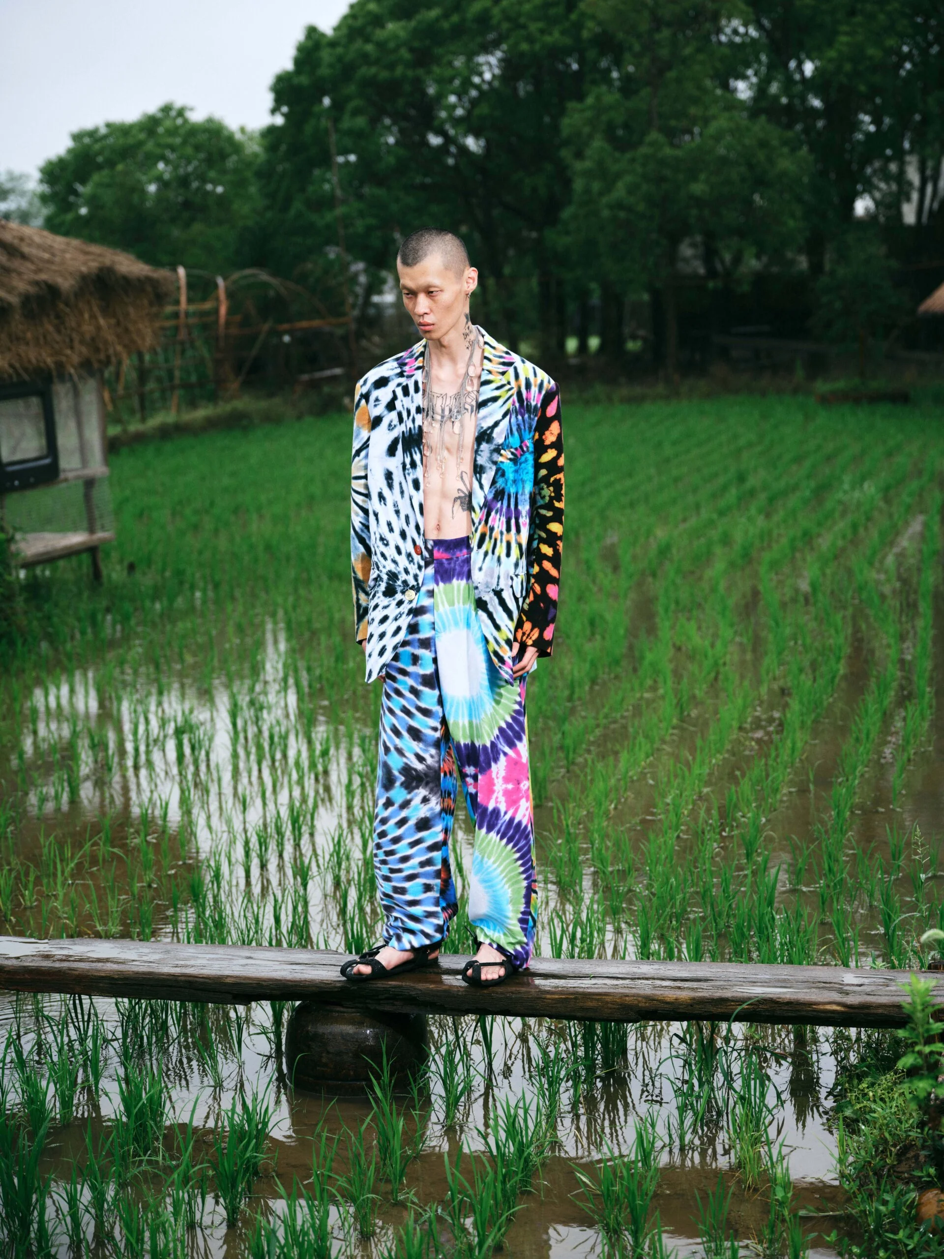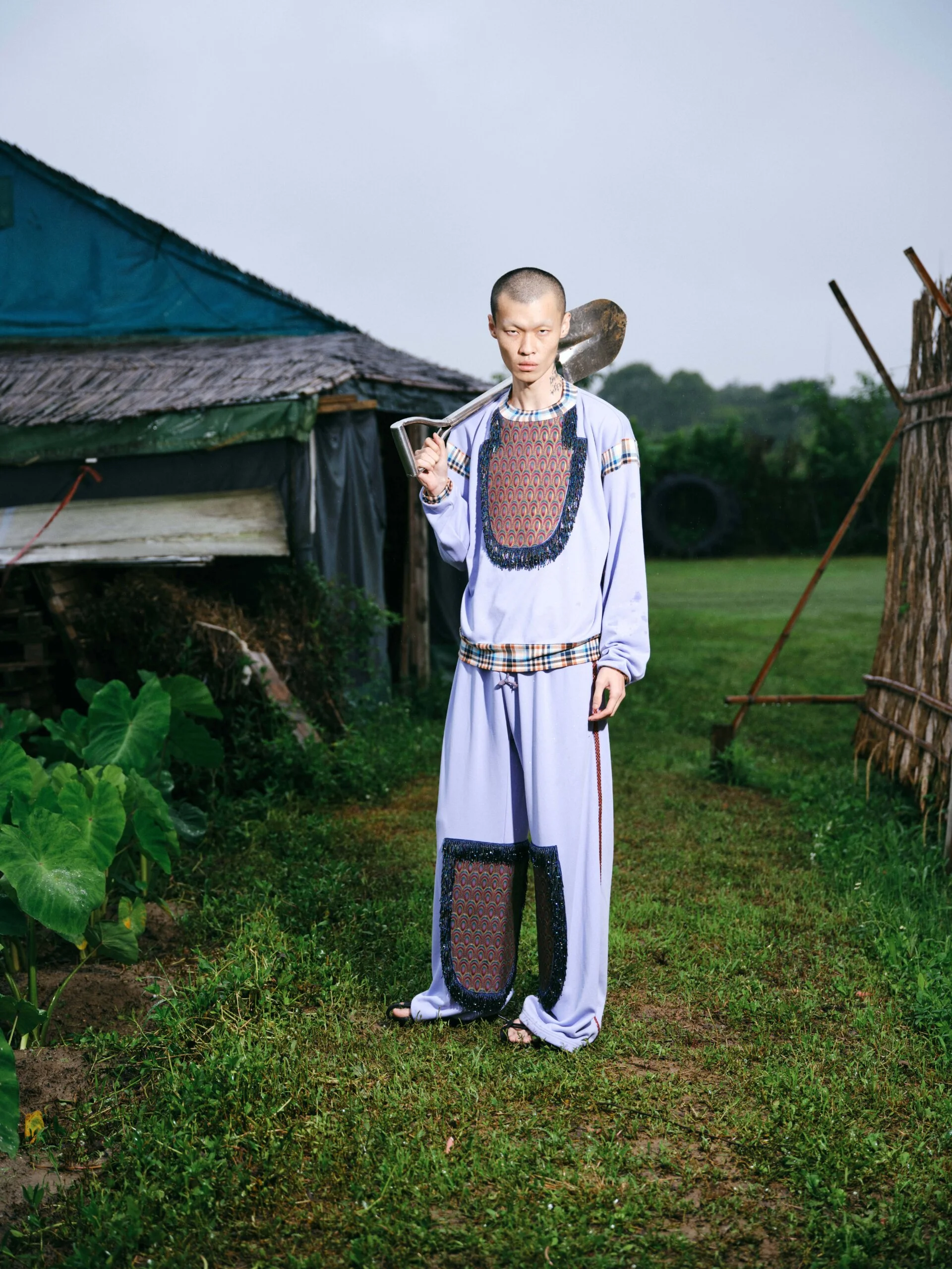 這一季因為覺得做 FASHION 有點累,就想做一些看起來和時尚毫無關係的東西。SS26的名字叫「HEART LAND」,靈感來自「鋤禾日當午,汗滴禾下土」這句詩。在我看來做衣服也是一種勞作,讓我去思考勞作的價值。我做了很多 TIE-DYE 的 T-SHIRT,因為我覺得TIE-DYE痕跡很像播種的種子,有某種規律性,同時也是通過手工勞作完成的印花。我還做了一些像汗水一樣的配飾,把勞作的汗水變成像珍珠一樣的存在。LOOKBOOK 是在上海崇明島拍的,那是一片由建築師轉行耕作的農田,有一種逃離城市、尋找生活平衡的感覺。