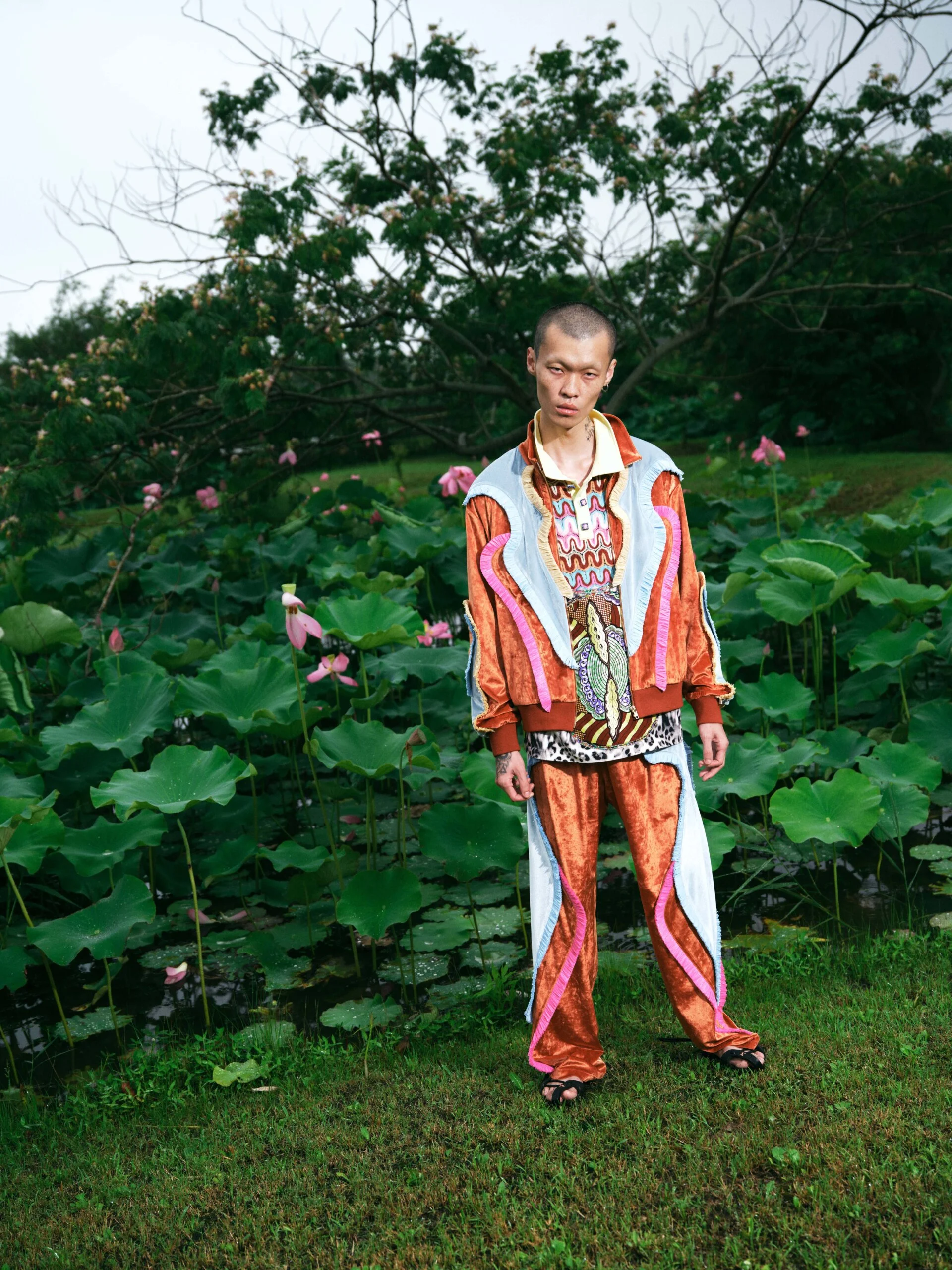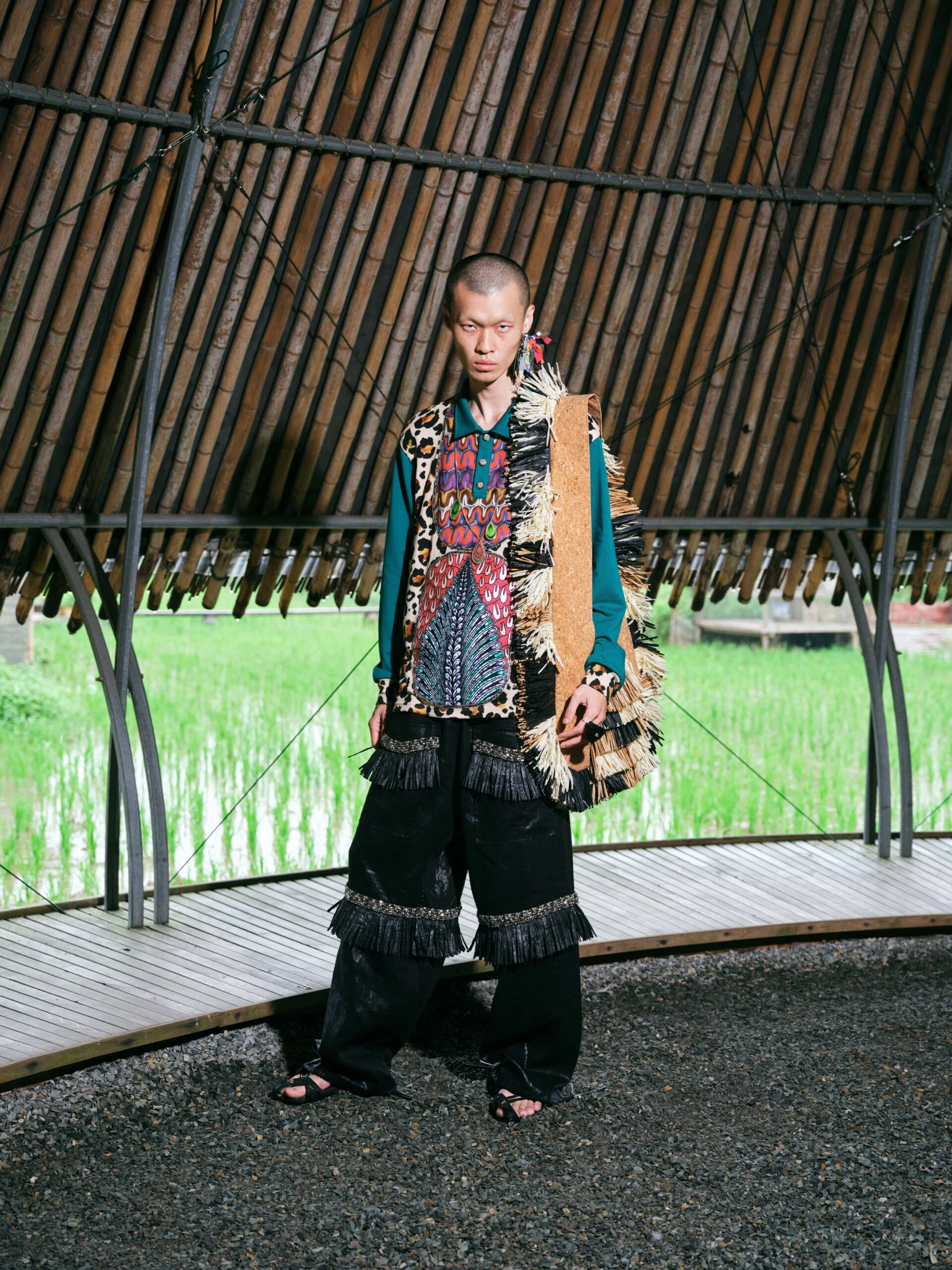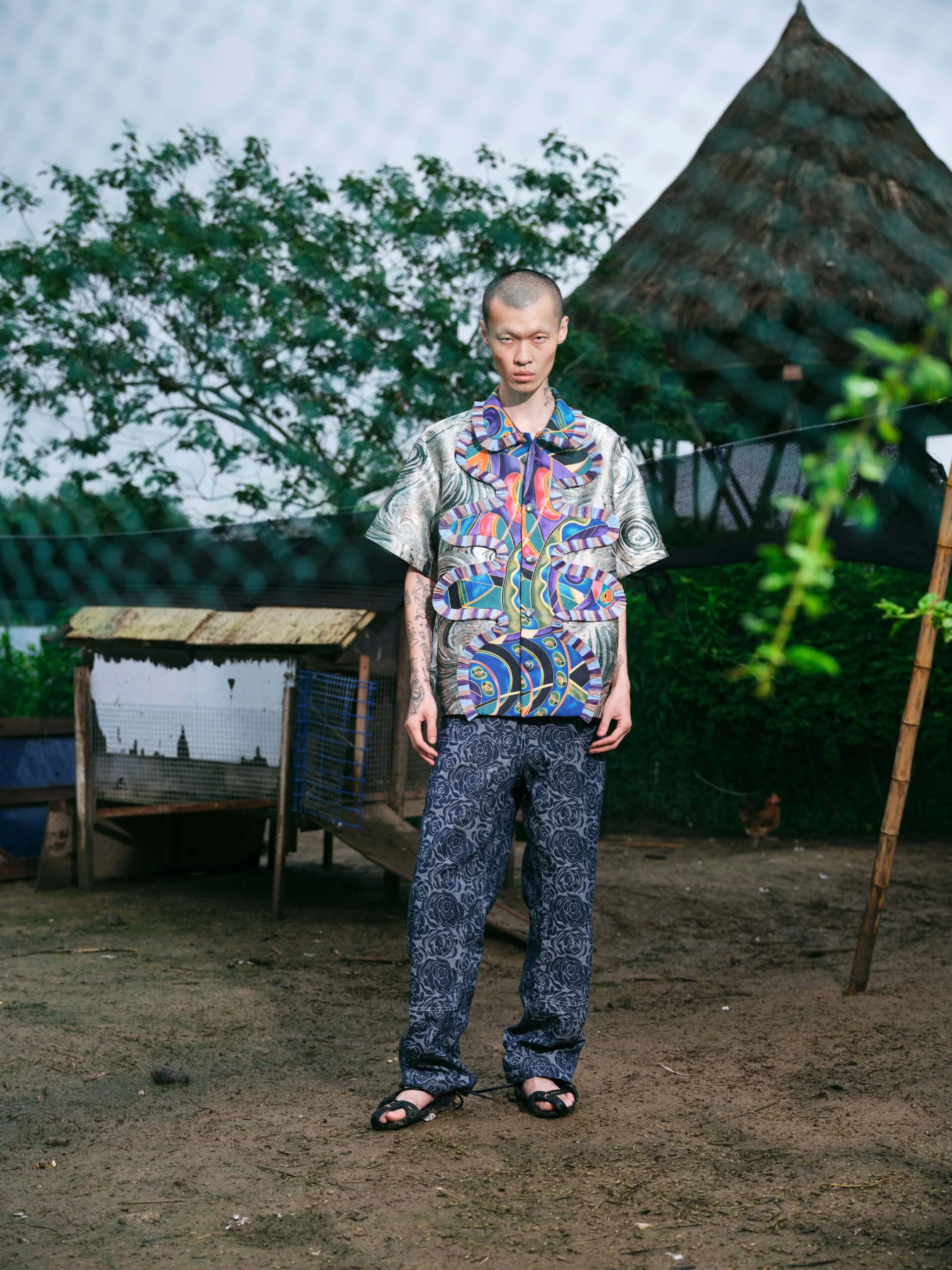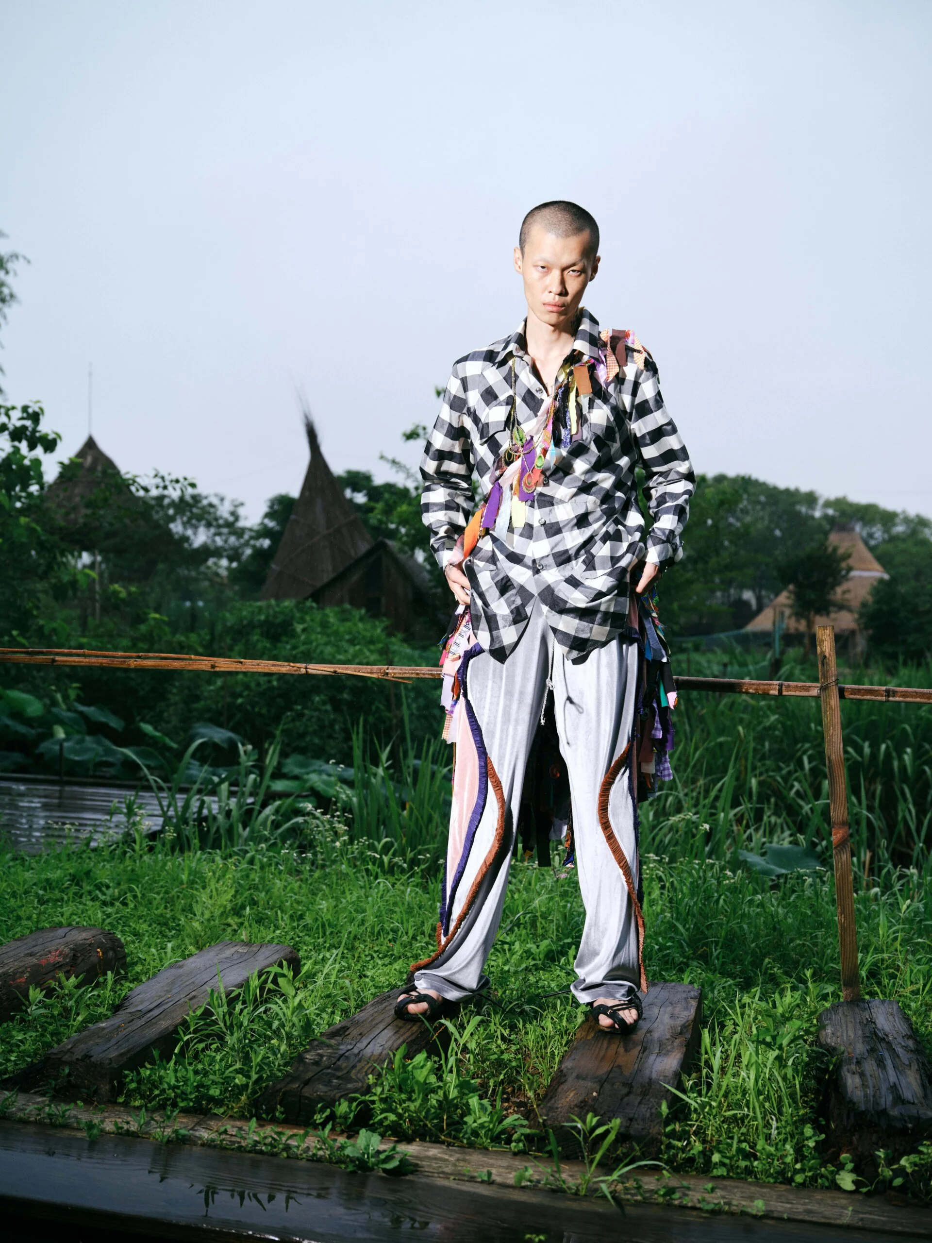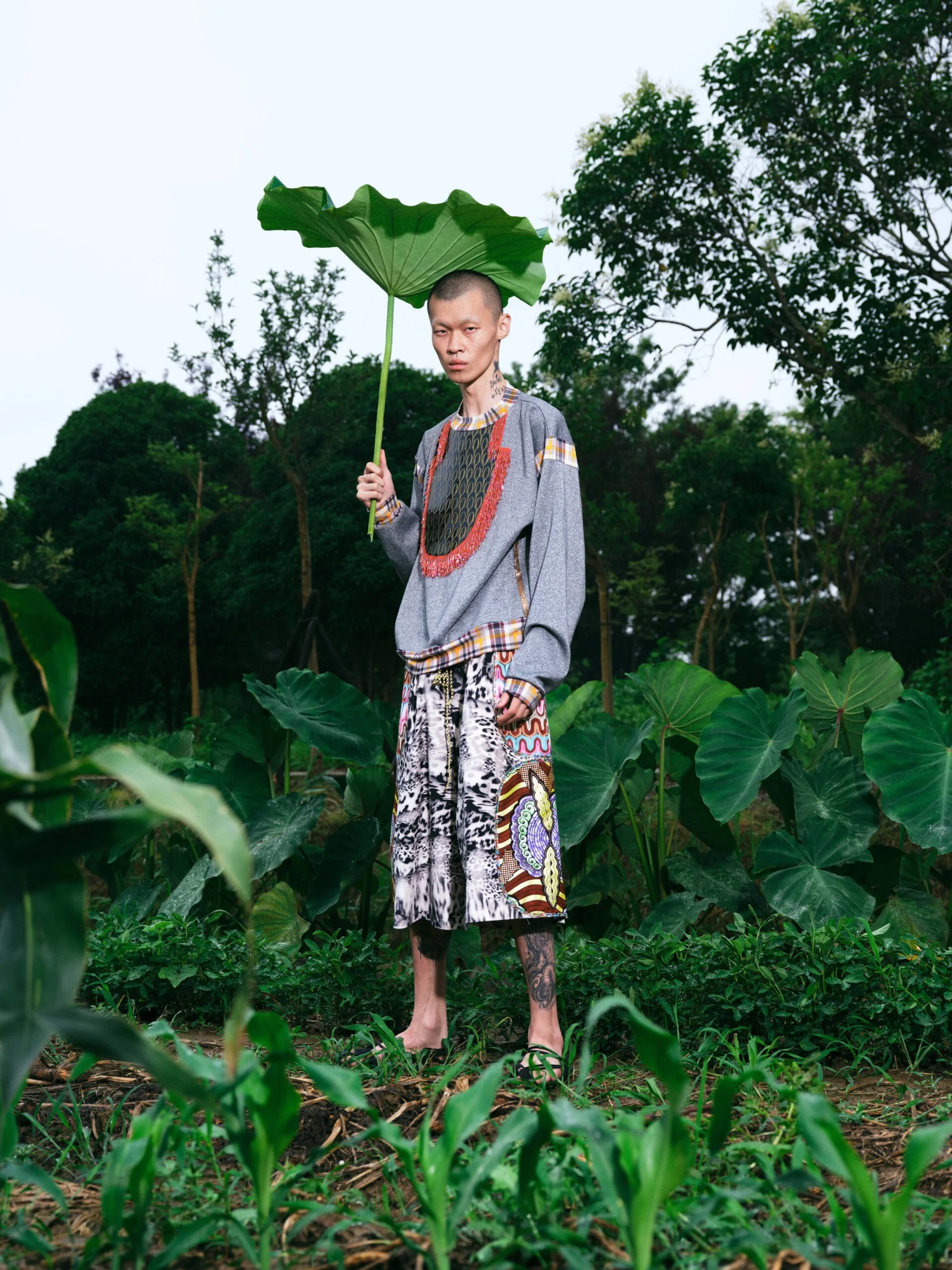 這一季因為覺得做 FASHION 有點累,就想做一些看起來和時尚毫無關係的東西。SS26的名字叫「HEART LAND」,靈感來自「鋤禾日當午,汗滴禾下土」這句詩。在我看來做衣服也是一種勞作,讓我去思考勞作的價值。我做了很多 TIE-DYE 的 T-SHIRT,因為我覺得TIE-DYE痕跡很像播種的種子,有某種規律性,同時也是通過手工勞作完成的印花。我還做了一些像汗水一樣的配飾,把勞作的汗水變成像珍珠一樣的存在。LOOKBOOK 是在上海崇明島拍的,那是一片由建築師轉行耕作的農田,有一種逃離城市、尋找生活平衡的感覺。