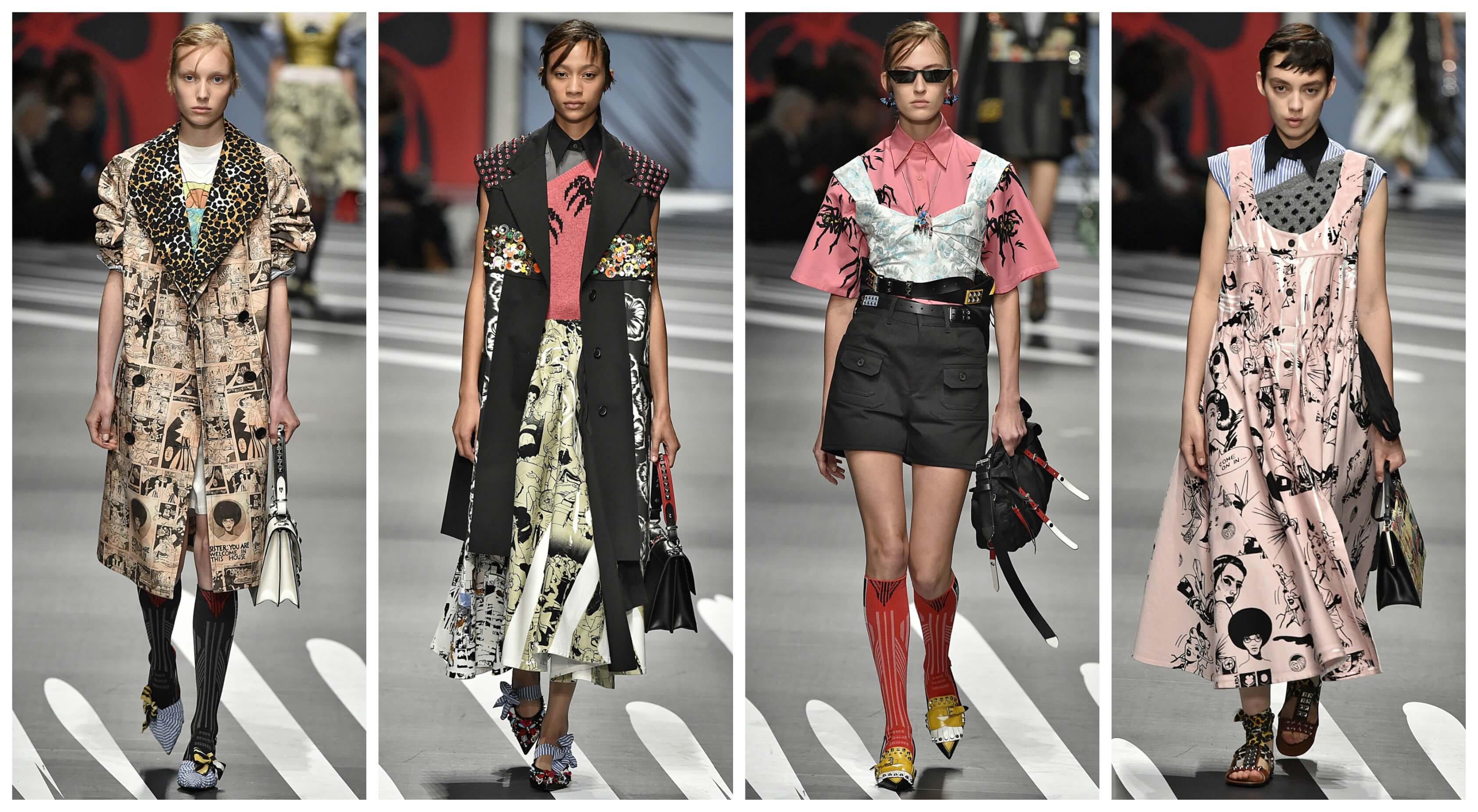 細節方面,一向以閃亮珠飾作衣服的細節和配搭飾品的 Prada,這回全部都不見了!!取而代之的是窩釘與啪鈕,製造硬朗感覺。這是 Miuccia 要向世界表示,「女孩子叮叮噔噔」的時代要結束了嗎?(哭了我最愛 Prada 的珠飾配搭…)其實,這是無可厚非的,已經有如此豐富的漫畫圖案作衣服的面料圖案,還需要甚麼華麗的珍珠甚麼昂貴的閃石嗎?根本就是多餘!也許,這就是刻畫着新時代的開端,為 Maximalism 寫出新的定義。