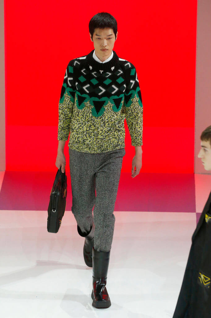 當PRADA化身成幾何圖形LOGO BROOCH無所不在,似乎比起高街潮流吹奏的MONOGRAM更有力。配合馬術的大環境氣氛,今季不出所料會看見經典粗花呢的修身西服,燈芯絨夾克與靴子兩者的元素混合在一起,帶有DRESSAGE味道的編織毛衣背心為今個季度加分。