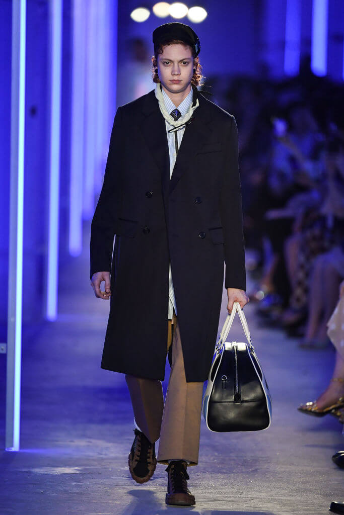 看看SS20的陣容,叫人直接想起蔡徐坤為品牌拍攝的2019秋冬男裝系列廣告大片。演繹後人類的生活與Code Human想法,品牌再次和科學怪人致敬。冰冷燈光四射下,實驗裝置成為Prada女士專屬的未來人類博物館。我們看見經典Prada尼龍設計再次上台,華麗轉身變作背心和七分褲的設計玩味別緻。混合襯衫上寬大實用性口袋細節,整個系列走向更年輕活力卻又不失八十年代的氛圍。印花設計上刻意混合色彩鮮豔的模擬磁帶和80年代風格的VHS攝像機配襯,讓中性色調穿梭在短款西裝設計之中。相信心思細膩的你必然看見男裝秀中模特兒手提的保齡球,不約而同呼應女裝系列。