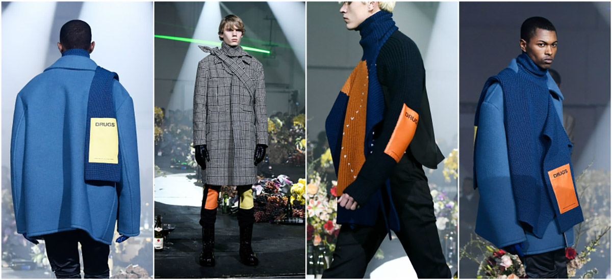 為了回應毒品的主題,部份的設計以拼貼的手法印上寫着 LSD XTC GHB 和 2C-B 這些毒品名稱的色塊,圍巾、褲子的膝蓋部份隨處可見。這個系列在色調的運用方面相當得宜,可惜的是,這些拼貼的設計反而令人有畫蛇添足的感覺,否則整體而言也是一個富設計感的系列。