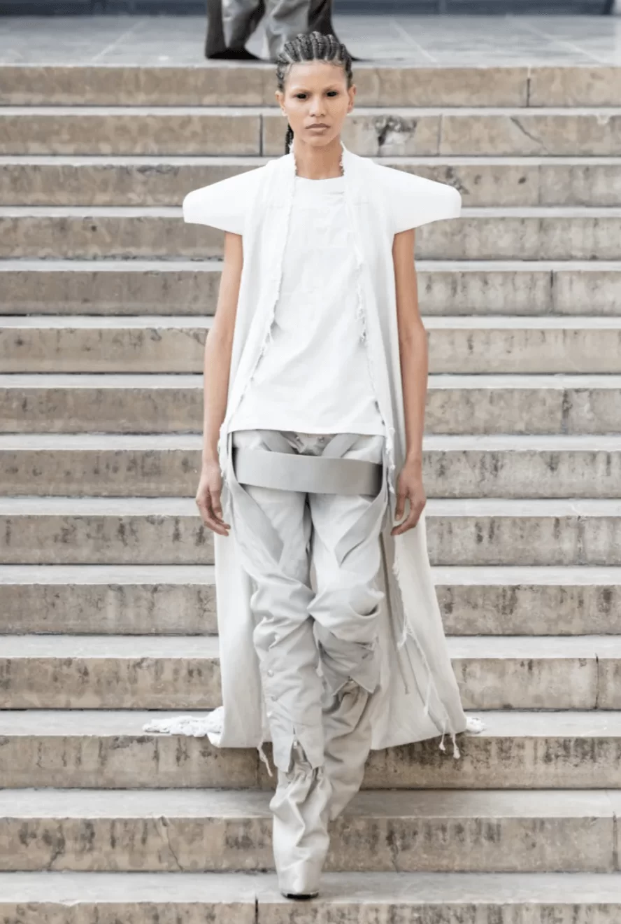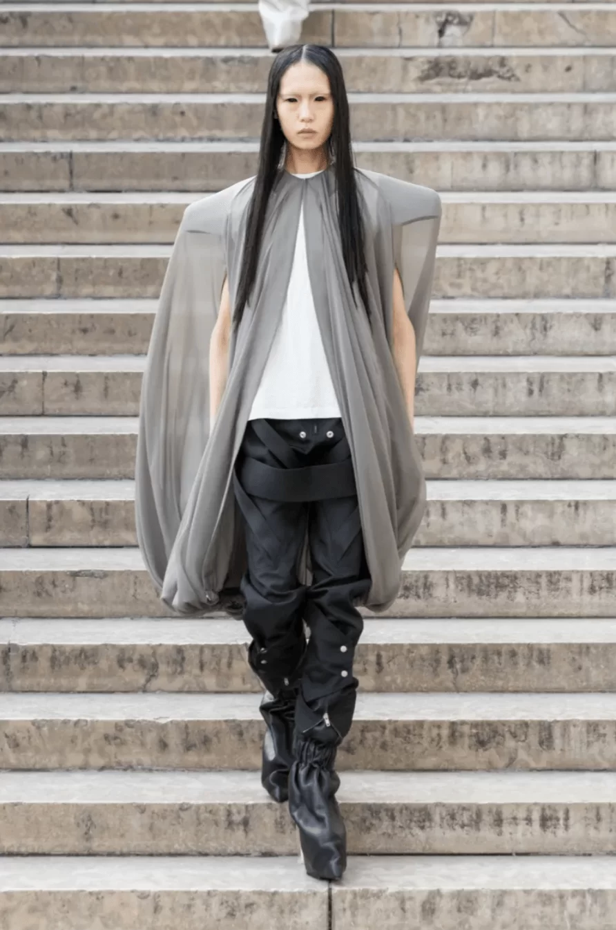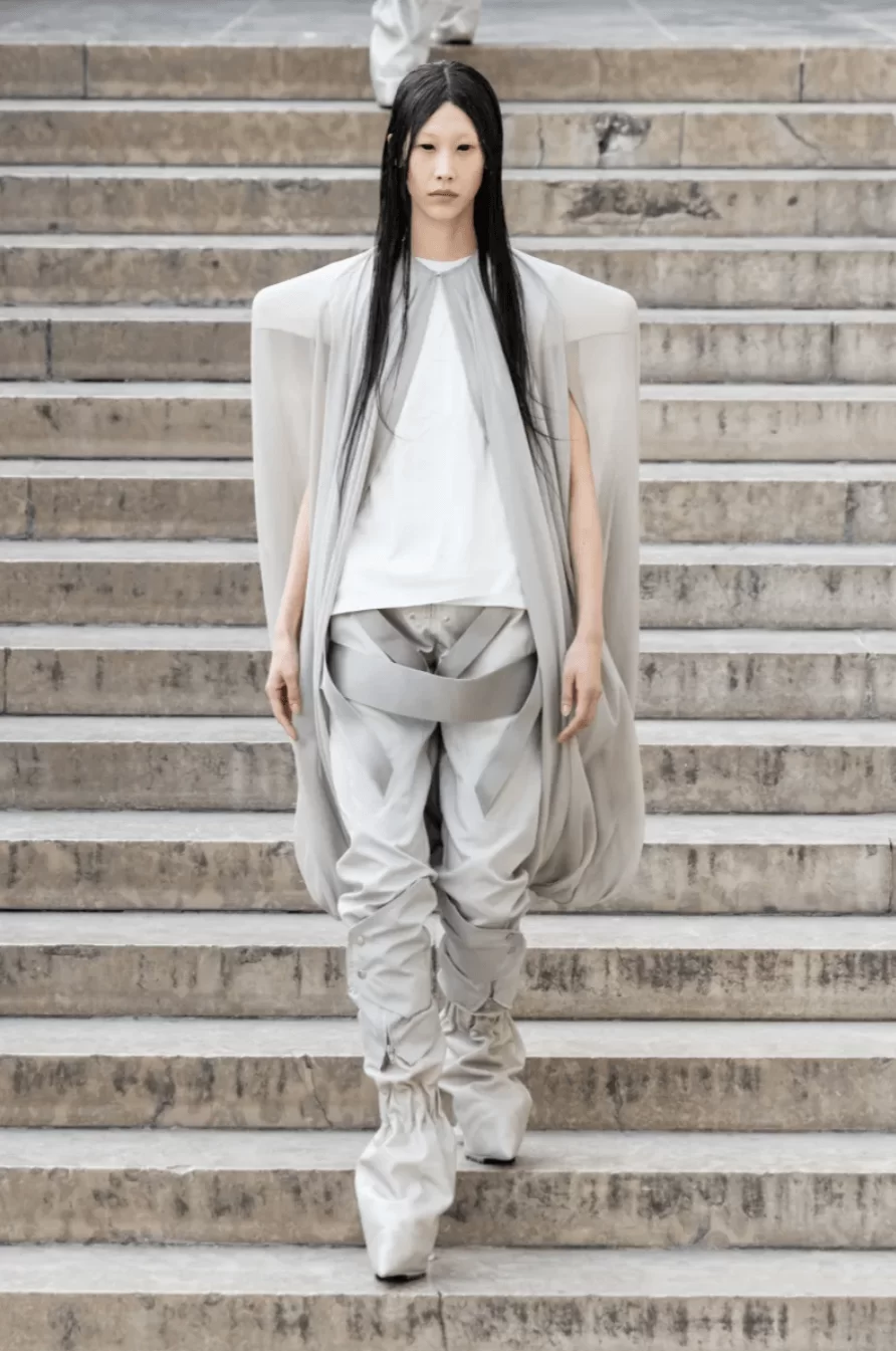 這場充滿視覺衝擊的大秀既像是一場神秘的宗教儀式,也像是一次堅韌的前行——它不僅突破了傳統時裝秀的框架與模式,更是 RICK OWENS 在表達淨化、重生與擁抱脆弱的行為藝術。