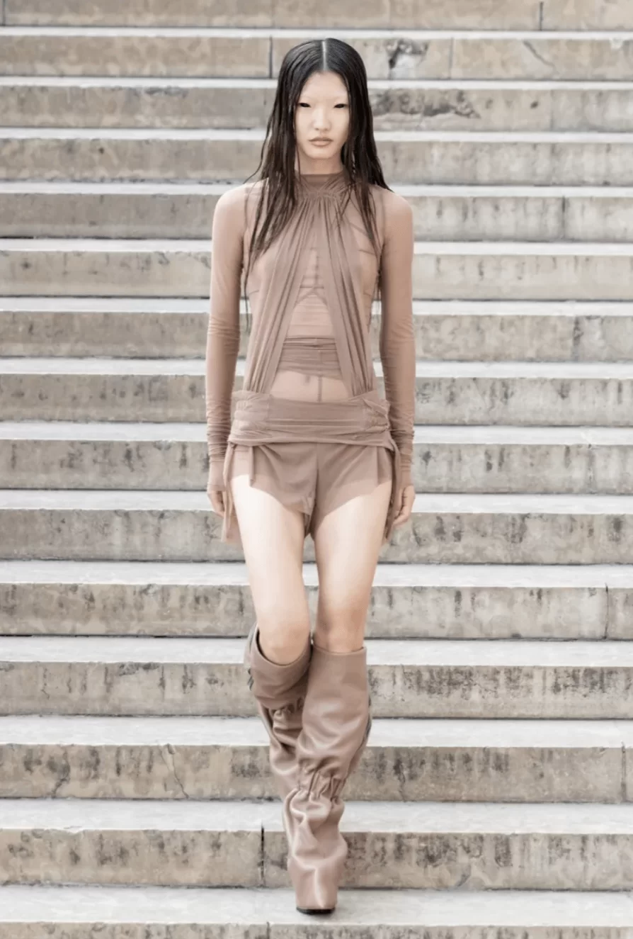 在 RICK OWENS 的 2026 春夏系列中,品牌巧妙地呼應了數月前在巴黎東京宮(PALAIS DE TOKYO)舉行的男裝大秀。此次時裝秀特別選擇在噴泉區上進行,模特兒們的雙腿直接浸入及膝深的水中,濕透的服裝隨著她們的步伐而舞動,傳遞出對終結、過渡與永恆之美的深刻思考。