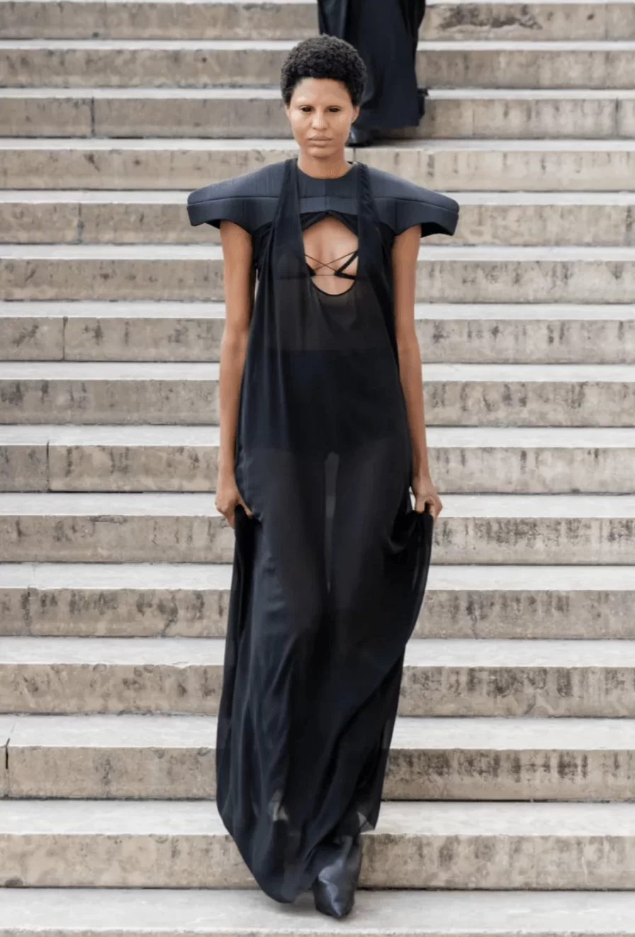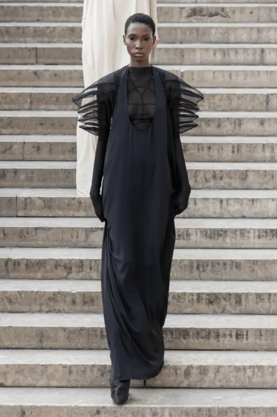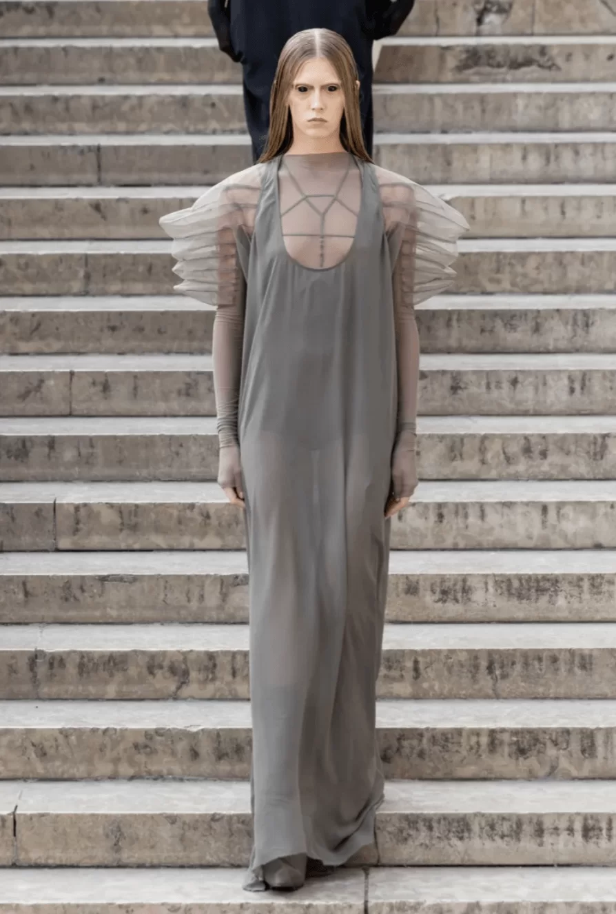 RICK OWENS 在此系列中,融合了他在過往所曾經打造的標誌性風格元素,包括 30 年代的纖細廓形、誇張的肩部設計、雕塑感十足的垂墜,特別的是,本系列更特意採用宛如透視網紗般的物料貫穿整個女裝系列,為其添上一份精緻柔美氣息。