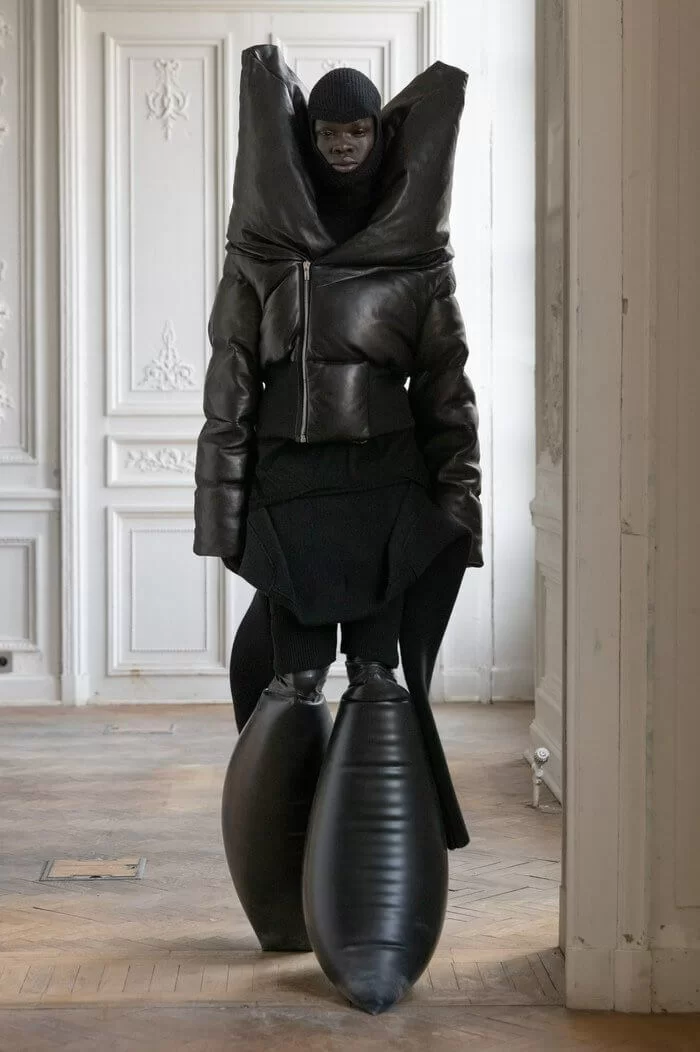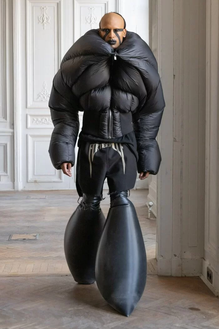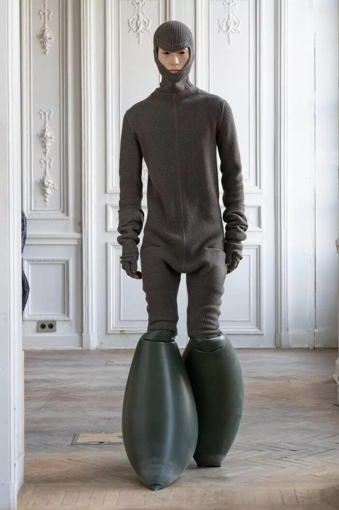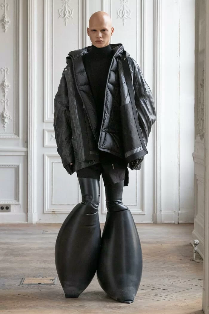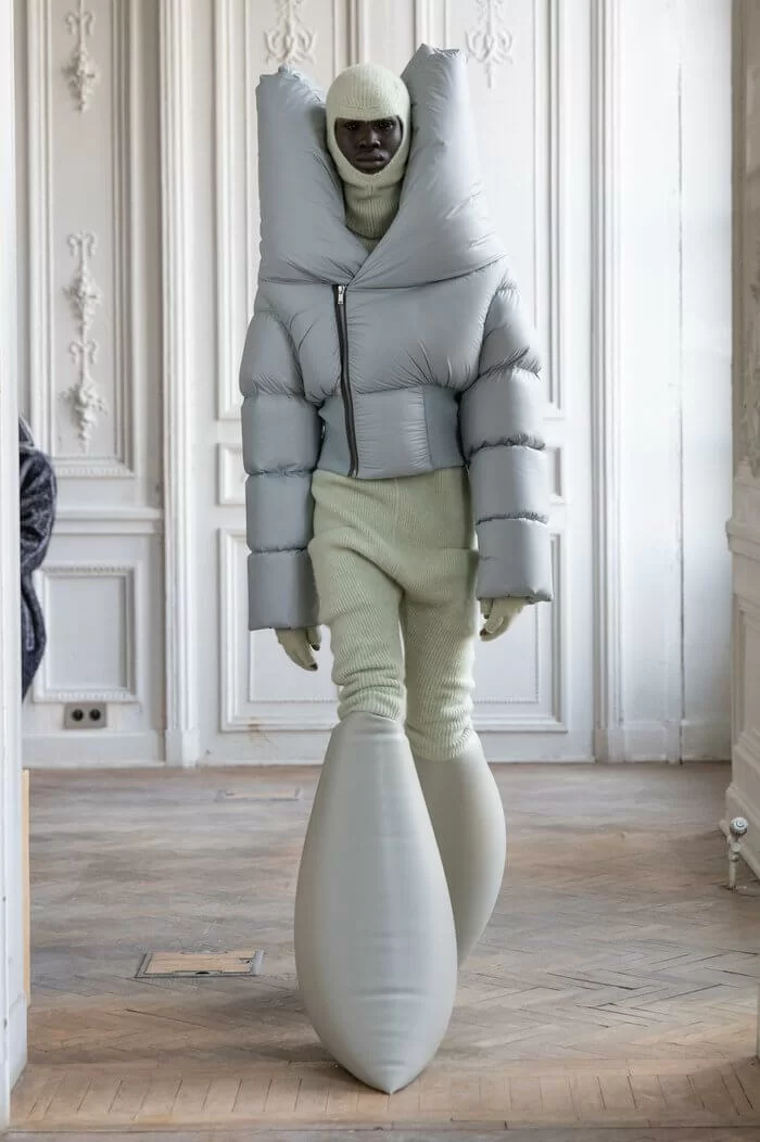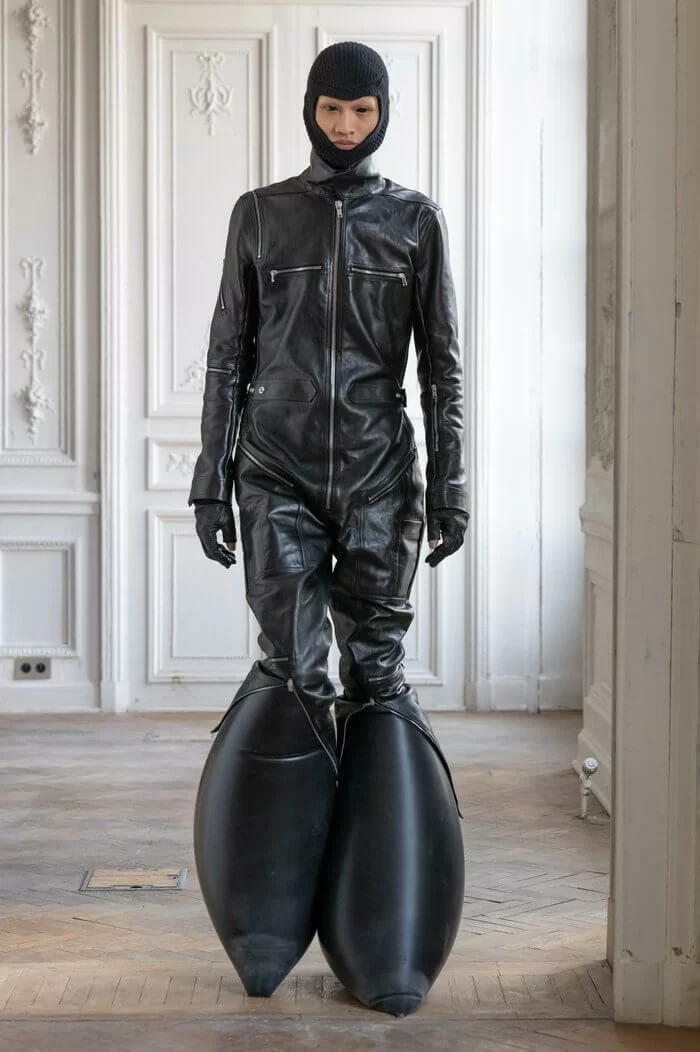大秀以品牌御用模特兒 TYRONE DYLAN 開場,赤裸上身,脖子僅戴著一條球狀項鍊,腰間掛著有一件針織衣物,袖子垂在身體兩側隨著步伐擺動,而此時觀眾所有的注意力都已被他腳下那雙氣球狀鞋子吸引住。該鞋款由 RICK OWENS 攜手倫敦設計師 STRAYTUKAY 打造,橡膠製成的充氣外觀從膝蓋位置向下延伸、膨脹,形成橢圓狀包裹著小腿,像似從外星入侵的奇行種,遊走在房中的不同空間,怪異十足。