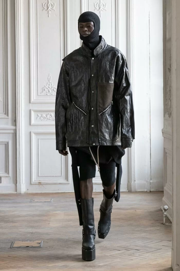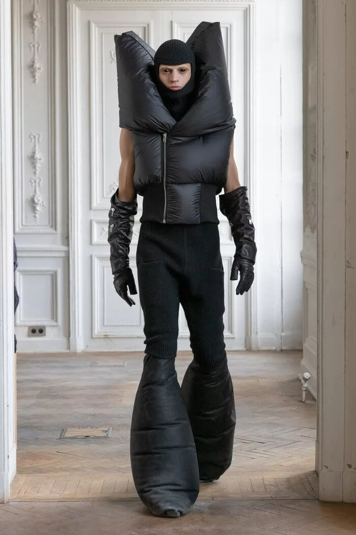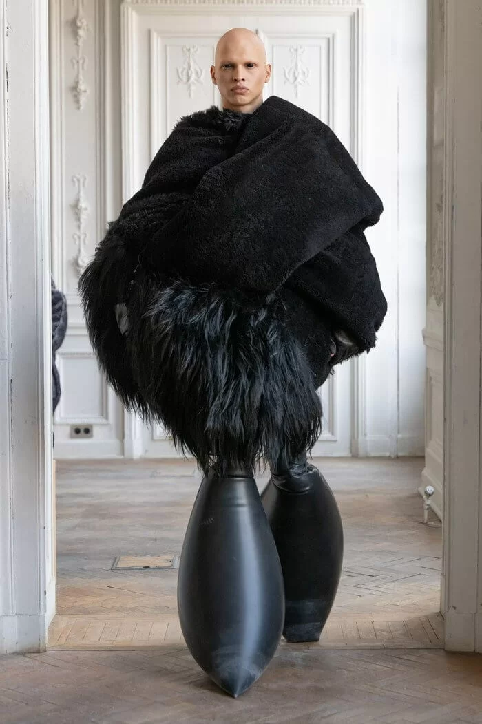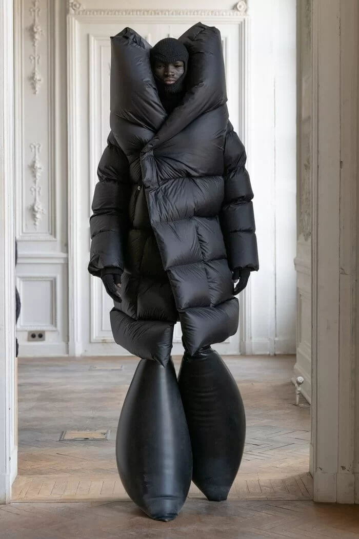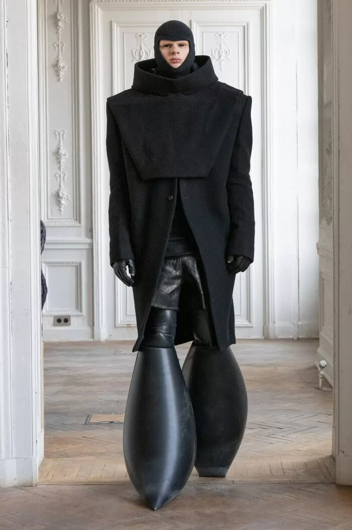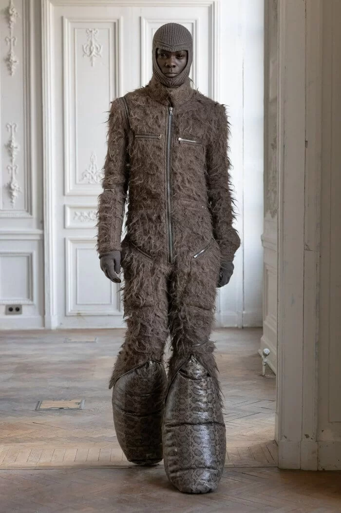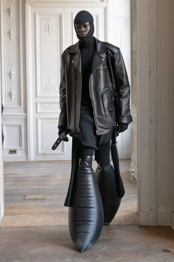 大秀以品牌御用模特兒 TYRONE DYLAN 開場,赤裸上身,脖子僅戴著一條球狀項鍊,腰間掛著有一件針織衣物,袖子垂在身體兩側隨著步伐擺動,而此時觀眾所有的注意力都已被他腳下那雙氣球狀鞋子吸引住。該鞋款由 RICK OWENS 攜手倫敦設計師 STRAYTUKAY 打造,橡膠製成的充氣外觀從膝蓋位置向下延伸、膨脹,形成橢圓狀包裹著小腿,像似從外星入侵的奇行種,遊走在房中的不同空間,怪異十足。