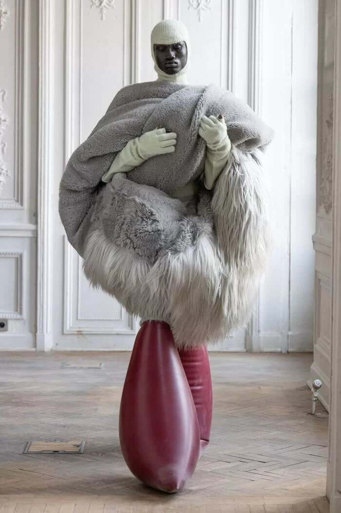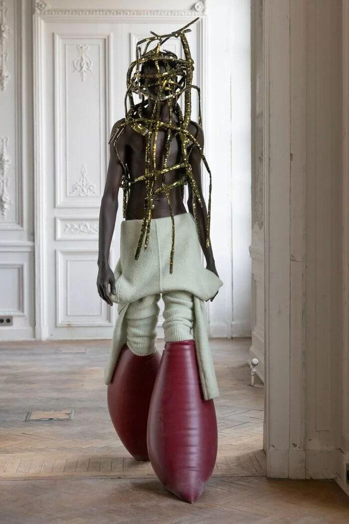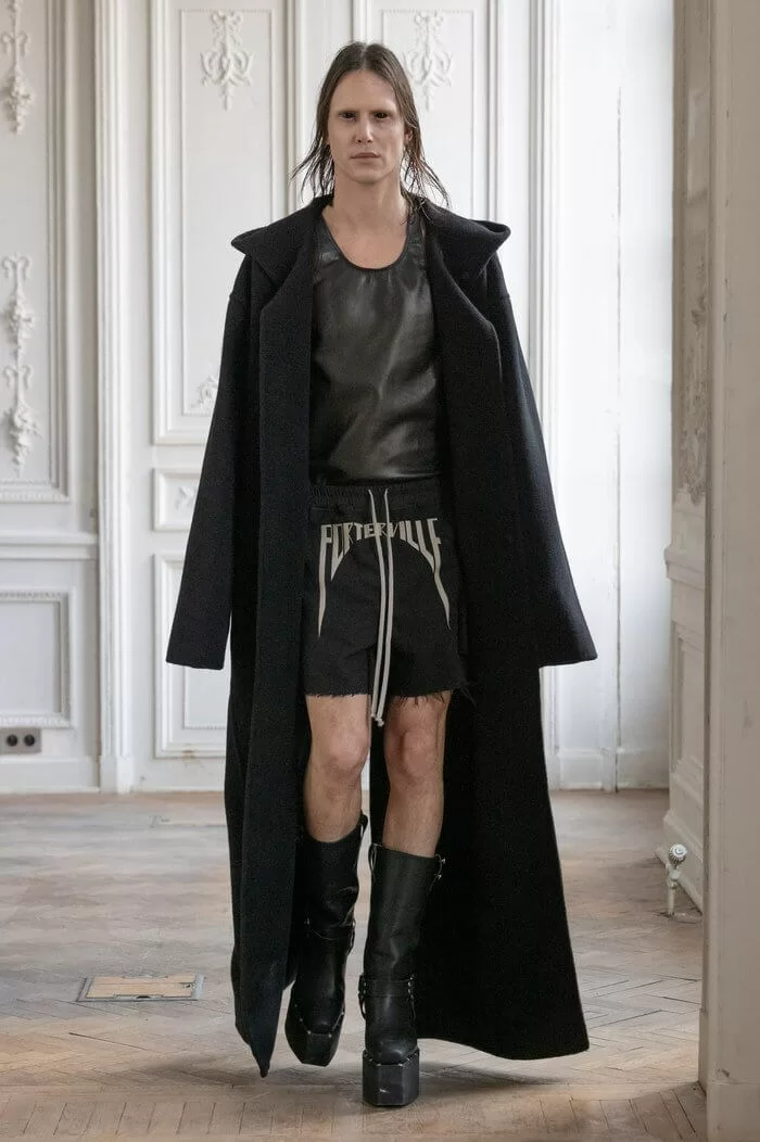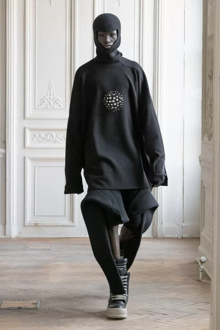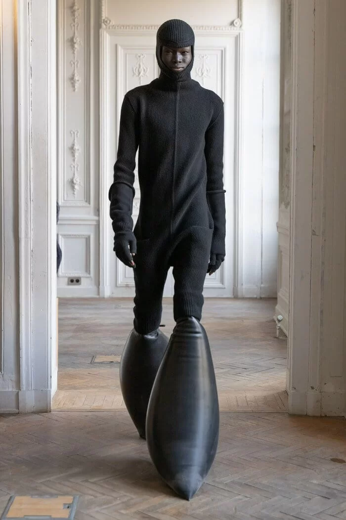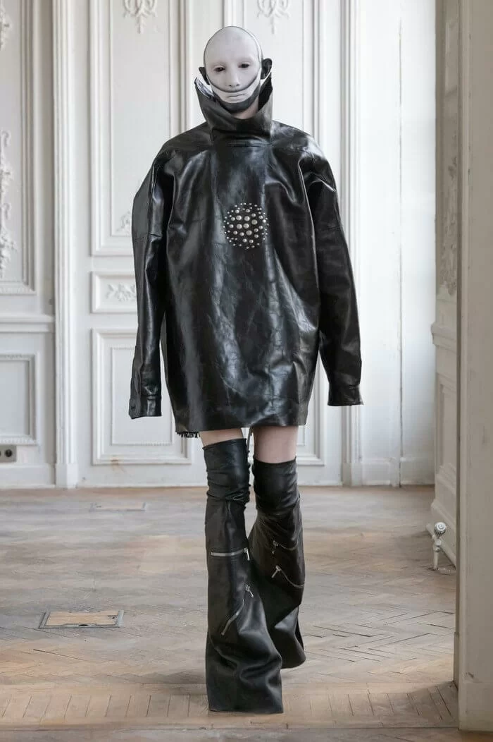 大秀以品牌御用模特兒 TYRONE DYLAN 開場,赤裸上身,脖子僅戴著一條球狀項鍊,腰間掛著有一件針織衣物,袖子垂在身體兩側隨著步伐擺動,而此時觀眾所有的注意力都已被他腳下那雙氣球狀鞋子吸引住。該鞋款由 RICK OWENS 攜手倫敦設計師 STRAYTUKAY 打造,橡膠製成的充氣外觀從膝蓋位置向下延伸、膨脹,形成橢圓狀包裹著小腿,像似從外星入侵的奇行種,遊走在房中的不同空間,怪異十足。