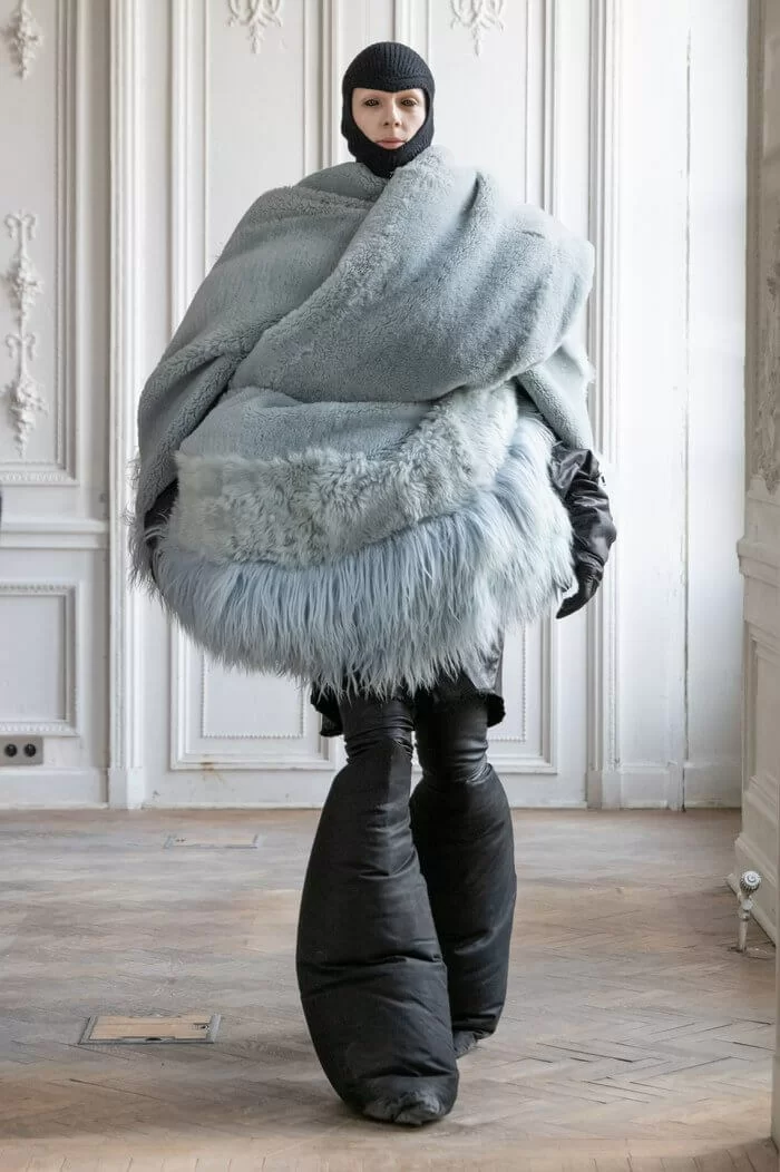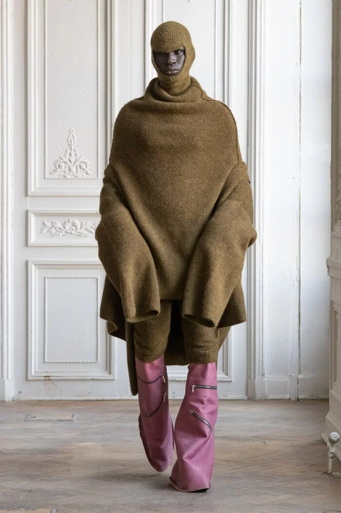 除此之外,RICK OWENS 還邀來英國設計師 LEO PROTHMAN 用綁帶皮革重新詮釋了品牌 KISS BOOTS 及法國設計師 MATISSE DI MAGGIO 回收廢棄單車輪胎製作而成的高領上衣和長褲。更有刻有 PORTERVILLE 字樣的變形針織上衣、帶有幾何縫線的三角立體羽絨外套、不規則纏繞身體的超大布料、做舊牛仔褲及超長毛絨斗篷等單品,透過浮誇廓形延續品牌一貫的設計語言。