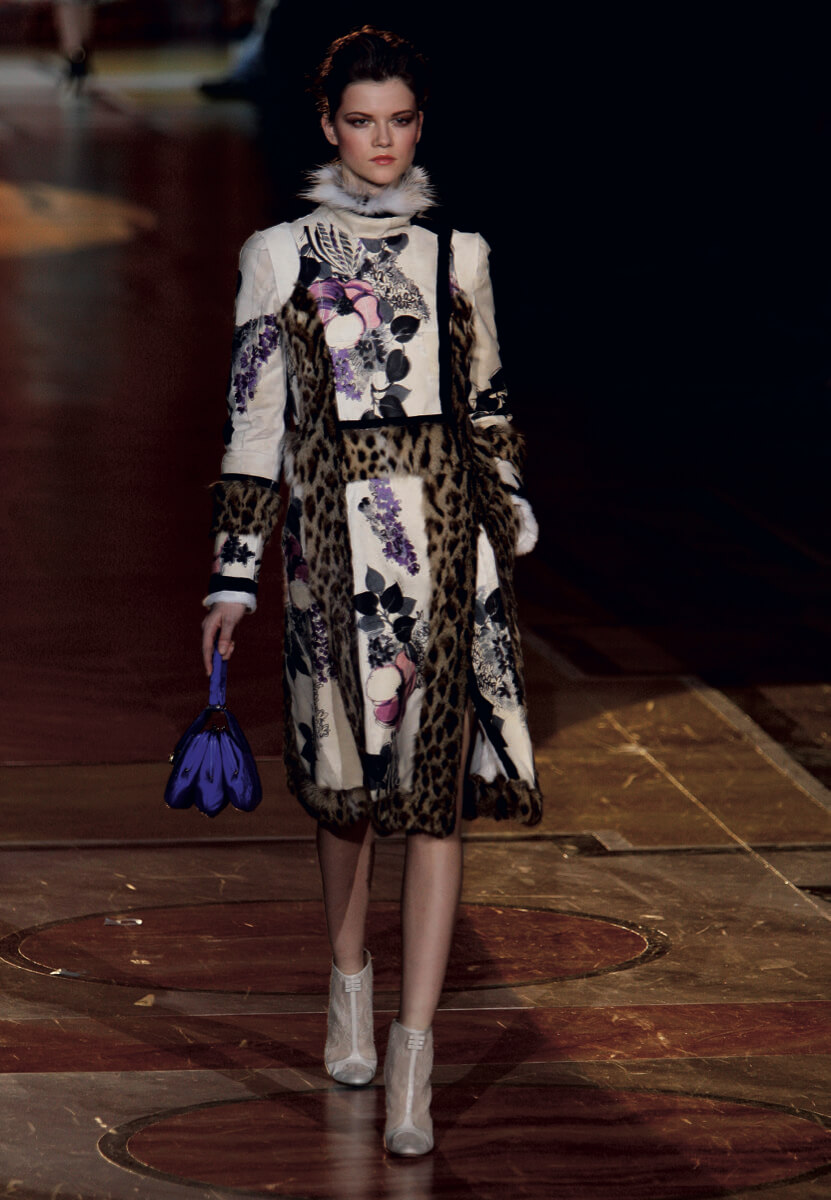 而 Cavalli 一向的標誌性設計元素―豹紋,亦與花卉圖案結合。臨完場時, Cavalli 還展示了一系列清雅的白色雪紡荷葉邊連身裙和維多利亞時代風格的晚裝裙,與 Cavalli 女裝一貫的野性美大相逕庭。