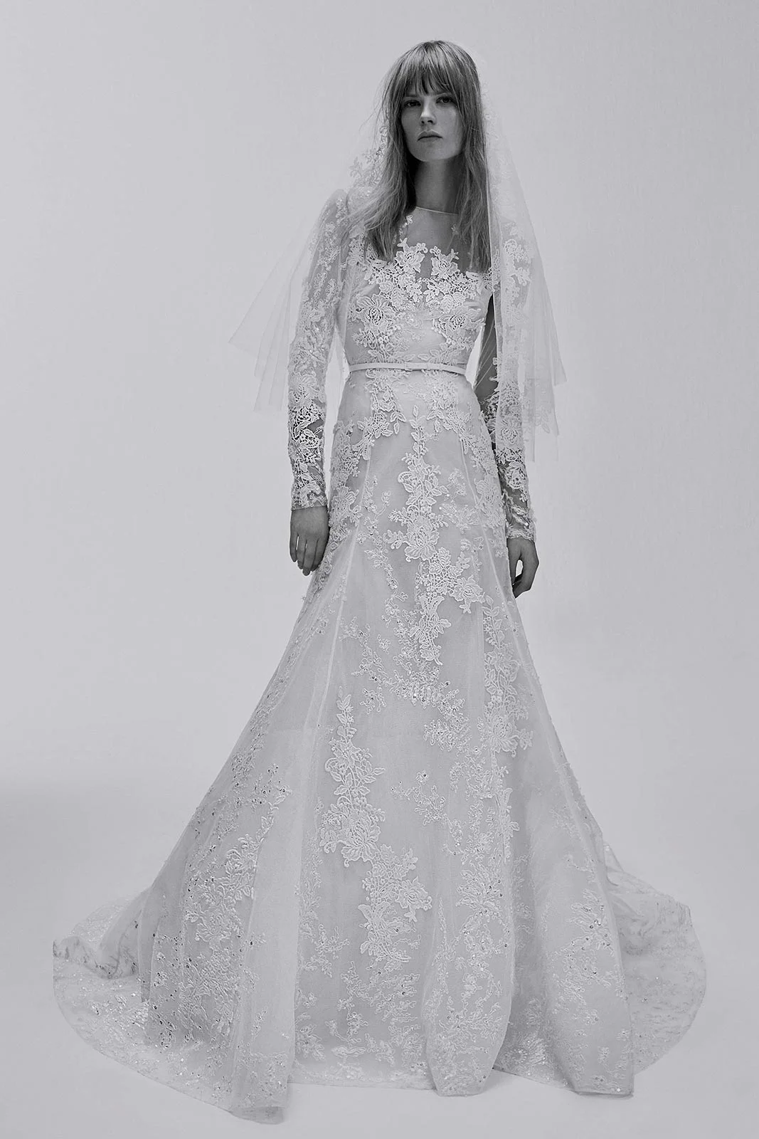 Rose Leslie大婚之日披着Elie Saab Bridal Spring 2017的設計行禮,修身剪裁配合了lace與透視面料,造型相當古典優雅,一頭短髮是點晴之處,能夠減去長袖婚紗的累贅感。