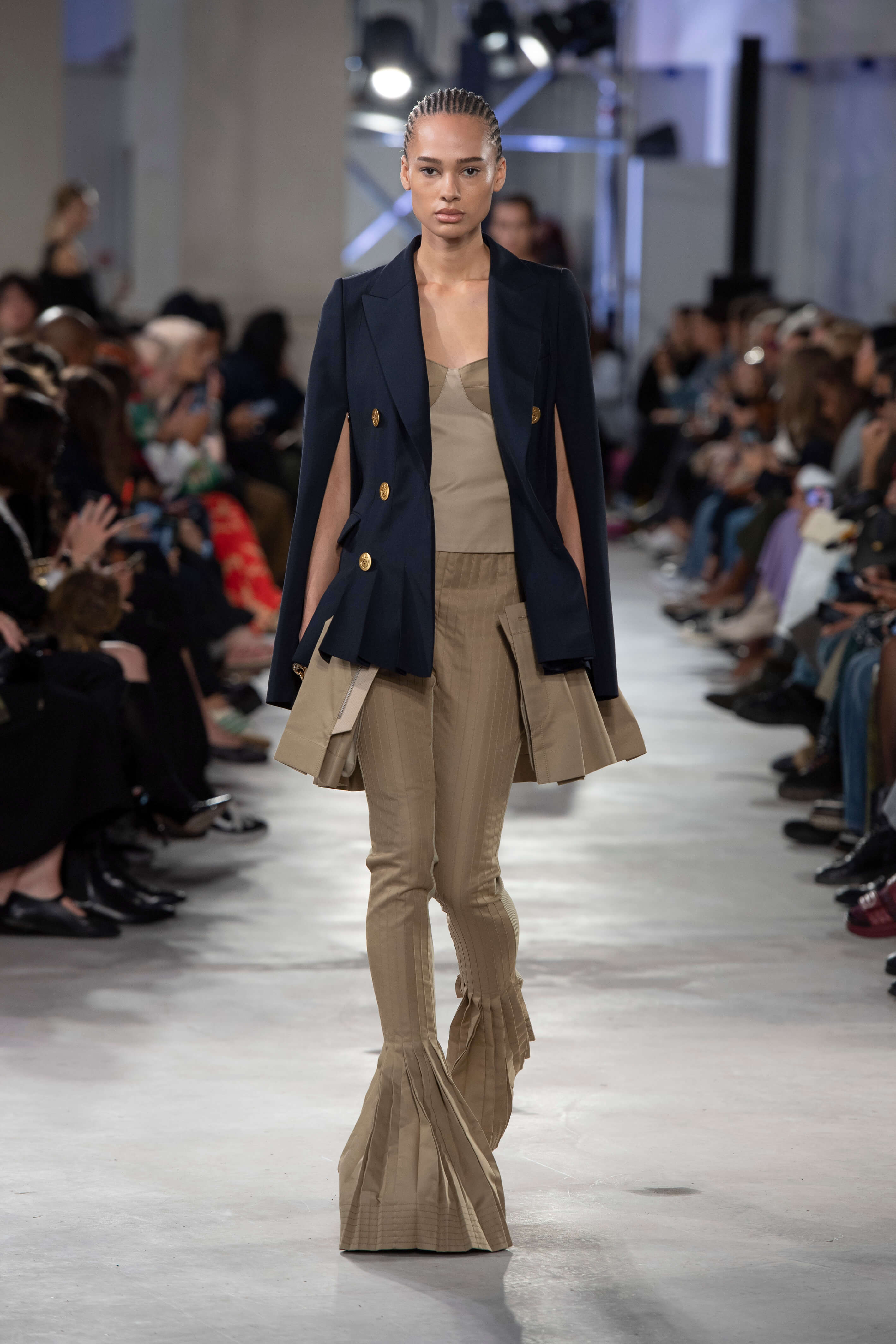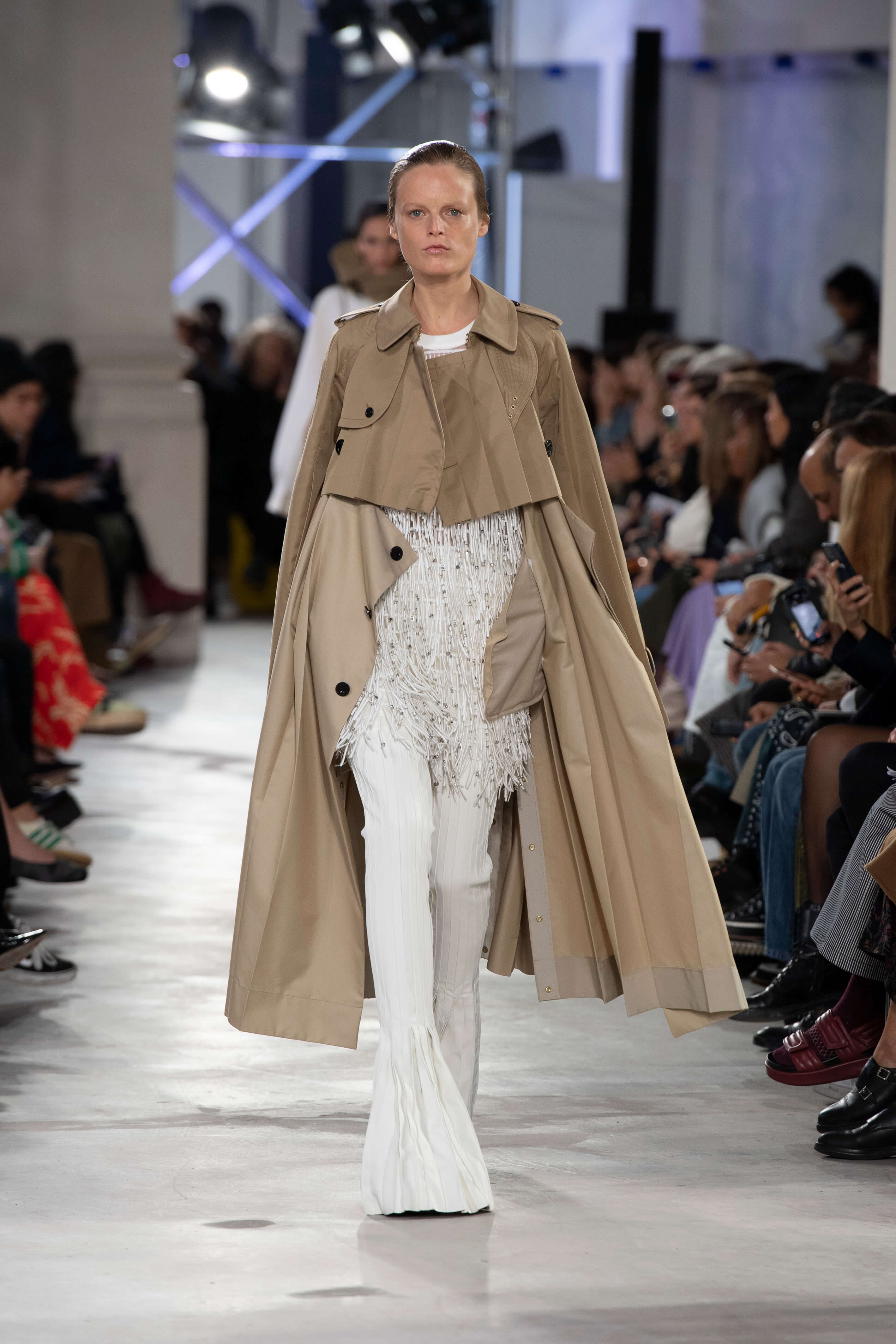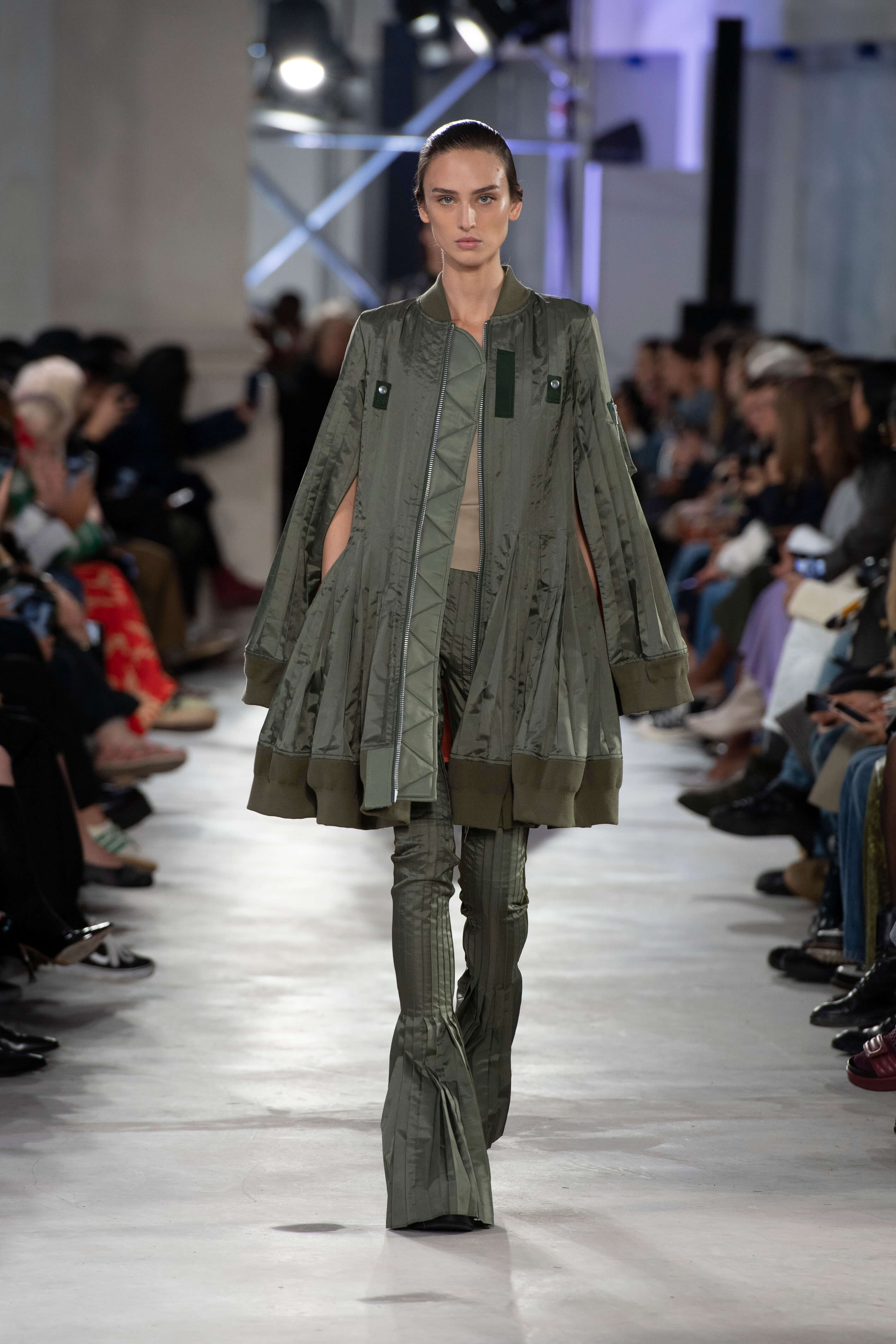 阿部千登勢長期以來設計師都專注於褶皺,而她對此主題的持續探索則成為本季系列的開端;褶皺及其結構的縝密和紀律,與這些褶皺在移動時彰顯的歡樂活力形成對比,同時象徵著力量和自由。她對褶皺狂熱應用於 SACAI 品牌版型——燕尾服、運動裝、風衣和 MA1外套,並由黑色禮服/ 白色襯衫組合開場,將其融合、打褶和拼接成一體;褶皺被縫合,然後打開成喇叭形,成為全新的標誌性褲型。