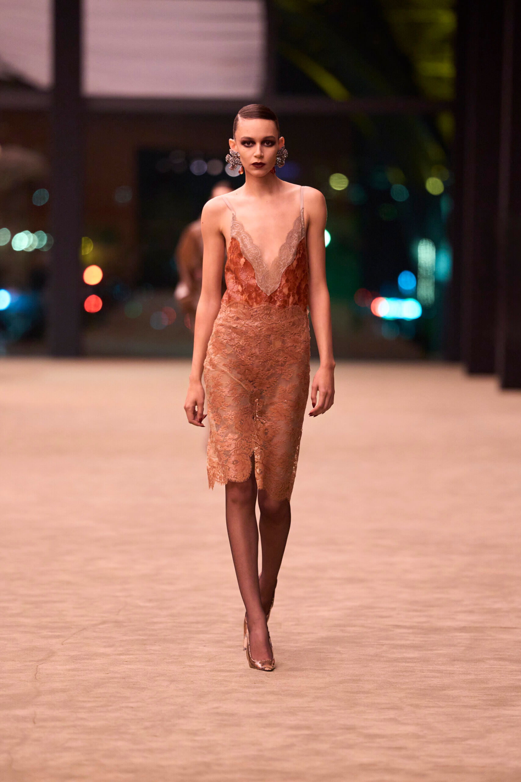 本季系列另一個核心設計則是蕾絲,ANTHONY VACCARELLO 透過乳膠硬化來賦予結構感,裁製成開襟的外套和直筒裙,甚至是幾乎透明的性感蕾絲吊帶裙,將女性的性感魅力表現得極致。