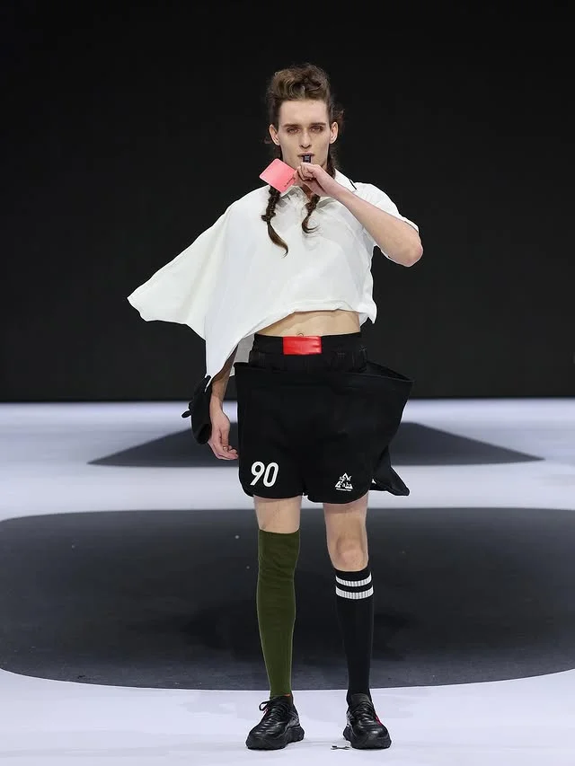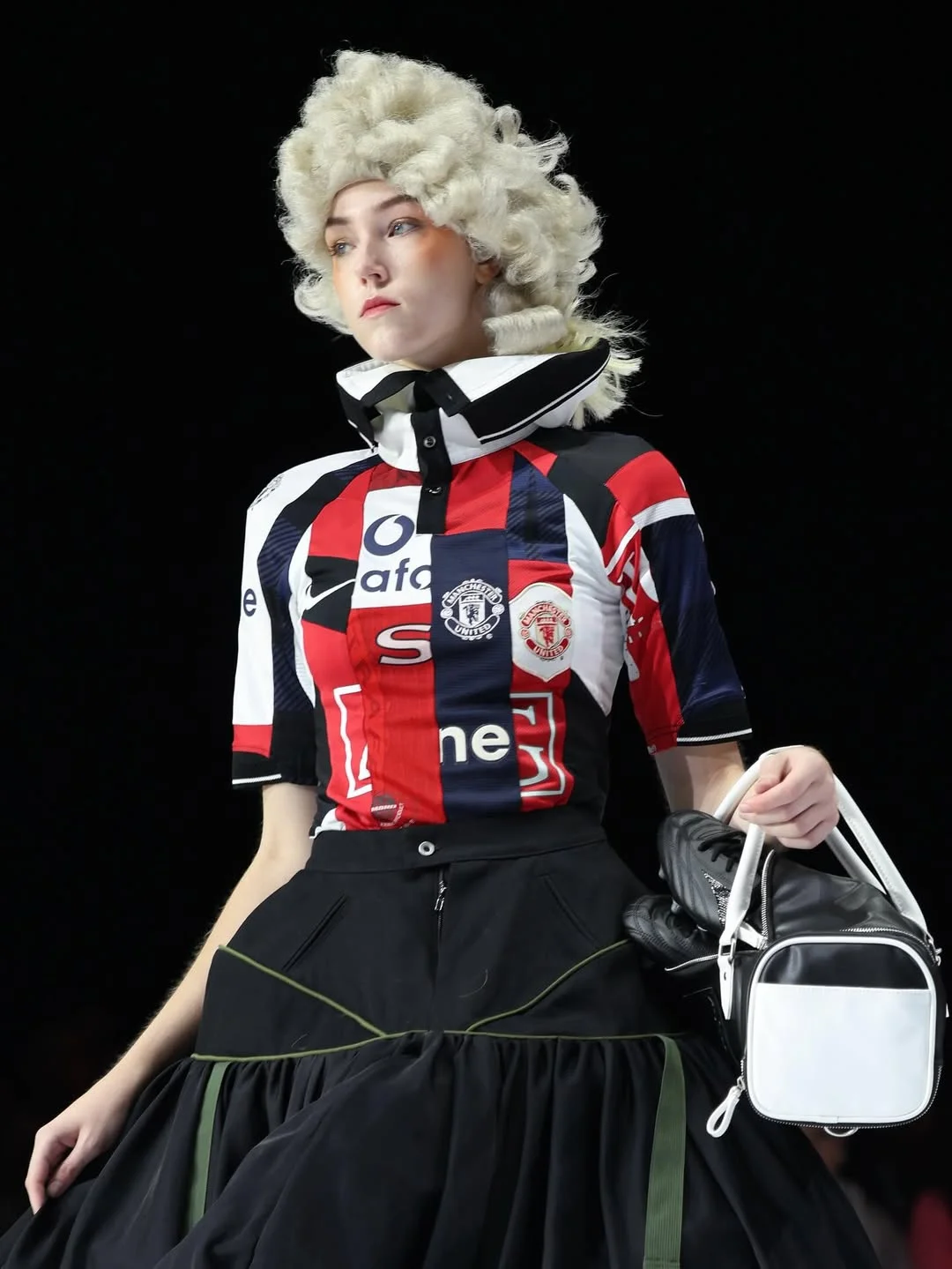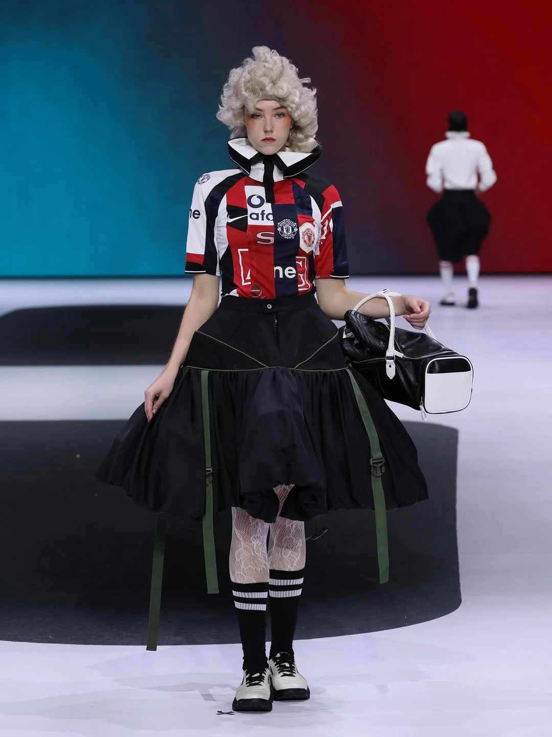 燈光漸漸亮起,音場交錯,首先映入眼簾的是一群年輕人自信地走出伸展台,展現他們整齊劃一的花式足球表演。隨後,模特兒們身著解構風格的球衣盔甲,步履之間彷彿踏著歷史與未來的交界,當維多利亞時期的優雅元素與街頭的張力相結合,美得令人屏息。
