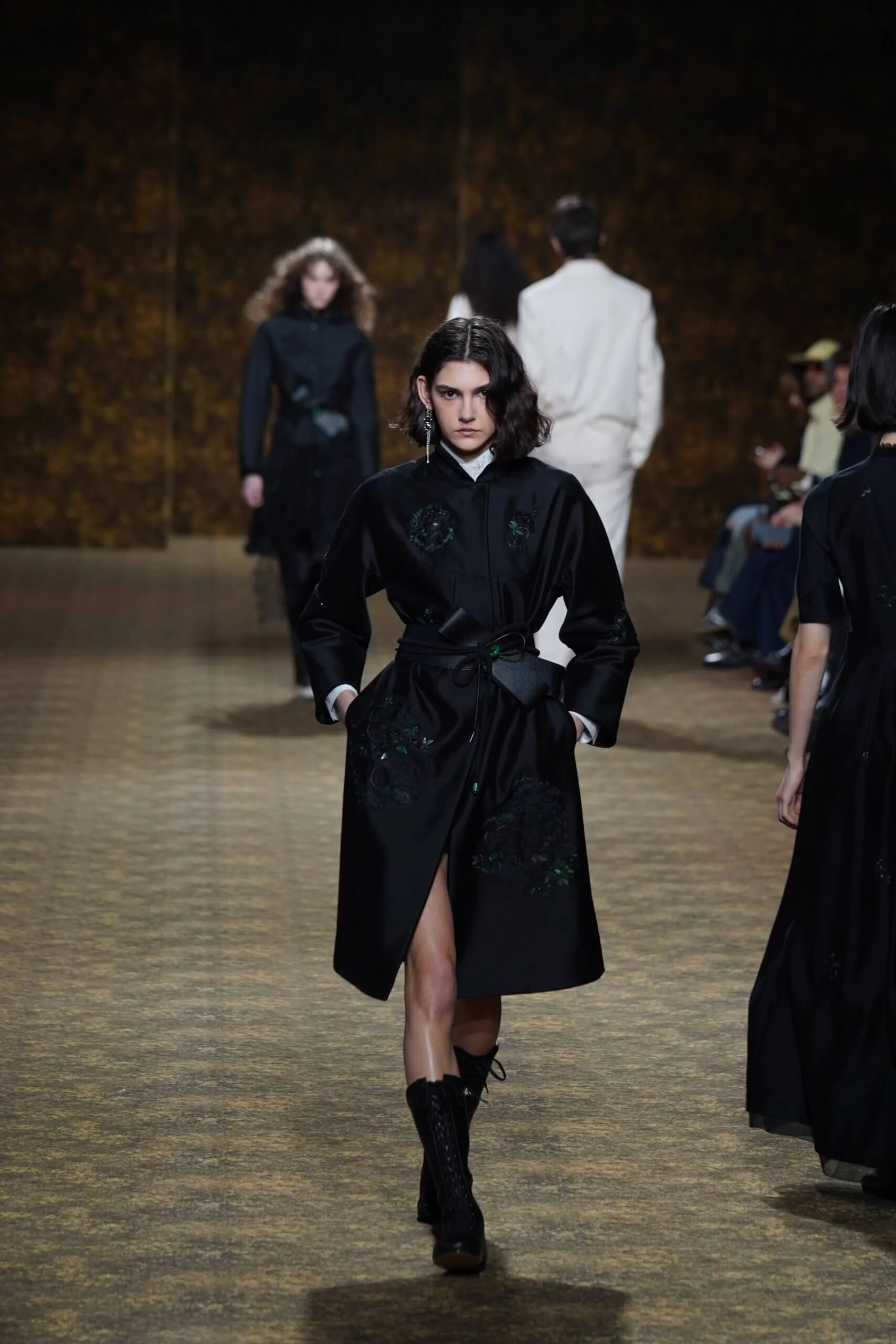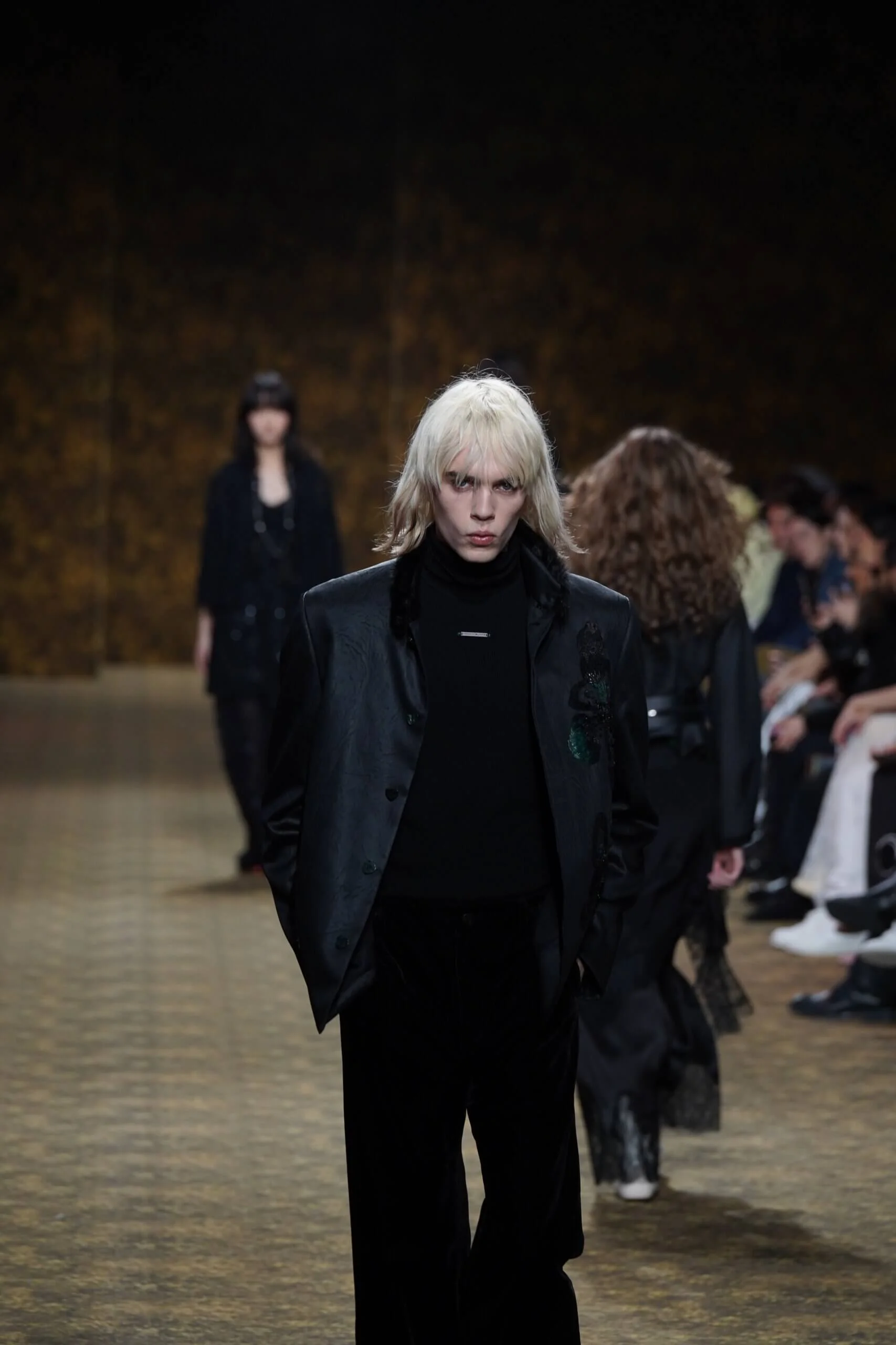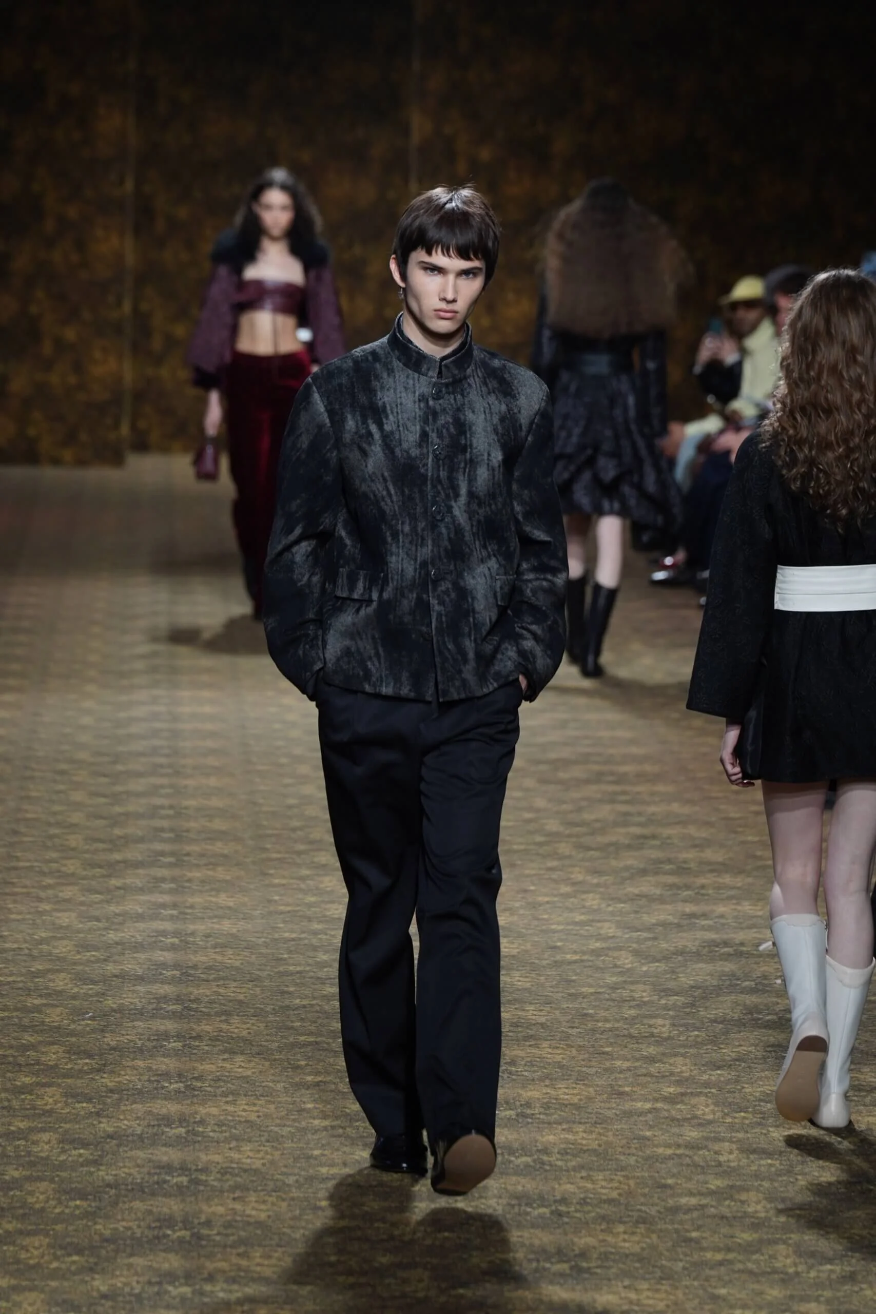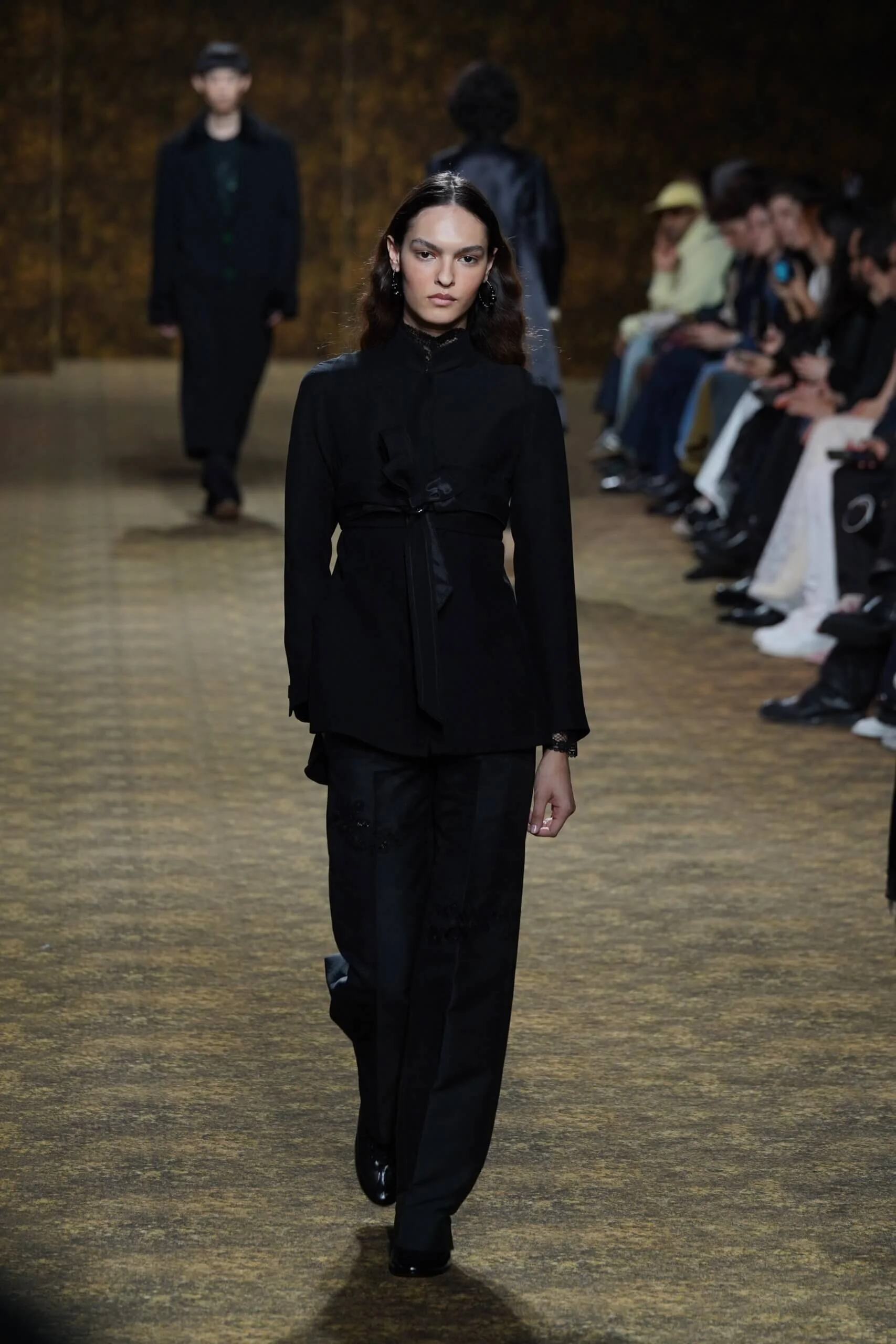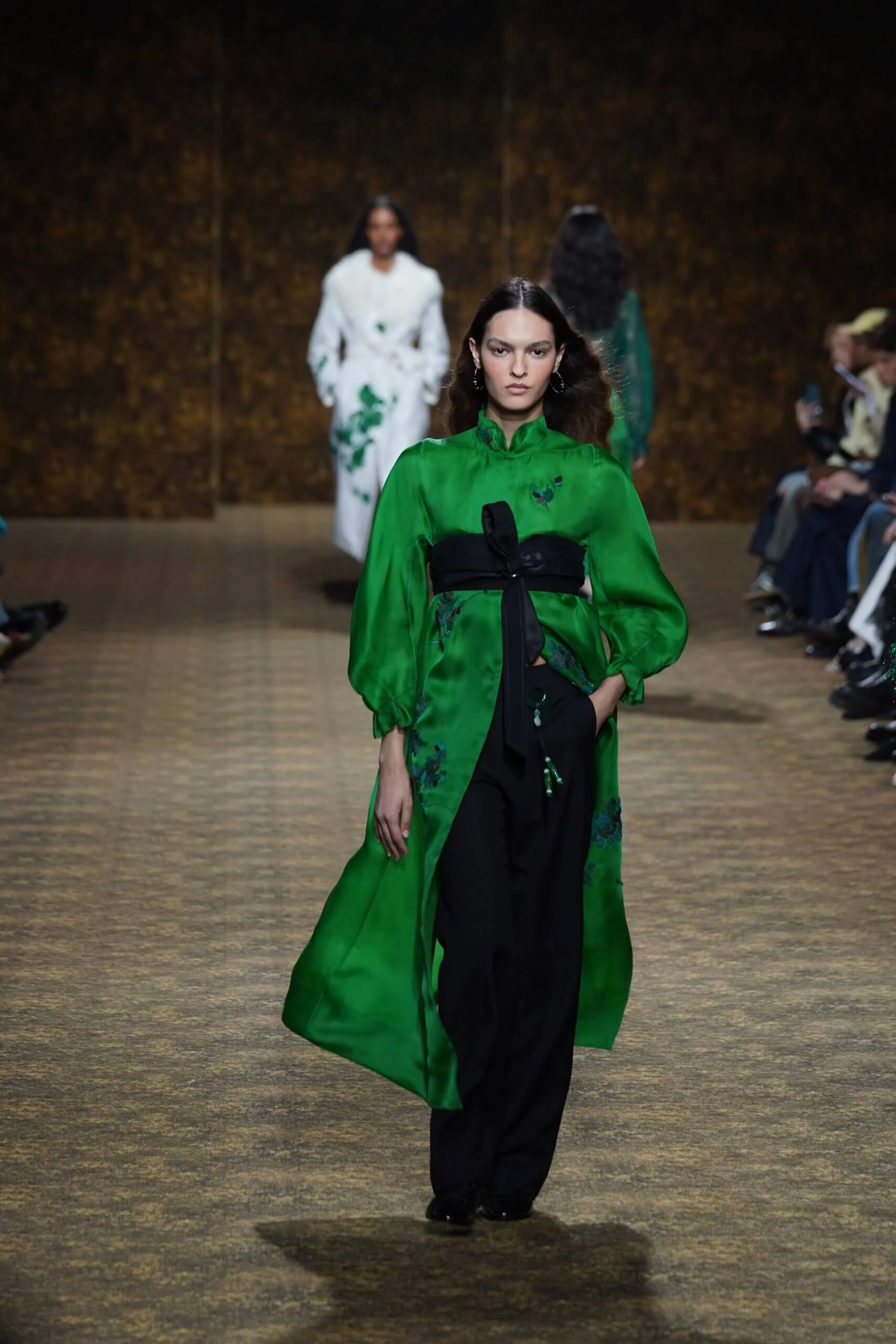 圖騰以山水、鹿紋與宮廷出遊為織錦意象;材質大幅出現金屬與翻毛,在冷暖間構築立體對比。男裝方面也不讓巾幗,延續了盛世的飽和能量,透過陰刻刺繡與仿舊處理讓時間在布料留下痕跡。西裝外繫腰封、方形連袖與中式鑲邊口袋,構築剛勁而內斂的細節,細小玉石裝飾與毛料點綴領口袖口,營造如壁畫般的質地,在歷史感與當代剪裁間取得精準平衡。