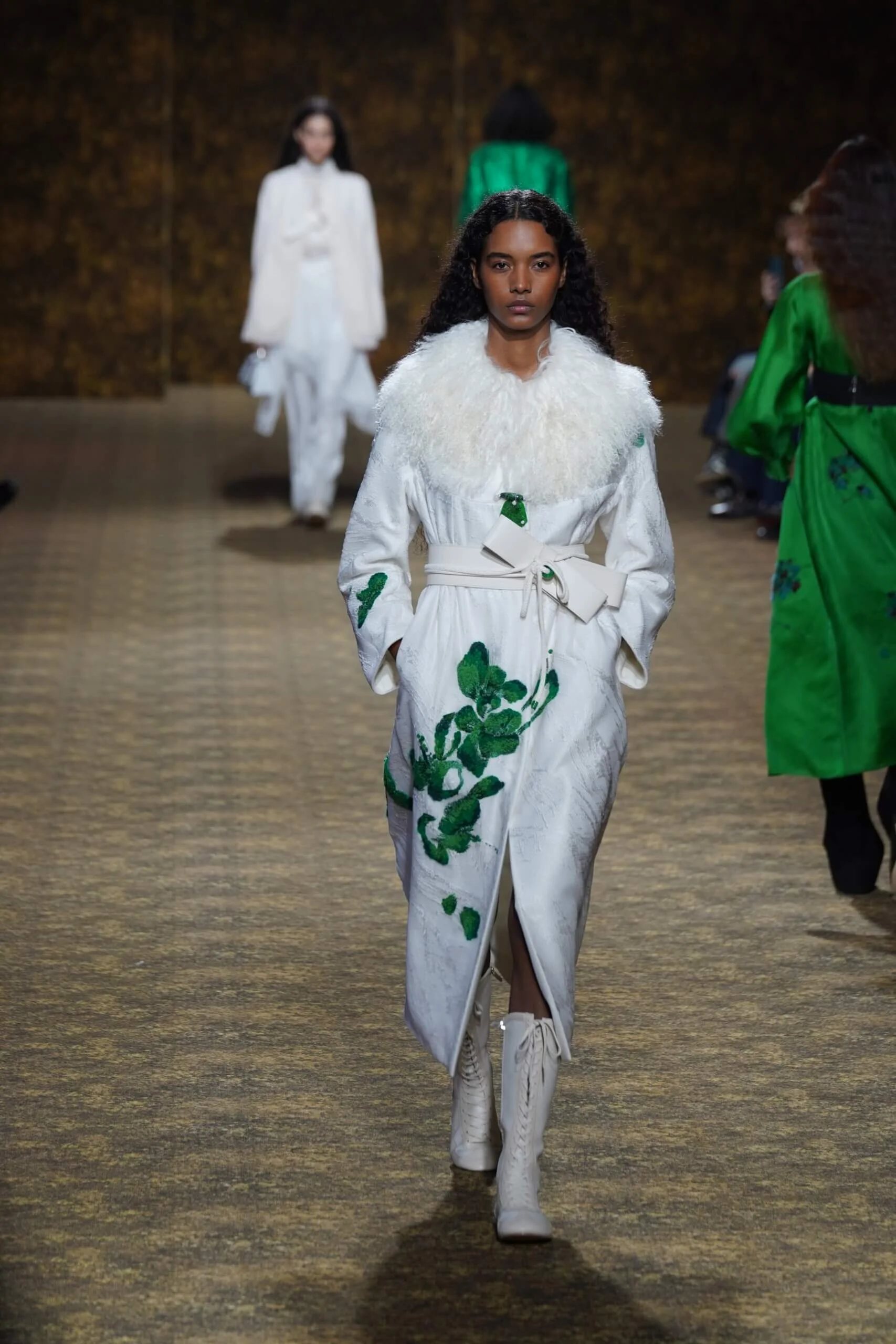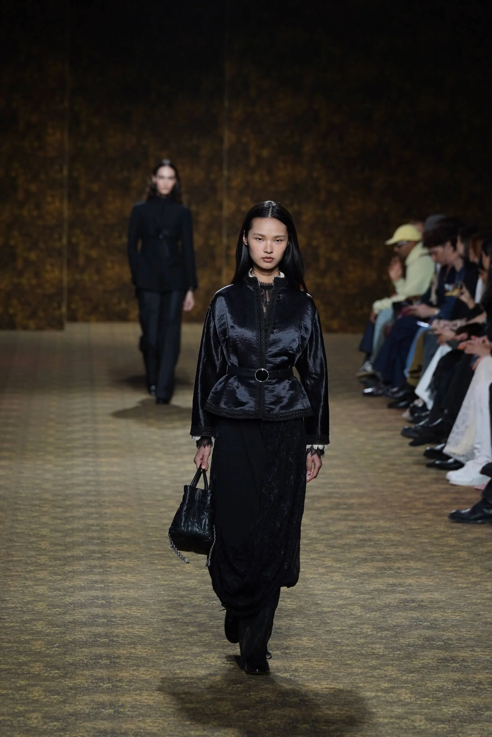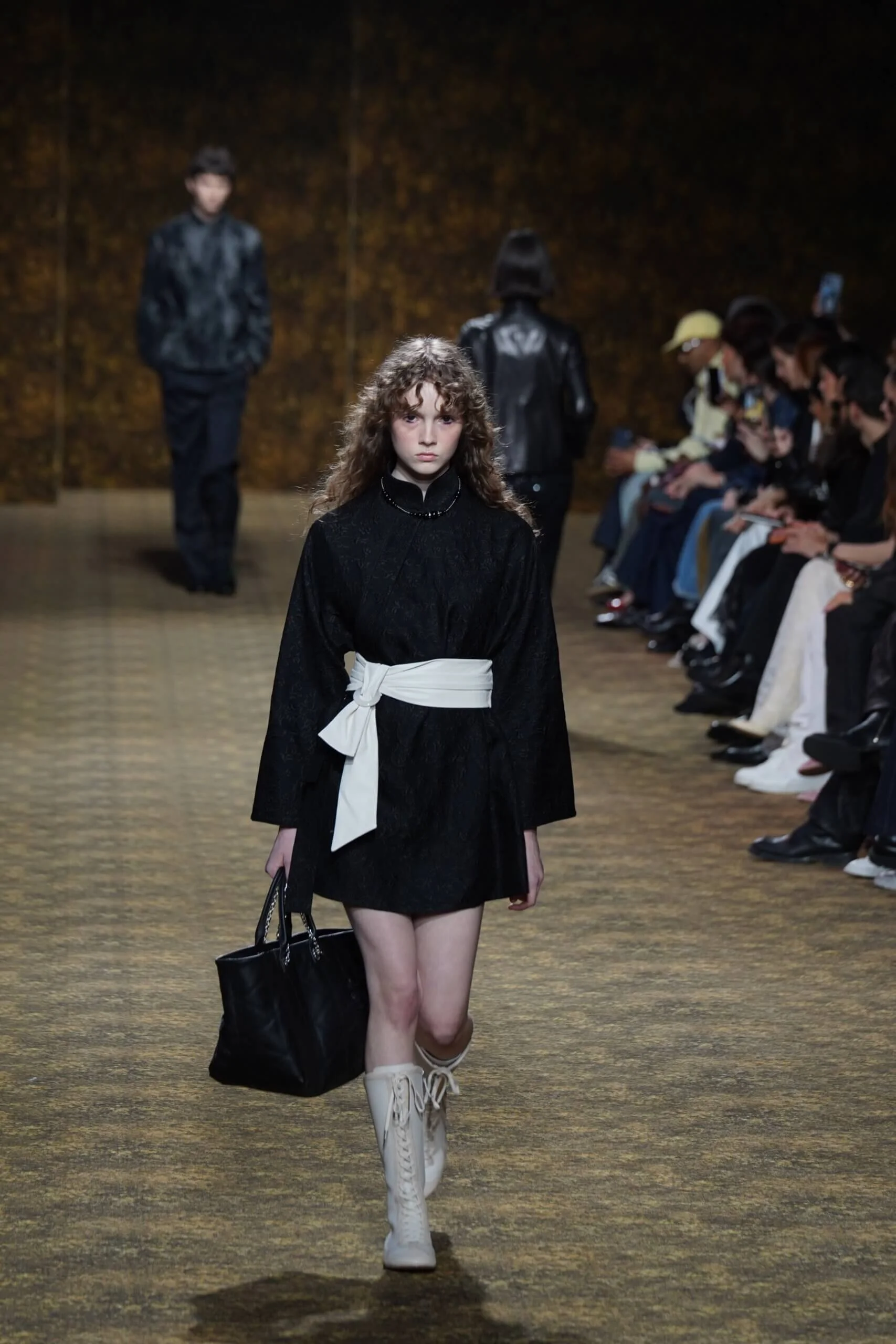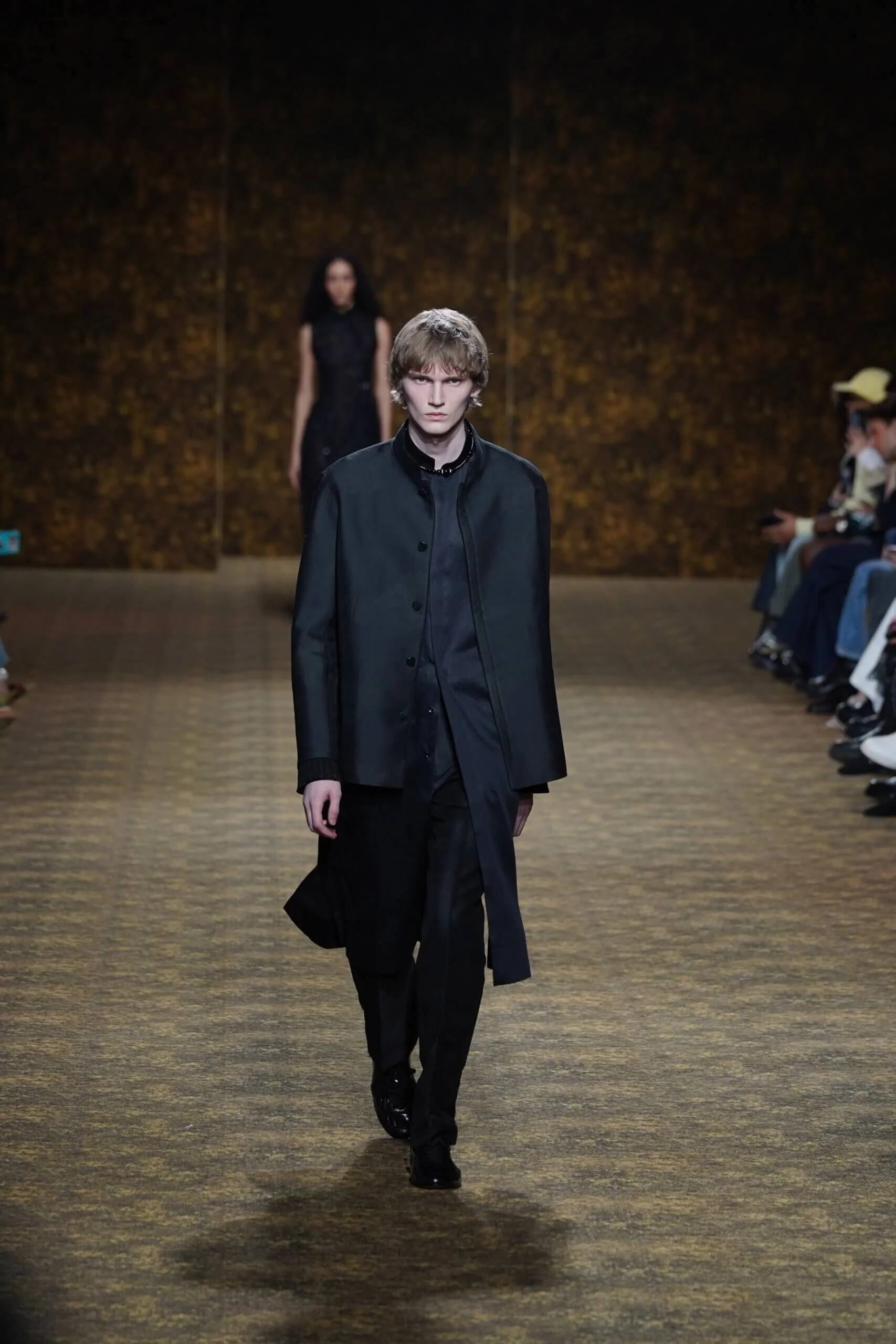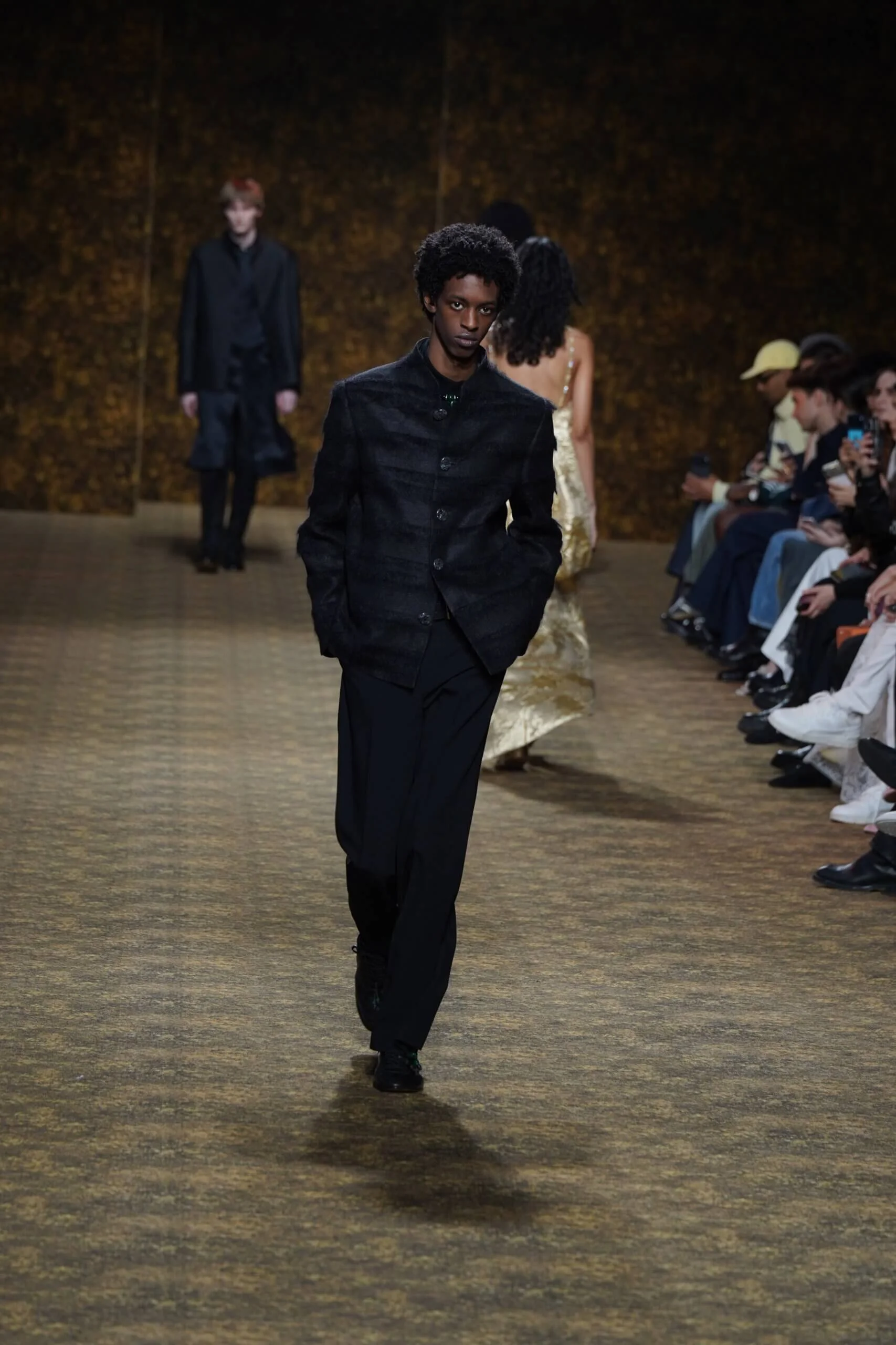圖騰以山水、鹿紋與宮廷出遊為織錦意象;材質大幅出現金屬與翻毛,在冷暖間構築立體對比。男裝方面也不讓巾幗,延續了盛世的飽和能量,透過陰刻刺繡與仿舊處理讓時間在布料留下痕跡。西裝外繫腰封、方形連袖與中式鑲邊口袋,構築剛勁而內斂的細節,細小玉石裝飾與毛料點綴領口袖口,營造如壁畫般的質地,在歷史感與當代剪裁間取得精準平衡。
