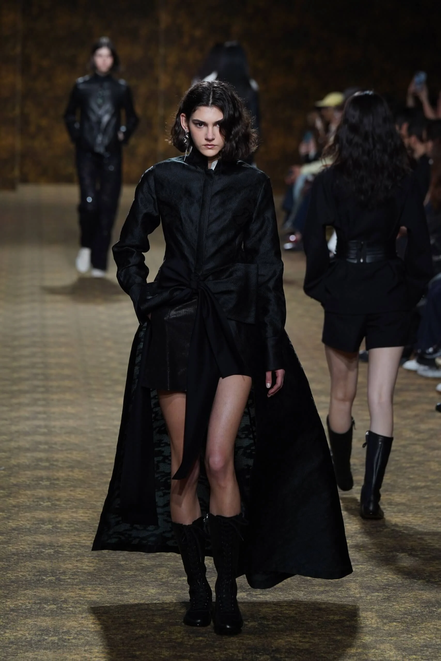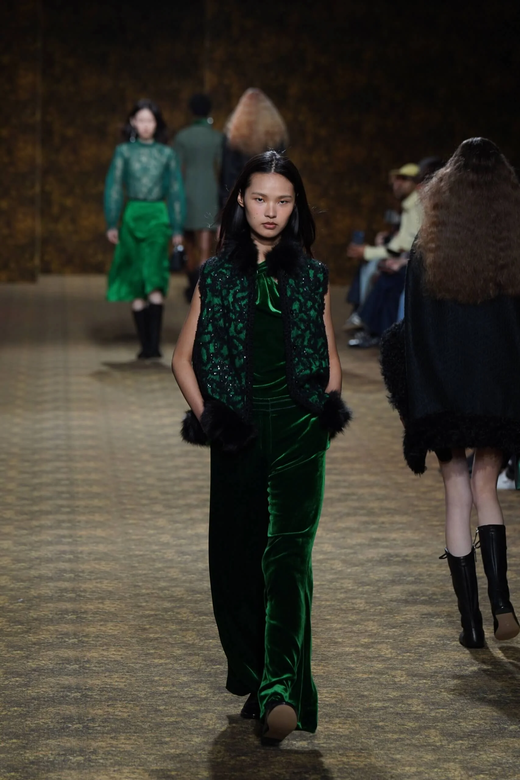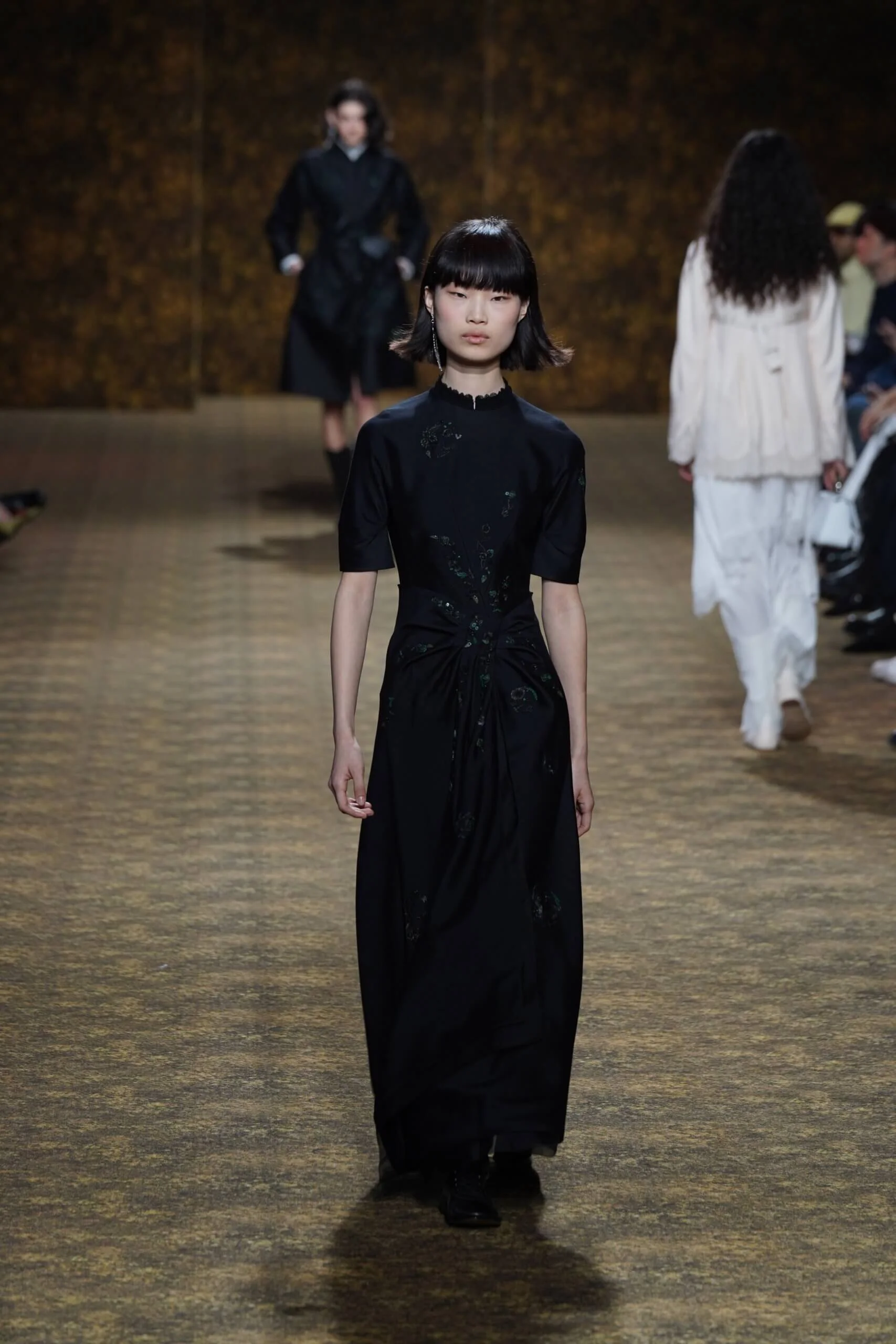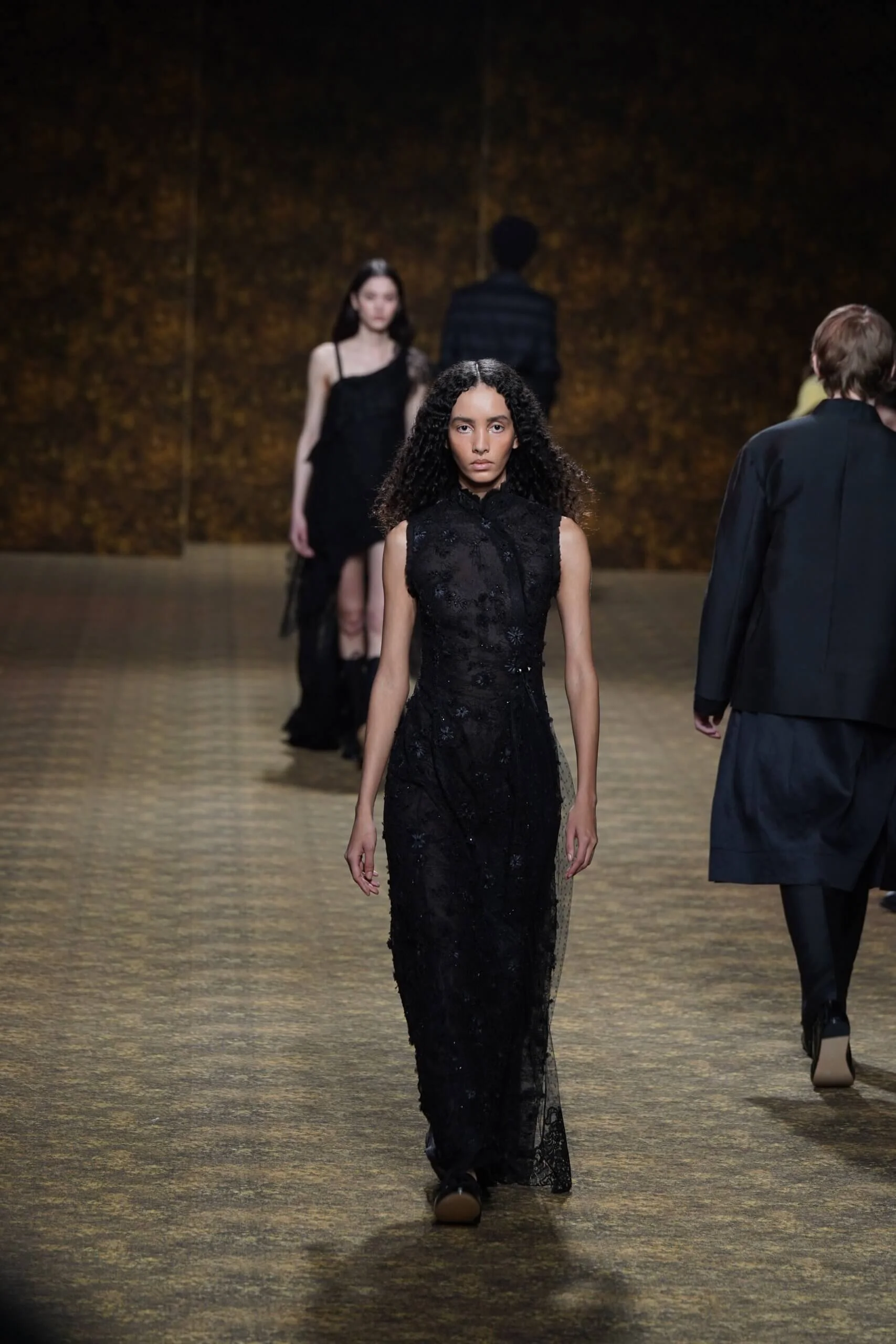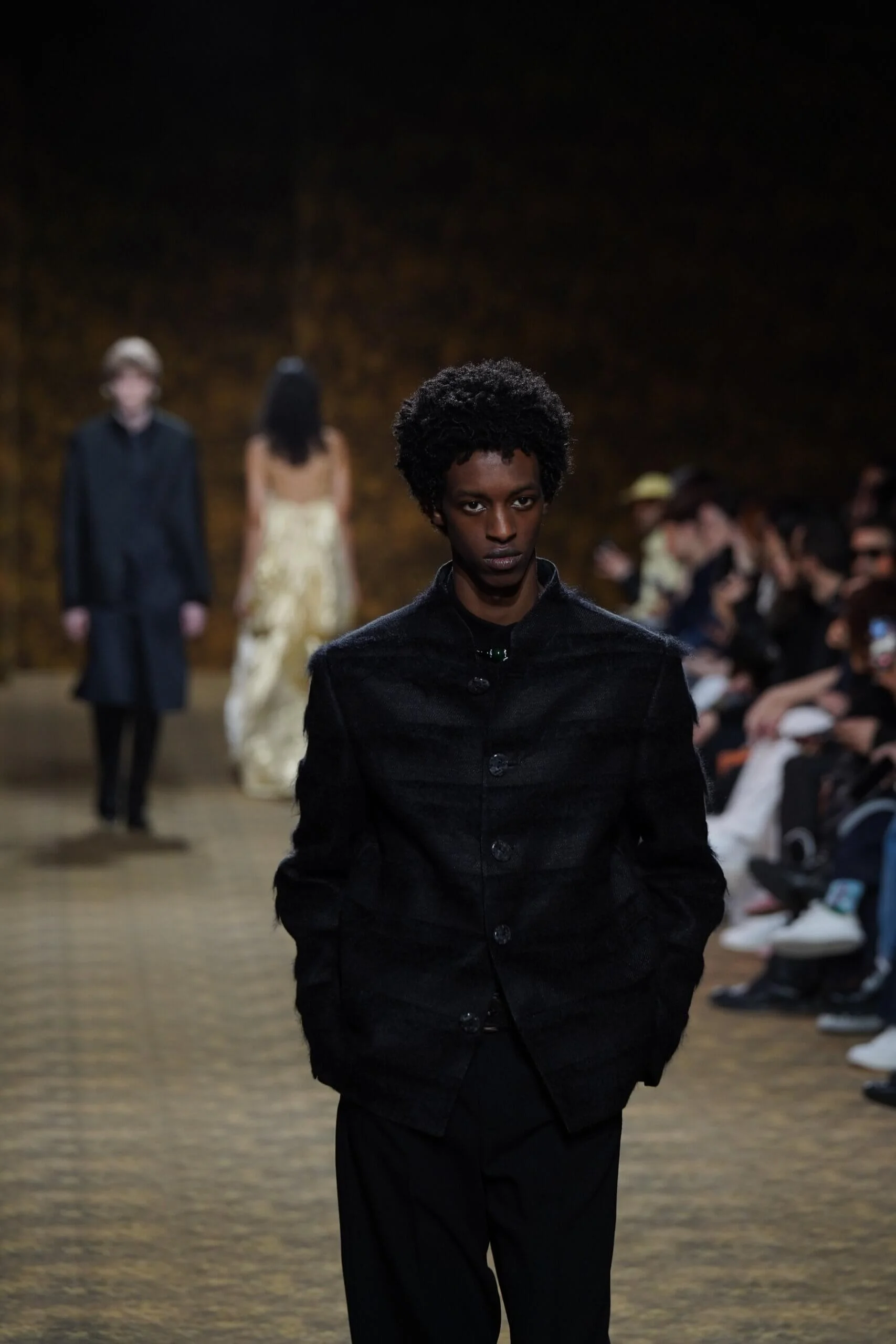 圖騰以山水、鹿紋與宮廷出遊為織錦意象;材質大幅出現金屬與翻毛,在冷暖間構築立體對比。男裝方面也不讓巾幗,延續了盛世的飽和能量,透過陰刻刺繡與仿舊處理讓時間在布料留下痕跡。西裝外繫腰封、方形連袖與中式鑲邊口袋,構築剛勁而內斂的細節,細小玉石裝飾與毛料點綴領口袖口,營造如壁畫般的質地,在歷史感與當代剪裁間取得精準平衡。