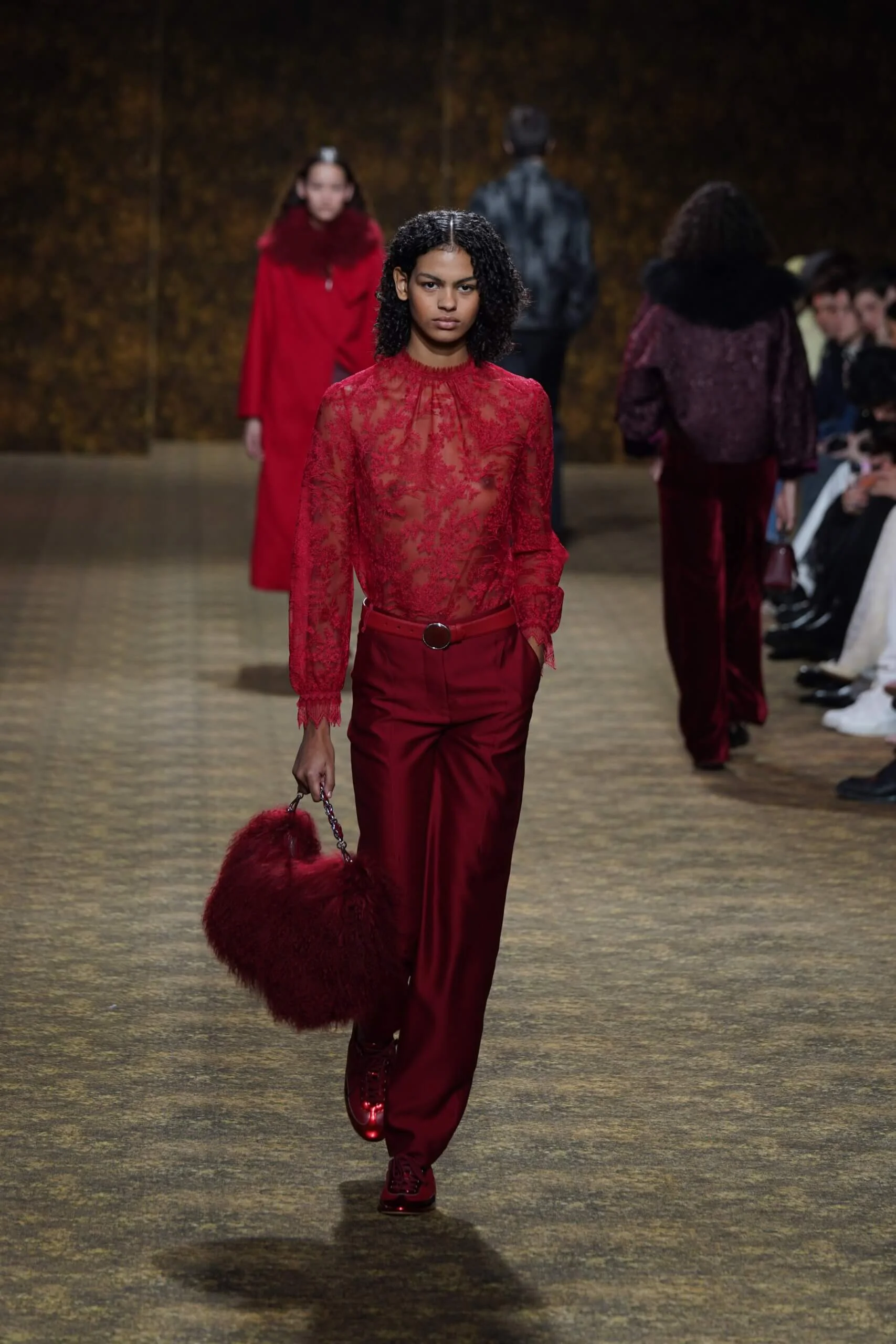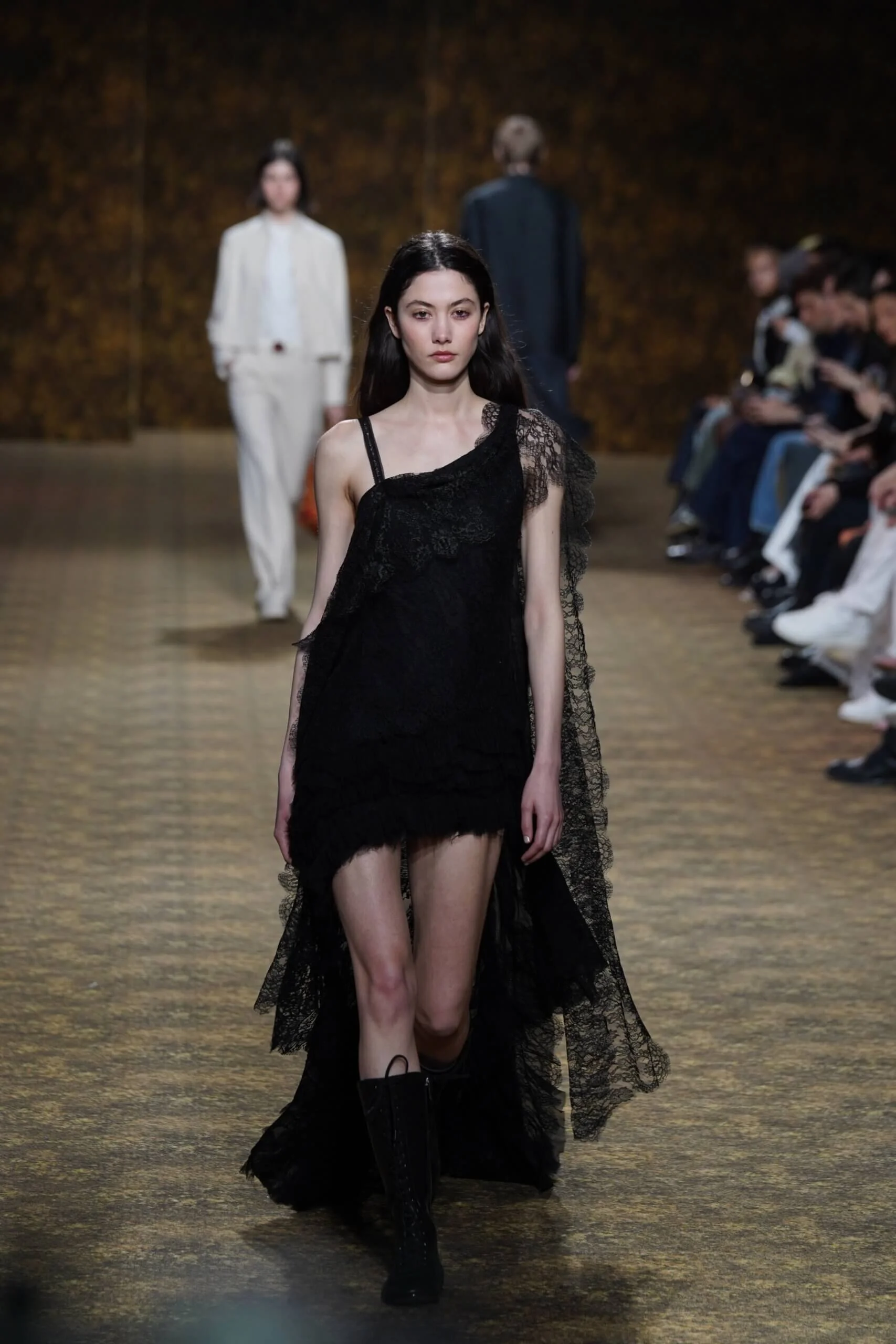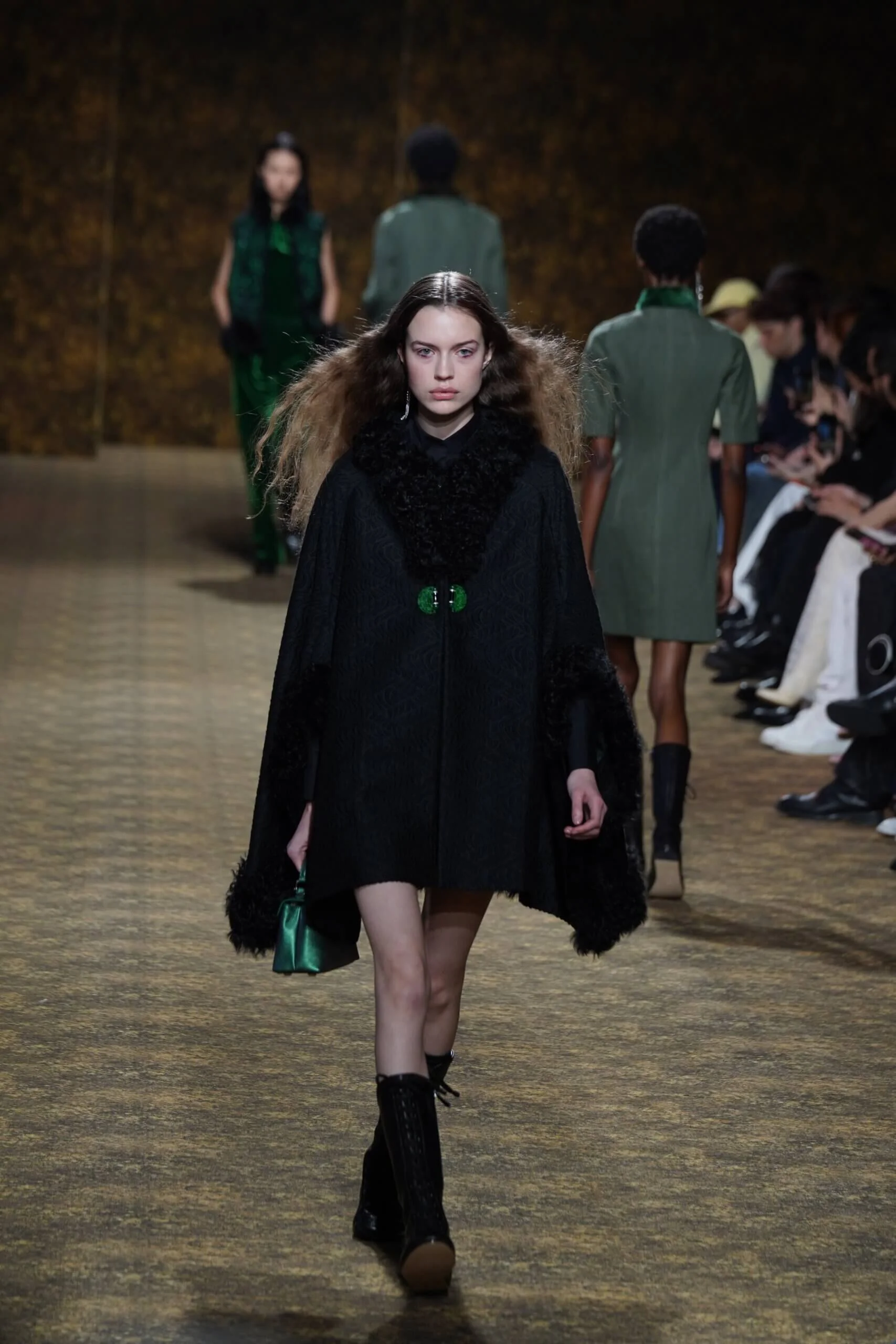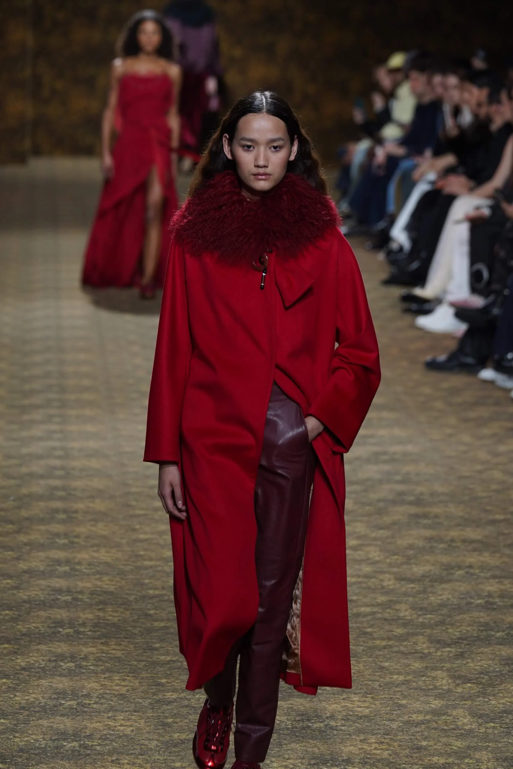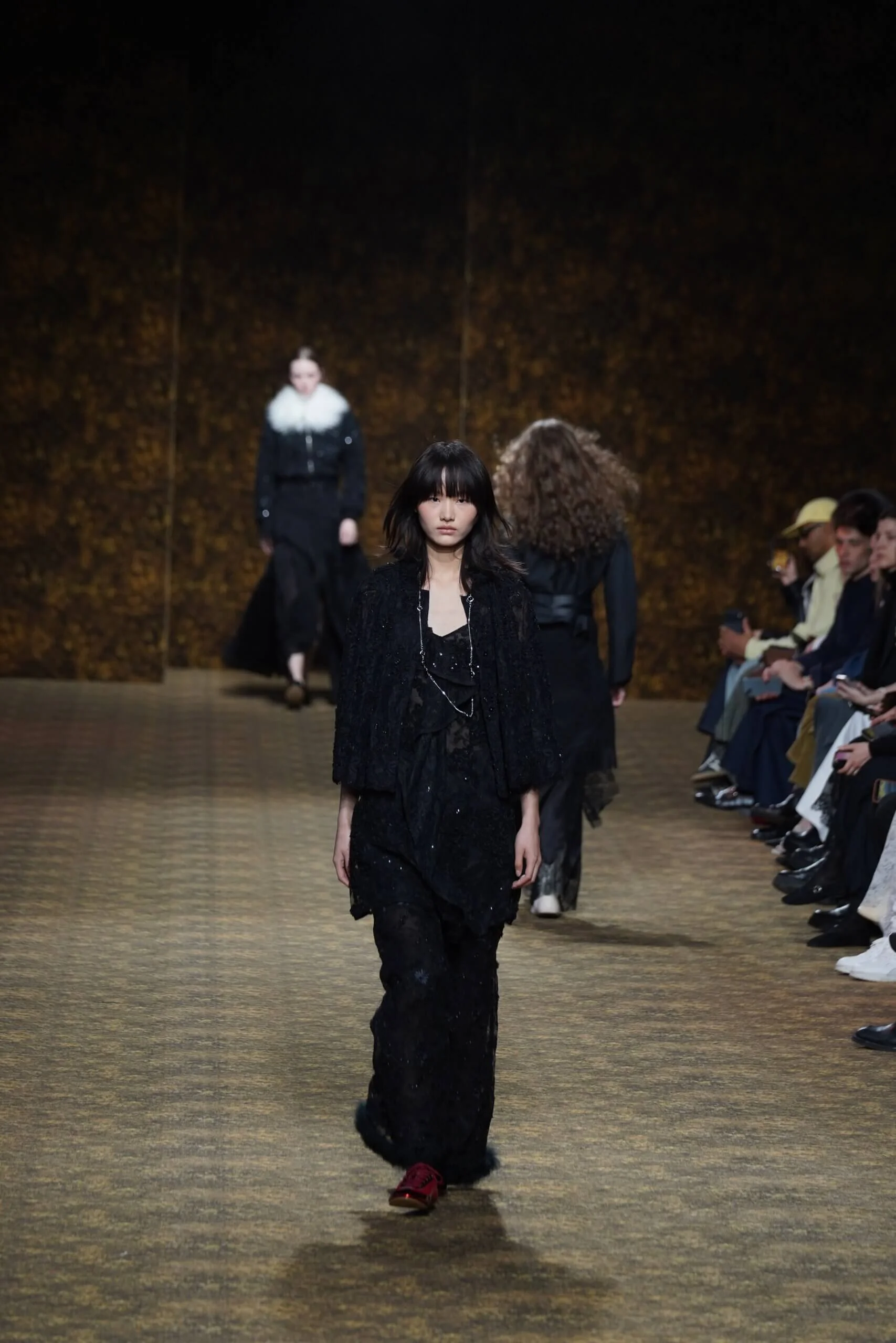 圖騰以山水、鹿紋與宮廷出遊為織錦意象;材質大幅出現金屬與翻毛,在冷暖間構築立體對比。男裝方面也不讓巾幗,延續了盛世的飽和能量,透過陰刻刺繡與仿舊處理讓時間在布料留下痕跡。西裝外繫腰封、方形連袖與中式鑲邊口袋,構築剛勁而內斂的細節,細小玉石裝飾與毛料點綴領口袖口,營造如壁畫般的質地,在歷史感與當代剪裁間取得精準平衡。
