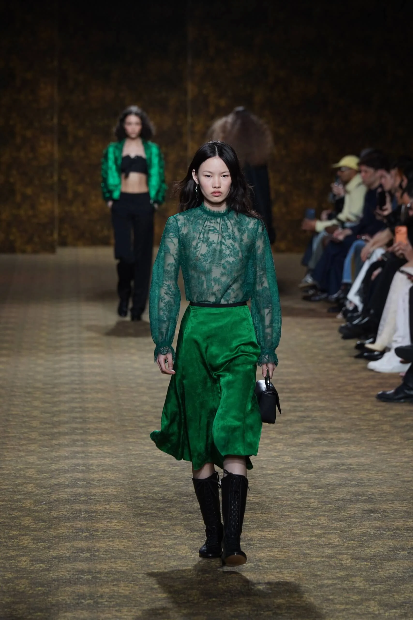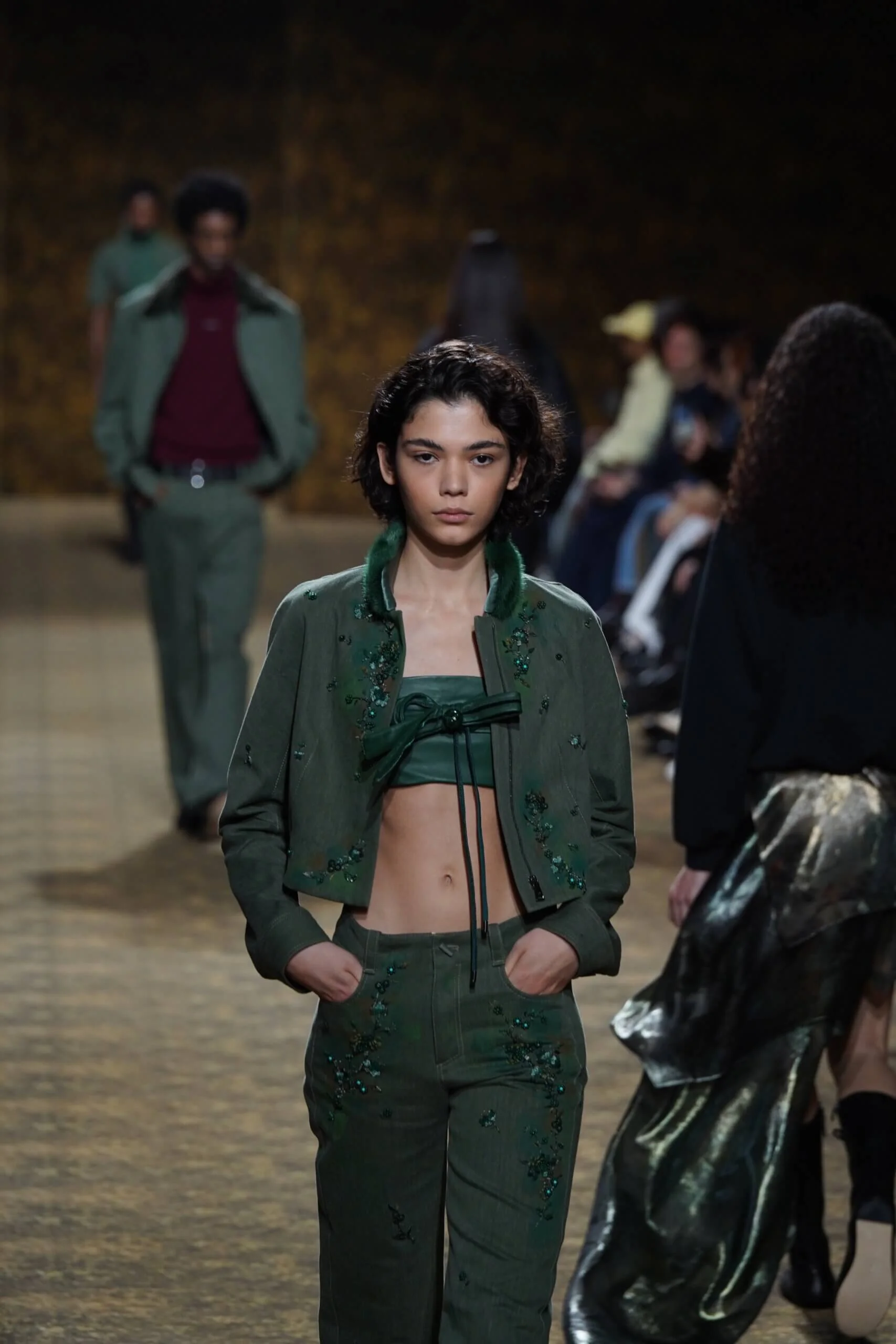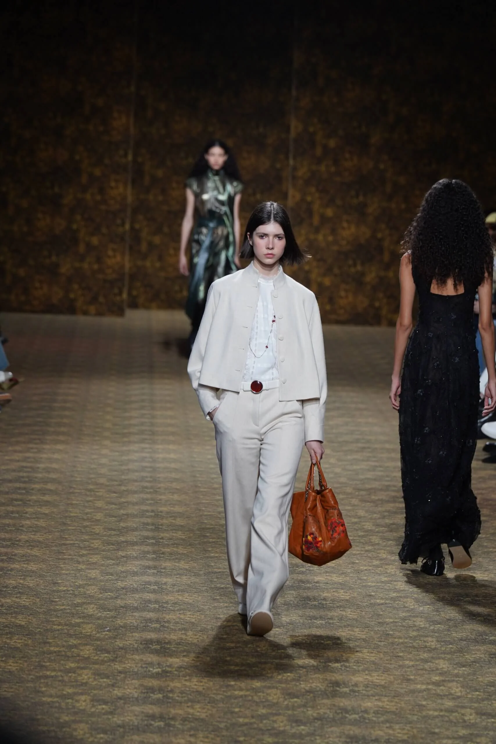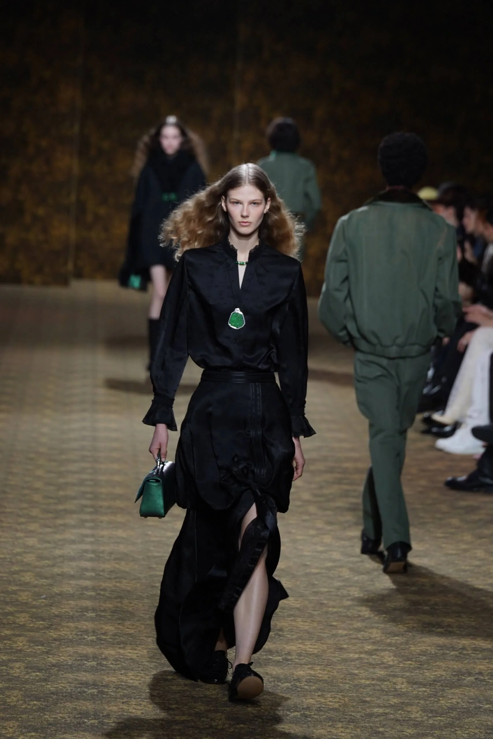 玉不行走,卻在舞中成形。玉作為本季的重點,當然無處不在,小至鑲嵌於刷色牛仔的玉片,隨步伐輕響,大至繫於身的平安扣,化為貼身的精神標記,無不展示出玉自生其光的特性。
