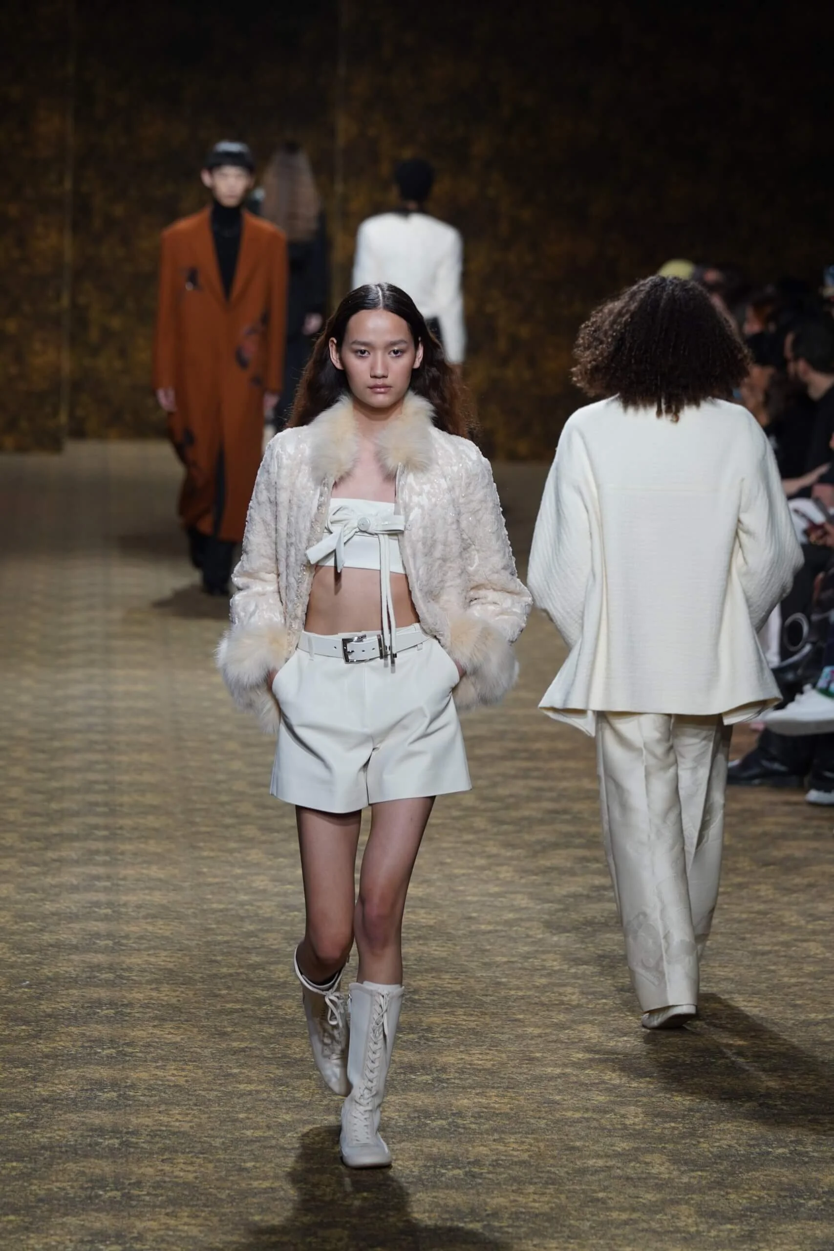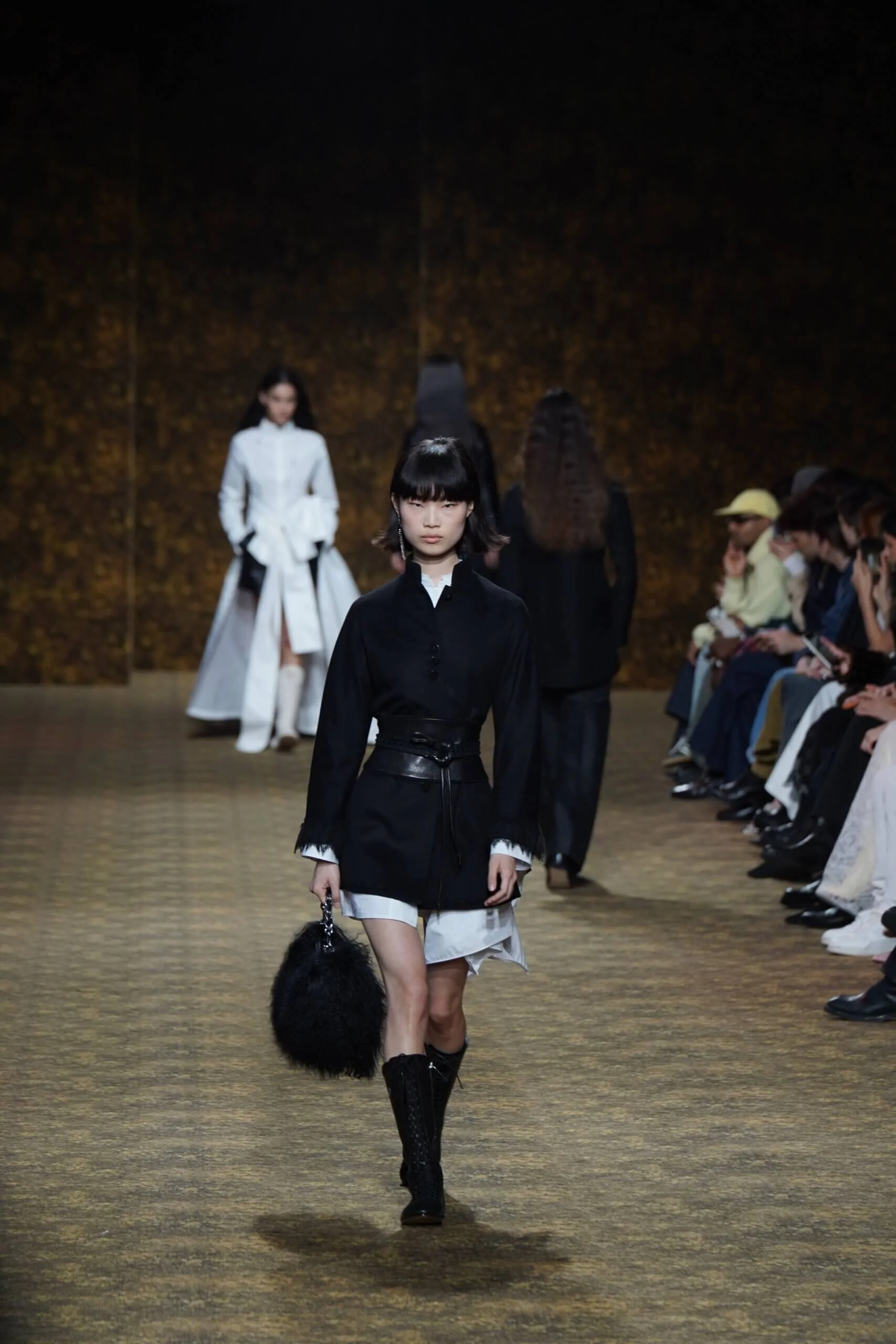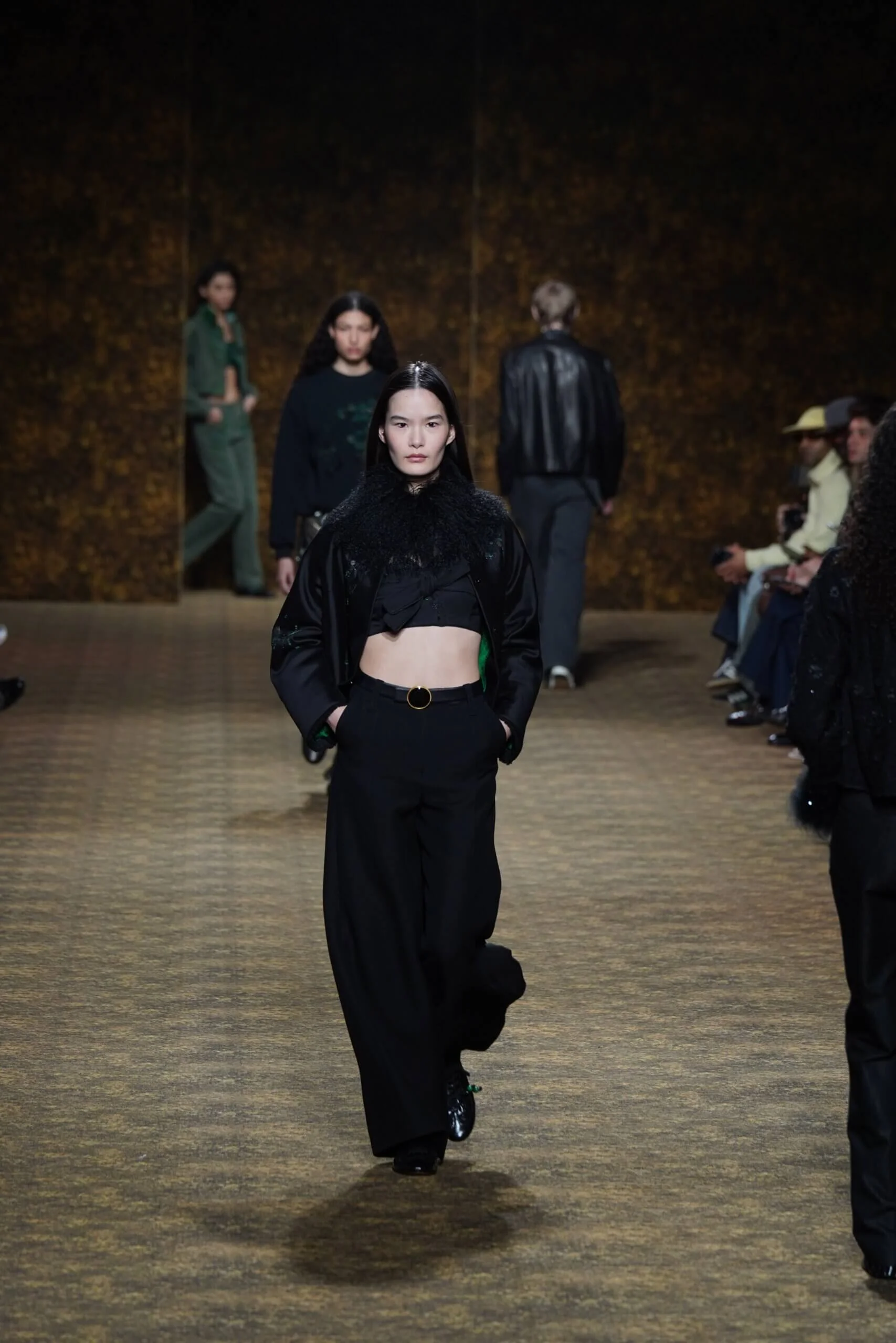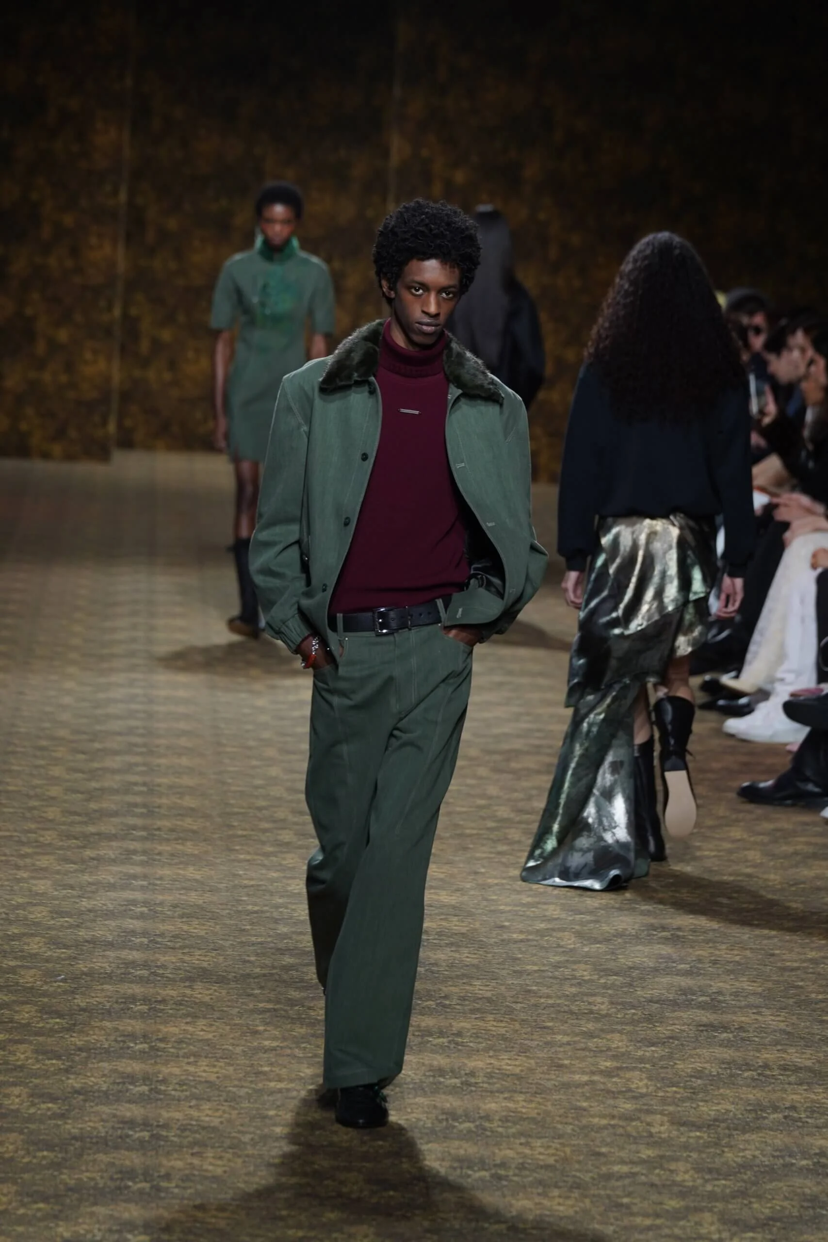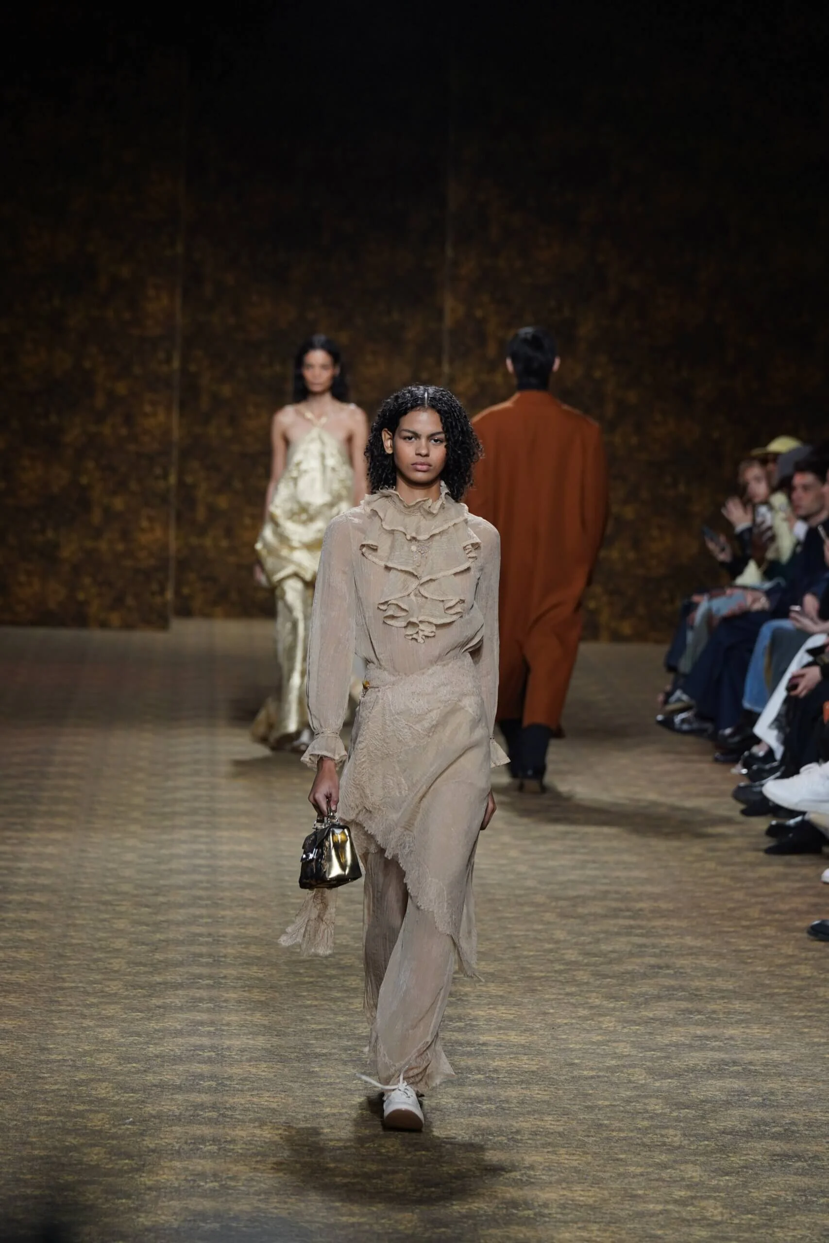 玉不行走,卻在舞中成形。玉作為本季的重點,當然無處不在,小至鑲嵌於刷色牛仔的玉片,隨步伐輕響,大至繫於身的平安扣,化為貼身的精神標記,無不展示出玉自生其光的特性。