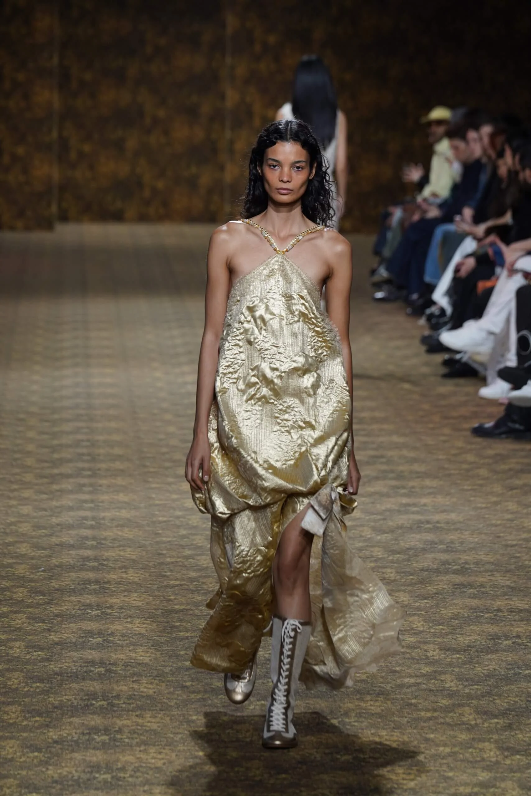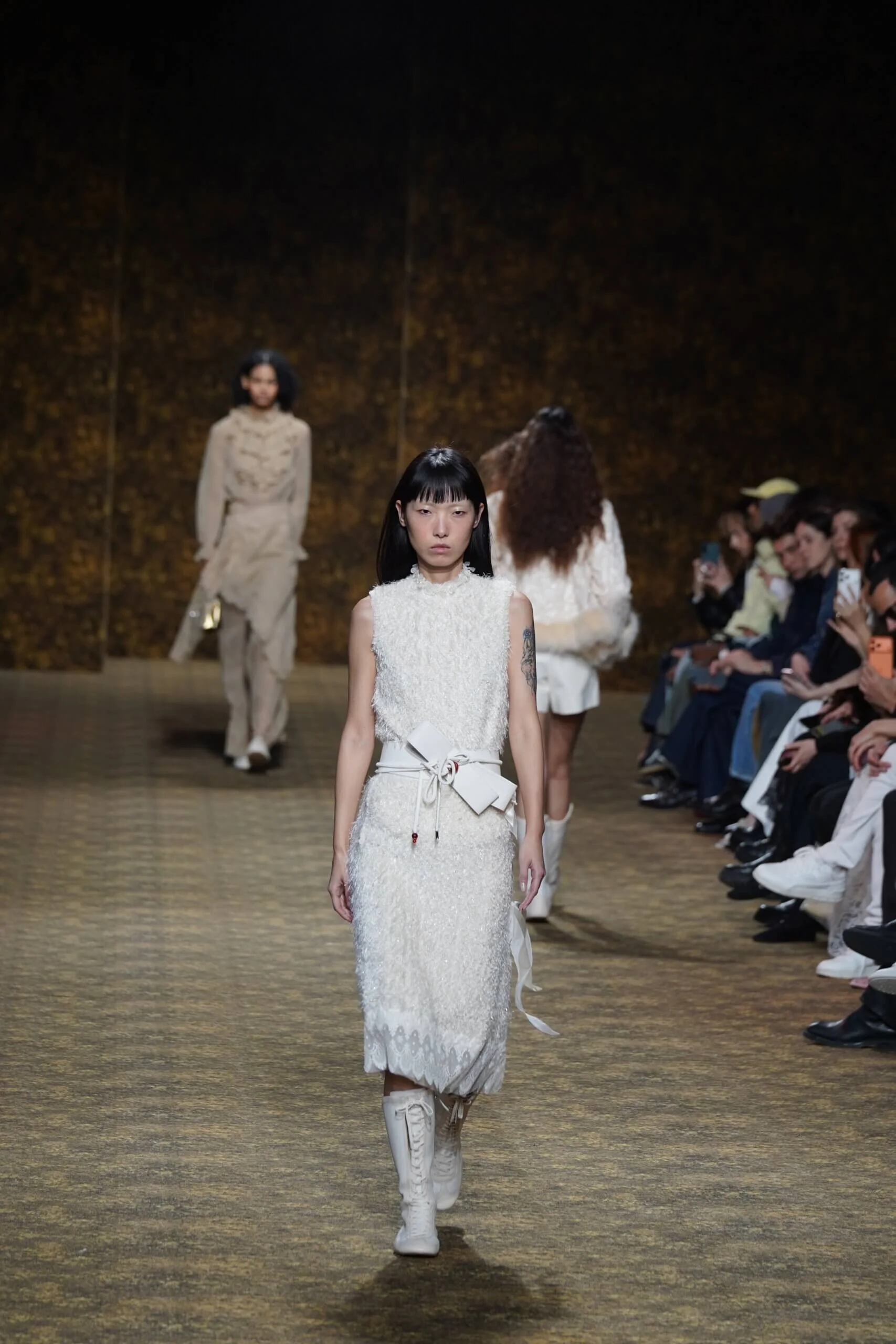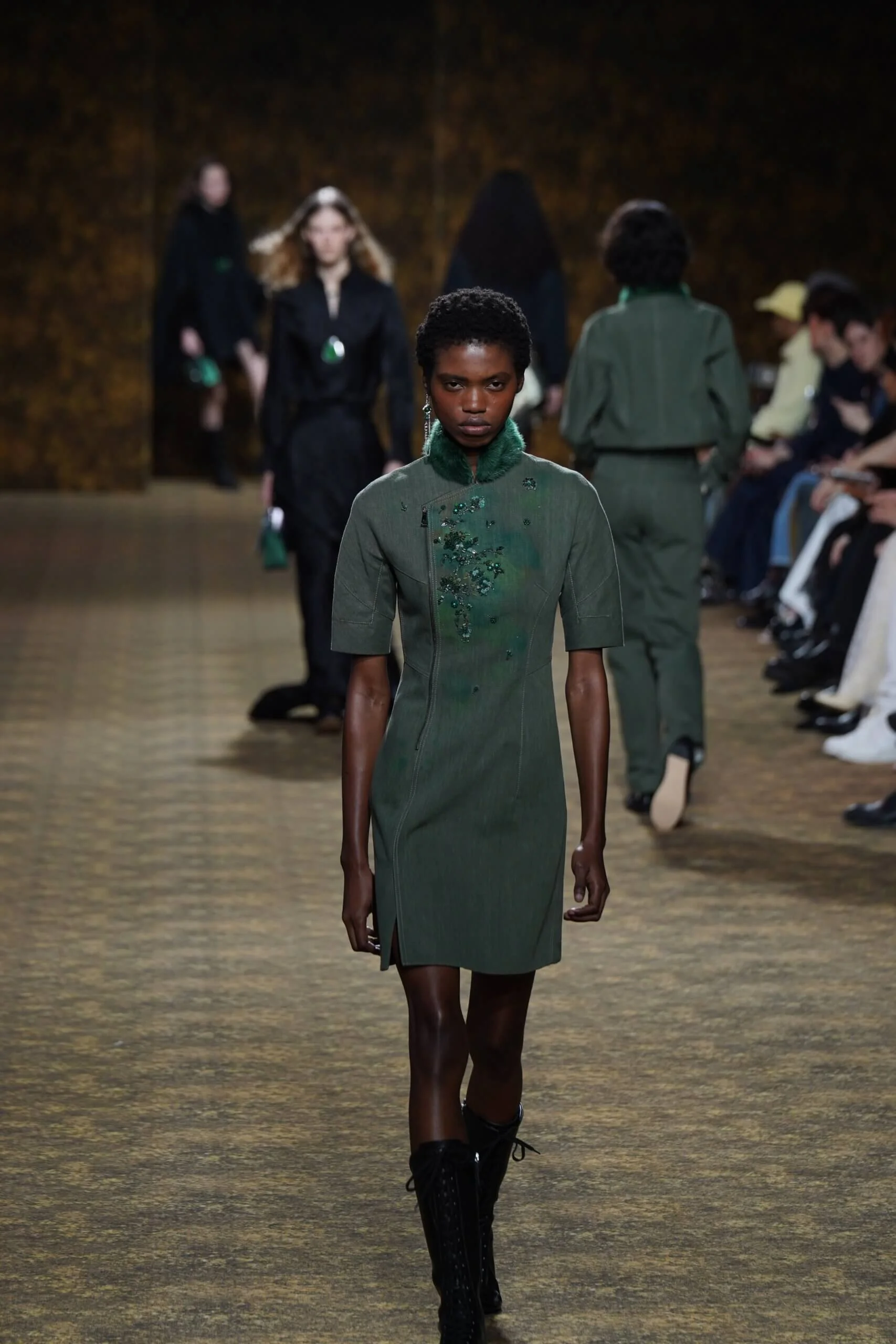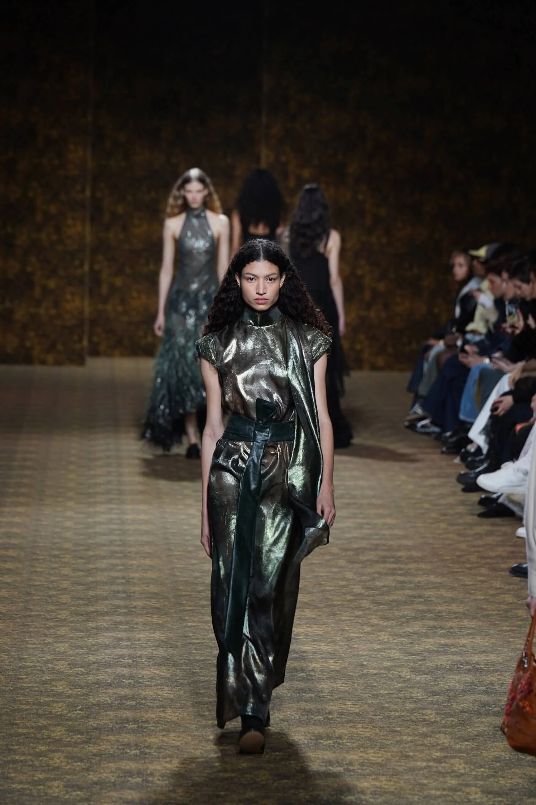 玉不行走,卻在舞中成形。玉作為本季的重點,當然無處不在,小至鑲嵌於刷色牛仔的玉片,隨步伐輕響,大至繫於身的平安扣,化為貼身的精神標記,無不展示出玉自生其光的特性。