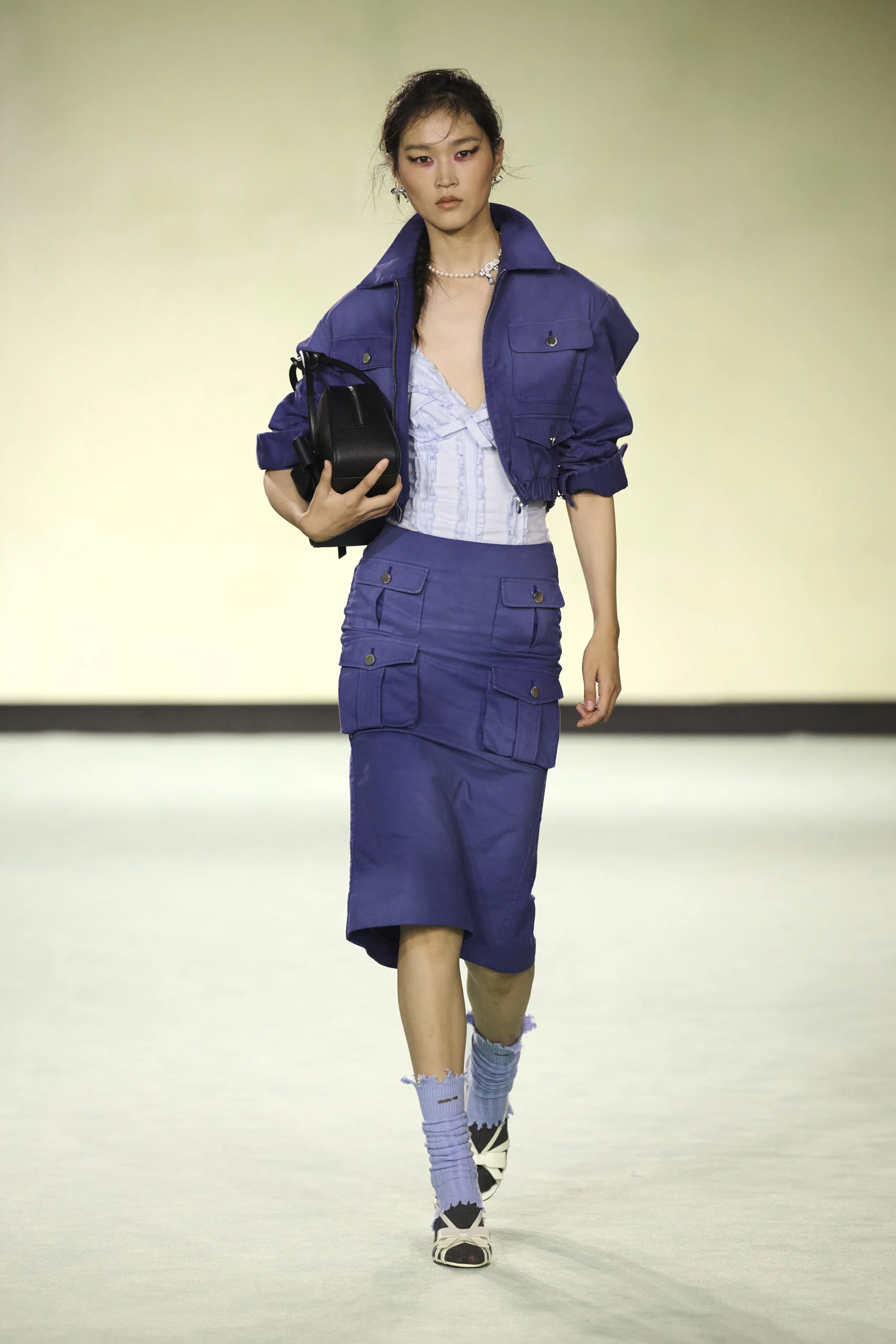 這一季我們第一次嘗試水洗、噴白和做舊的工藝,也用了以前完全沒用過、看起來有點像扎染、被弄髒的面料,還有偏工裝感的油蠟布。其中有一個LOOK是水洗後再漂白的衛衣,搭配藍色荷葉邊半裙,裡面疊穿白色POLO衫和紅色領子。這種組合和工藝都是以前比較少做的,但最後呈現出一個很新的形象。