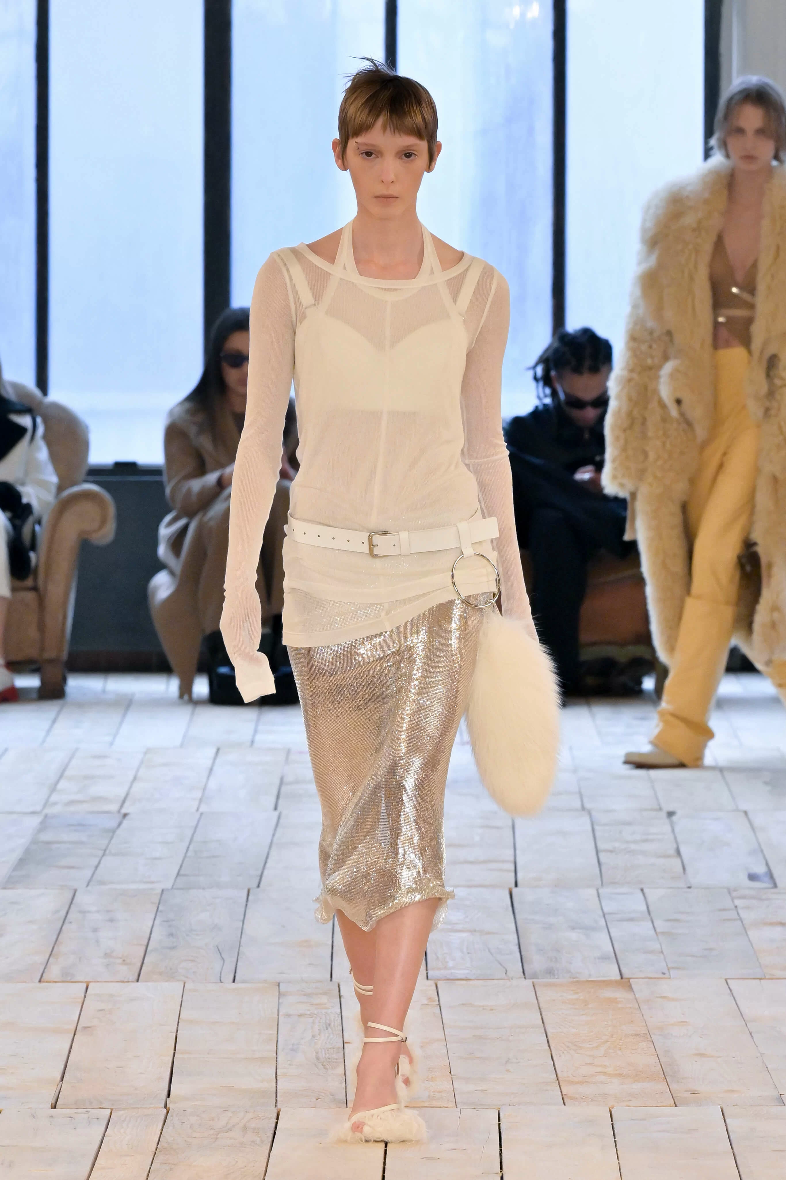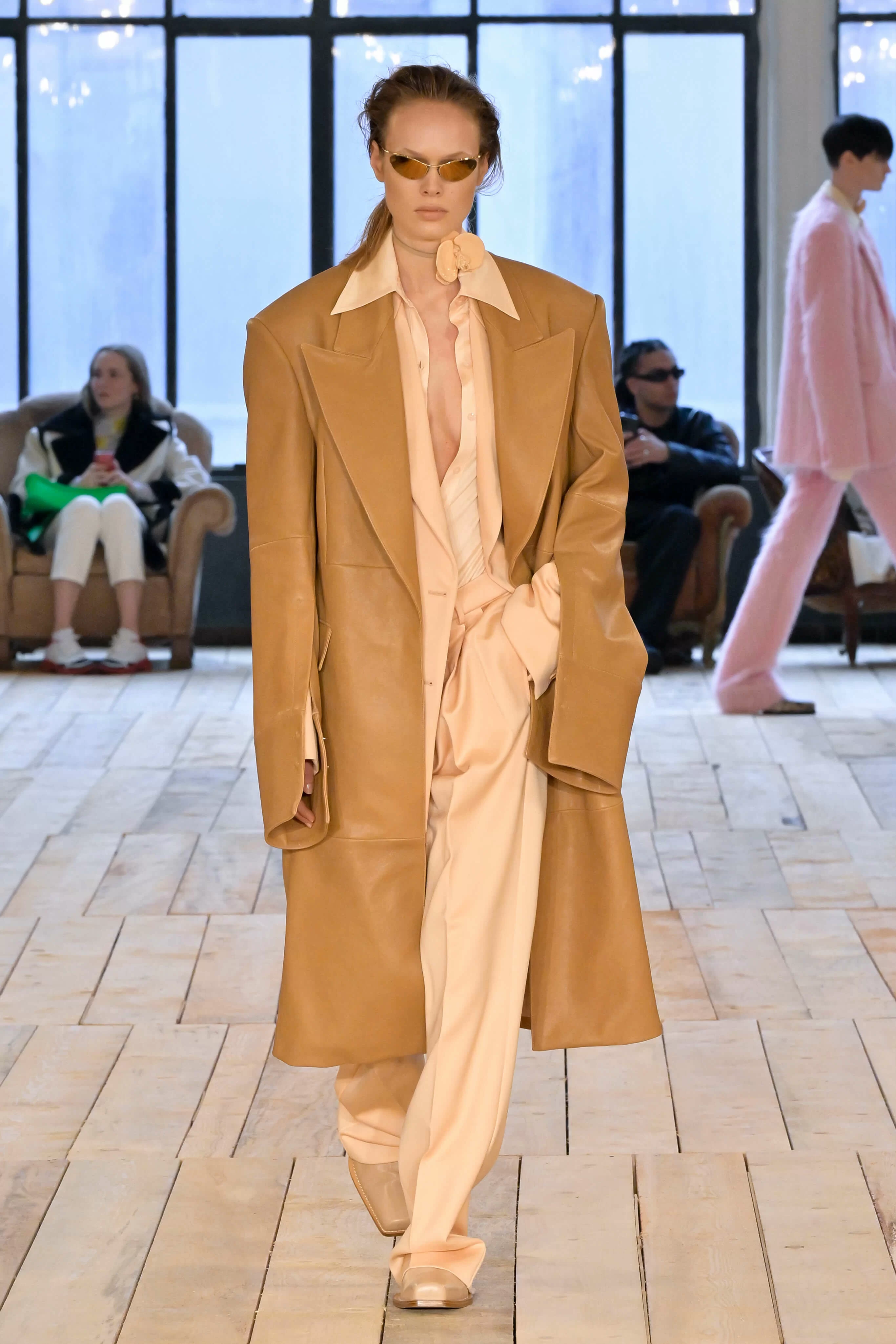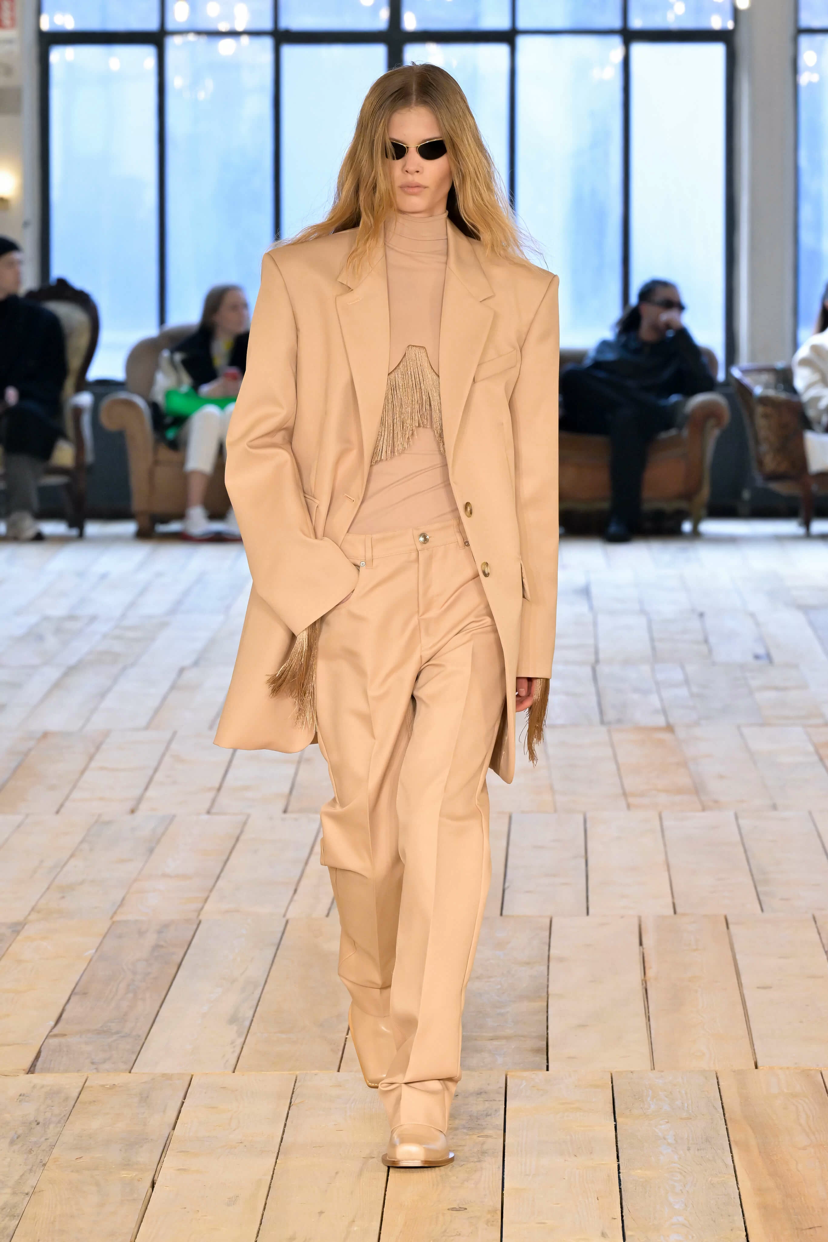 打結的布料營造鏤空,成為晚裝裙子,隨身形搖曳生姿。闊腳褲和墊肩的肩部設計從 ZOOT SUIT 和 TEDDY BOYS 風格中採擷靈感,凸顯考究精裁工藝。 90 年代經典的連身裙,再度脫穎而出,煥發新生魅力:採用直筒、及膝和醒目層疊設計,為輕薄透明的廓形注入靈動活力。整個系列充分展現了精緻優雅、質樸時尚與迷人雌雄氣質之間的鮮明對比。
