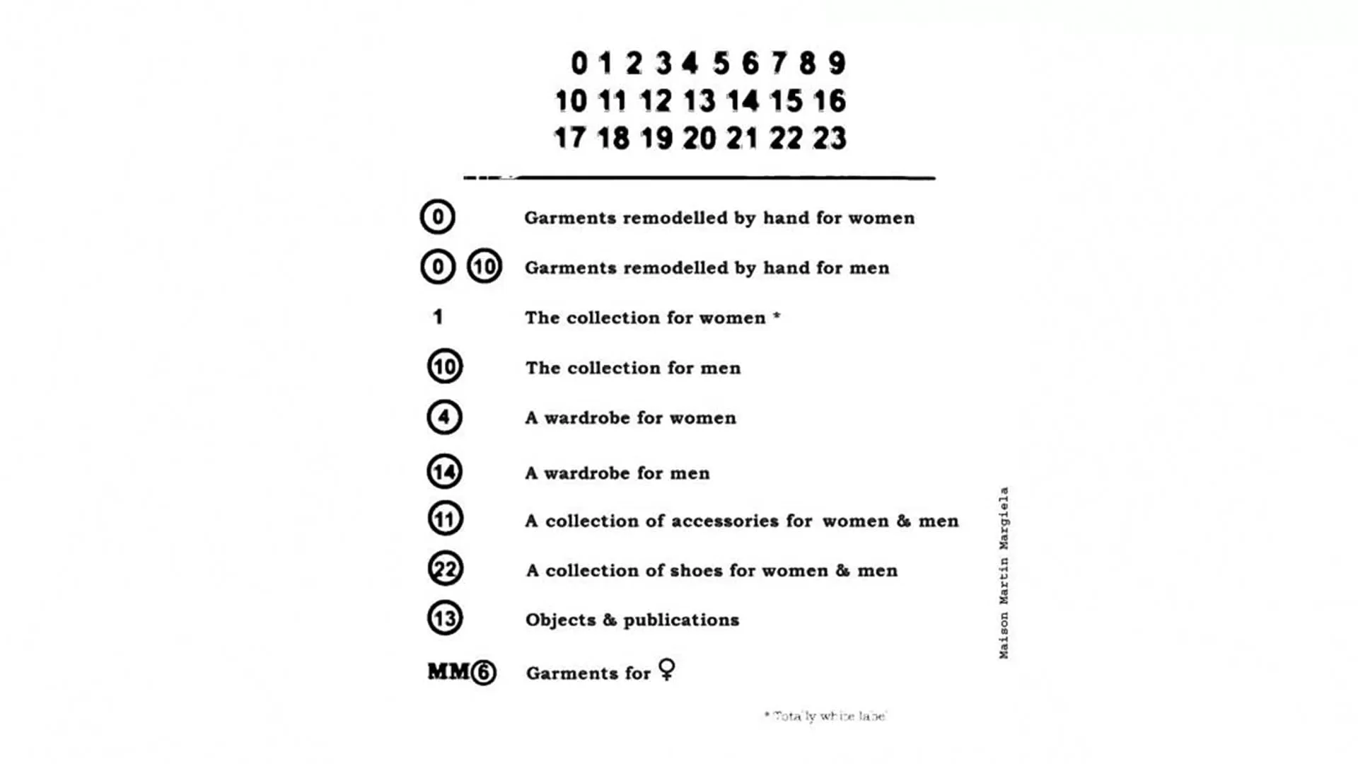 「0」在 MM 的世界裏代表著「’ARTISANAL’ COLLECTION」及「’CO-ED’ COLLECTION」的創作,而這個「0」將成為MM每一個季度的核心,其創作靈感為其他的「數字」帶來產業化的實現。「1」與「10」分別意味著MM的「女裝」與「男裝」系列,受「0」的啟發從而製作出一系列在MM店舖販賣的衣服。