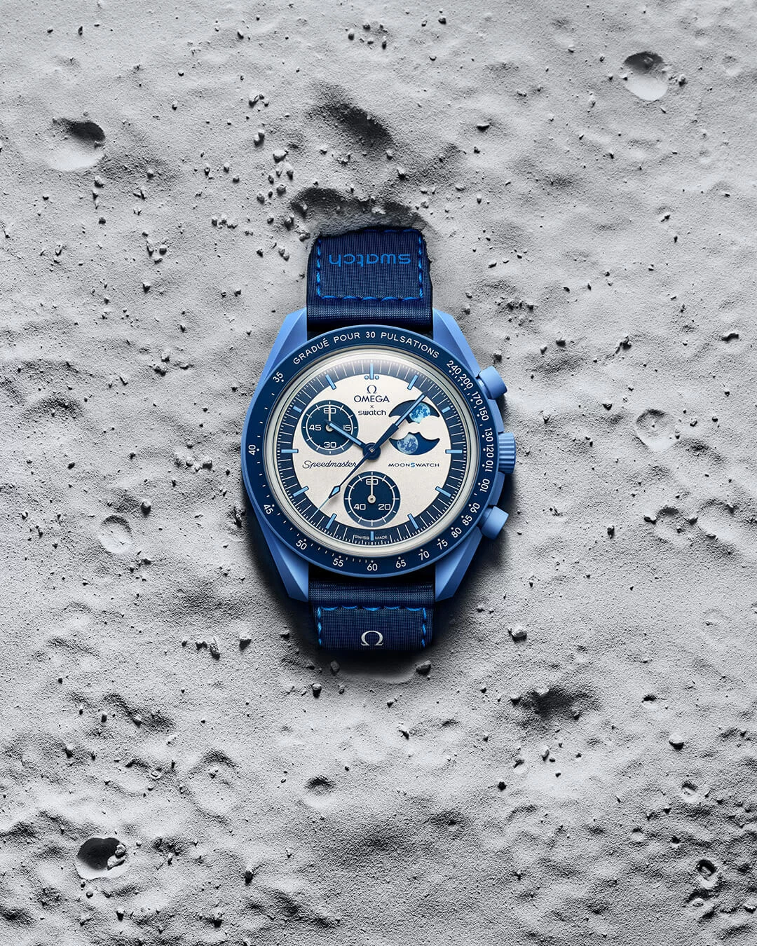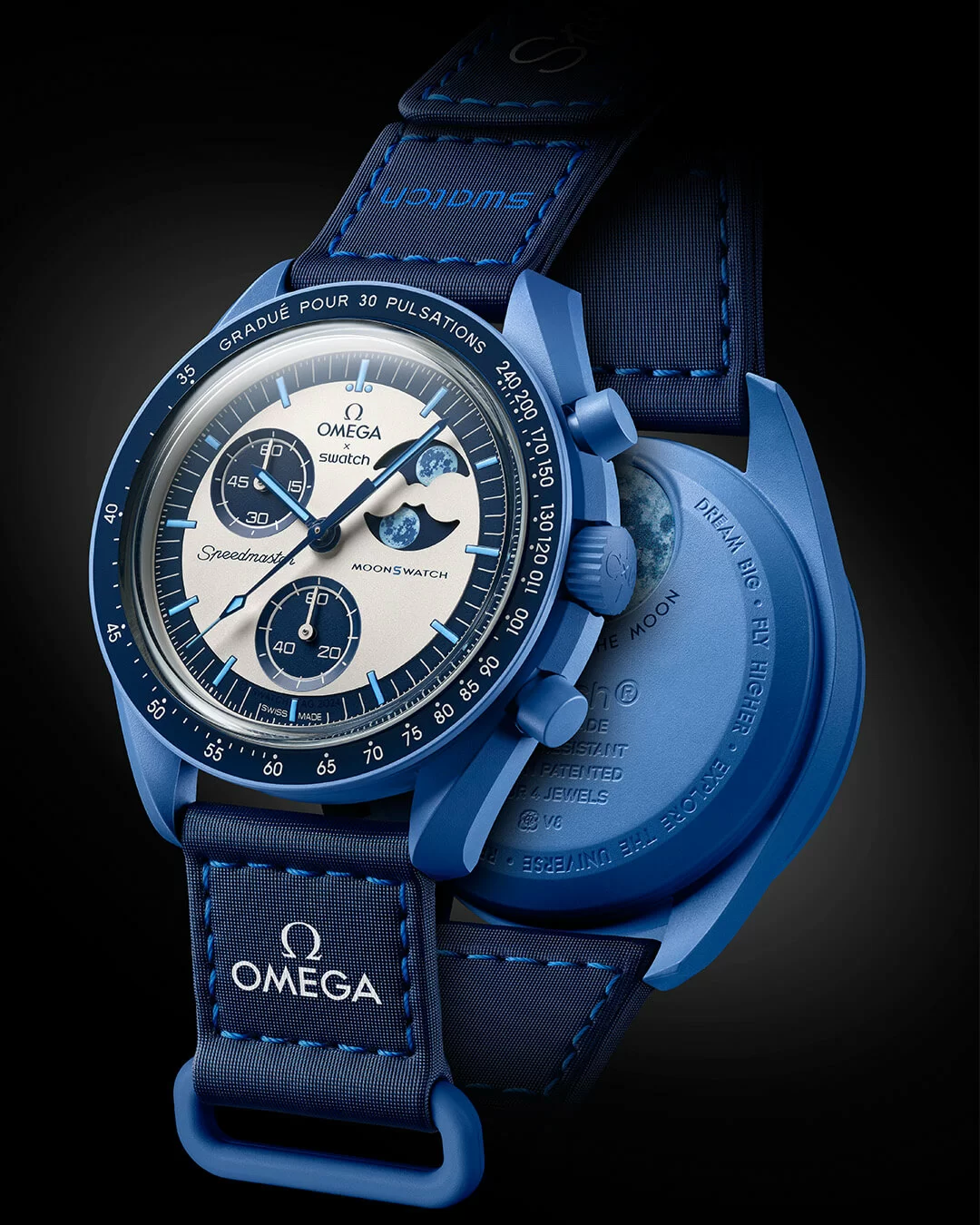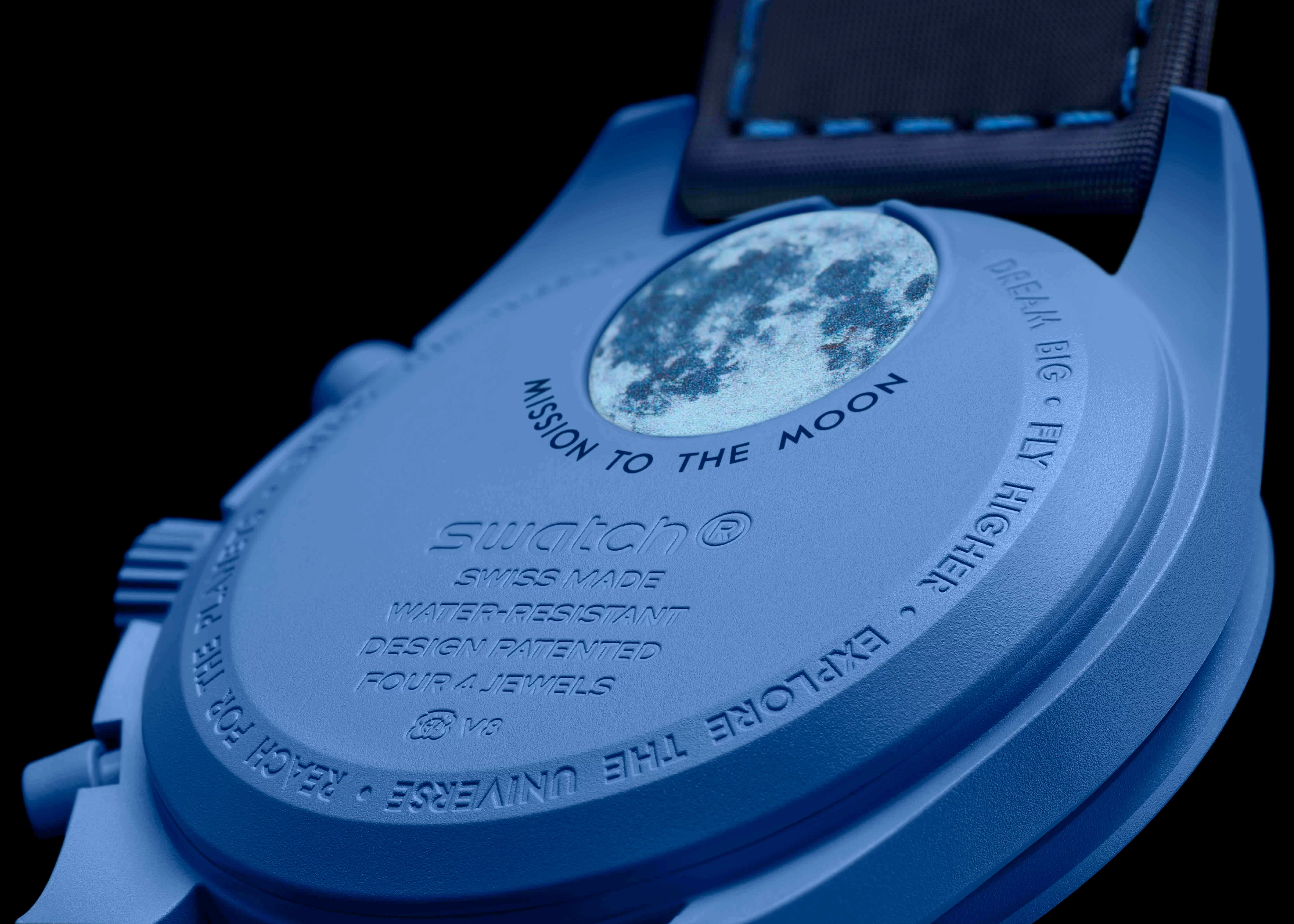 如上文所說,MOONSWATCH 系列是採用 BIOCERAMIC 生物陶瓷精心打造,強韌而柔軟,配備淺藍色縫線的藍色 VELCRO® 錶帶,而在錶盤和錶冠上均飾以 OMEGA X SWATCH 標誌;在錶殼背面亦飾有月亮圖案,寓意把幸運放在手上。