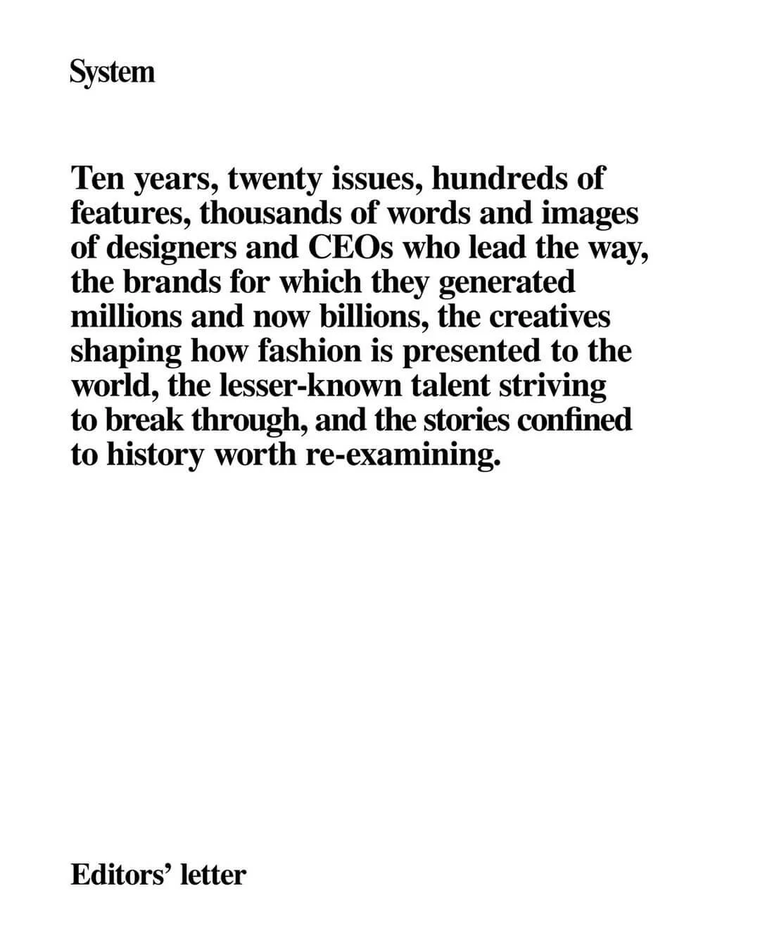 另一方面,雜誌成立十年製作共二十期書籍,而每期邀請的嘉賓都在時尚界有着舉足輕重的份量,其中川久保玲、山本耀司、GIORGIO ARMANI、MIUCCIA PRADA、ALESSANDRO MICHELE、KIM JONES 等人均登上成為封面人物,能夠如此集結半個時尚圈的風雲人物參與訪問,可見它深受設計師、時尚業界和讀者支持喜愛。除此之外,過往購買方式亦增加《SYSTEM》的珍貴程度,如果你想入手也絕非易事,只因它精緻的內容程度比一般市面的時裝雜誌艱深,導致世界各地的一般書店報攤鮮有售賣,而香港就需要到台灣某品牌的大型書店先有出售,加上售價過份昂貴,一本雜誌來港竟索價接近 $500 港元,只能說「一分錢一分貨」,替讀者銀包流淚。