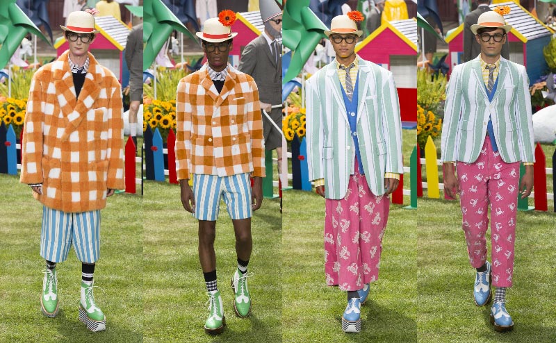 整個系列的重點落在剪裁的比例,這亦是 Thom Browne 最擅長的設計技巧。模特兒緩緩地走進這個超現實的遊樂園,身上所穿的設計要不看上去尺寸過大,要不看上去就像穿起小男孩衣服的錯覺,與天橋中央的誇張比例風車裝置互相暉映。