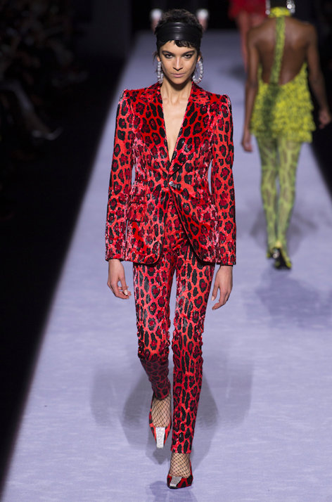 豹紋經常出現在Tom Ford的設計中,但大家沒有想到設計師是一個”leopard-mania!如果可以see now buy now,相信各款豹紋外套會被一掃而空。修身剪裁的西裝是設計師的拿手好戲,那套紅色與綠色的豹紋套裝以水晶和珠片處理,一定令大部分在場的女士們蠢蠢欲動。如果你還在為投資一件statement piece而煩惱,Tom Ford今晚已經給予大家一個最好的答案!