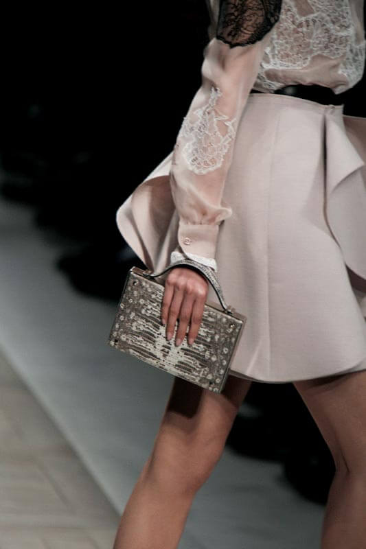今季 Valentino 依然故我,以最女性化的剪裁輪廓貫穿整個系列,不同之處是採用堅挺的布料、鋒利的剪裁造出 stiff 的感覺。例如剪裁特別的 ruffle trench coat、或以皮革製成的全黑多層ruffle 裙子,筆挺的線條令 ruffle 變得充滿型格。色調方面,除了全白、黑與米色,亦有品牌 signature 的紅色,在新穎的剪裁下,變得更年輕。品牌近年銳意年輕化,一款飾有鍋釘的尖頭鞋款,在以前的 Valentino 是不可能找到的。當然為了照顧一班忠實的長期顧客所需,今個系列仍可以找到傳統的晚裝裙與手袋設計,前衞與傳統共存,皆大歡喜!