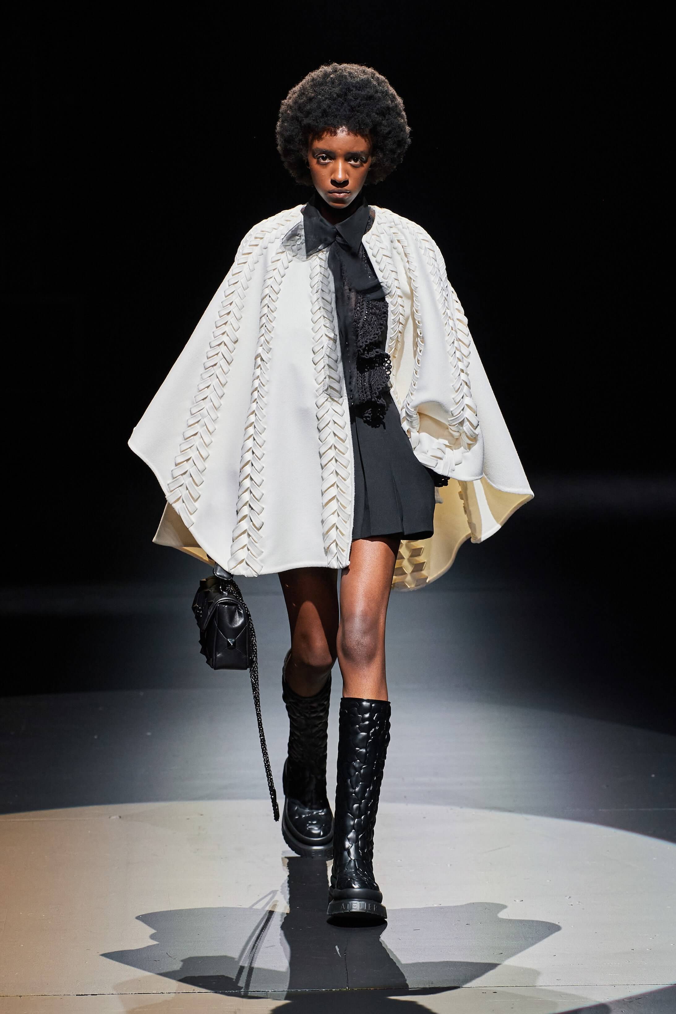 秋冬系列將春夏 2021 高訂系列的部分元素延續至成衣系列中,將鮮豔顏色換黑白色調,偶爾散發出淡淡的金色。所有下身的剪裁都縮短了,是 PIERPAOLO 刻意改變的剪裁,並將高訂中的短羊毛披肩帶到系列中,加上菱形鏤空的羊絨毛衣,露出內裡乾淨的白恤衫配上黑色短褲,露出大部分的腿部和優雅的細跟高跟鞋,展現女性性感而優雅的一面。PIERPAOLO 特別提到,希望系列能清楚展現高訂系列的感覺。系列少不了有 VALENTINO 標誌性的薄紗連身裙,飄逸而充滿靈性,浪漫之餘,對 PIERPAOLO 來講,主宰著自己身分的自由,既是浪漫也是叛逆的行為。