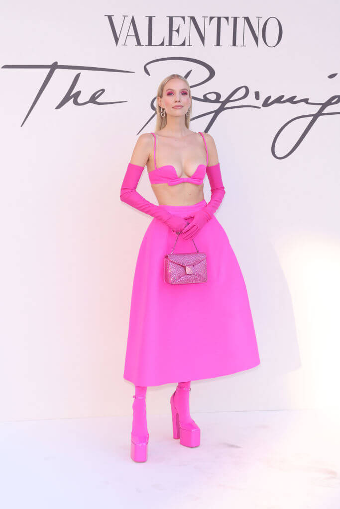 首當其衝的當然是 VALENTINO HAUTE COUTURE FW2223 時裝秀, ANNE HATHAWAY 以一身VALENTINO HOT PINK 高領亮片連身短裙驚喜示人,筆直長腿配上 GARAVANI PLATFORM HEELS 更顯高挑,同樣跟上粉紅熱潮的還有穿著透視紗裙的 FLORENCE PUGH、以立體玫瑰花點綴閃片裙的 MAMAMOO成員華莎、皺褶花卉刺繡露肩短裙的 ARIANA DEBOSE,和亮片小背心連背帶褲的 ELODIE。清一色的 TAN-GO PLATFORM PUMP 不顯顏色和設計上都引人注目,6 吋高跟配上 2 吋的方頭厚底 PLATFORM 成為女明星們的必備單品,連 DUA LIPA 和 ARIANA GRANDE 也對它愛不釋手!