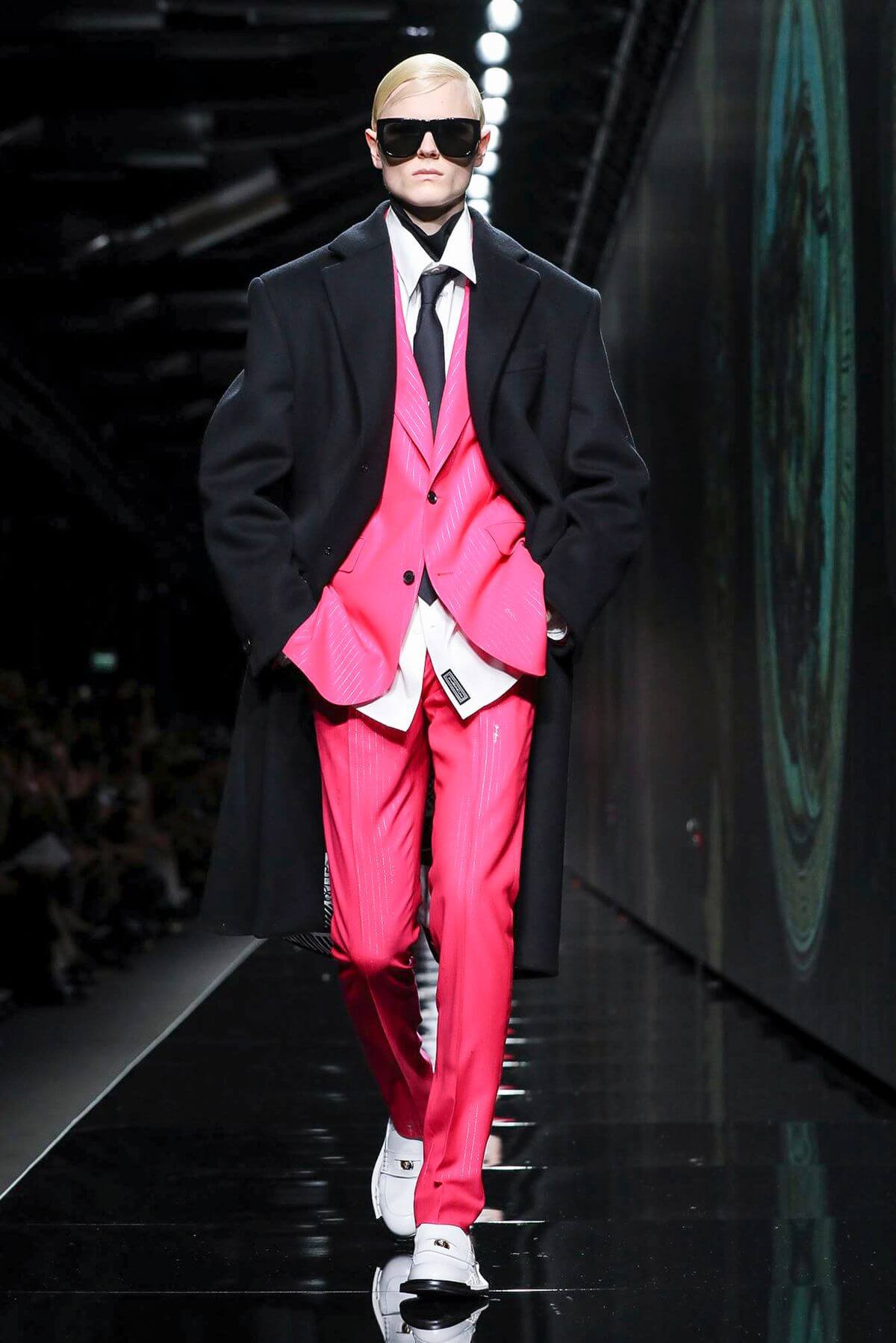 公平點說,這個問題不應只問VERSACE,而且今趟是品牌首次男女裝合併展出,款式比較齊全可以理解。今季DONATELLA主張兩大「超級」:HYPER-FEMININITY與HYPER-MASCULINITY,兩性氣質兩極化極致發揮,說到性別流動以致IN-BETWEEN的不明暖昩,可不是VERSACE那杯茶,但無論是妖男或艷女,都能發光發熱施展渾身解數,誇張的肩線、箍緊的腰線、短打熱褲套裝無分彼此在男女裝都見到,混搭的花紋看得人眼花繚亂,數碼DIGITAL PRINT夾花卉併斑馬再襯條子格紋,感覺非常之高壓電力,VERY ELECTRIC。