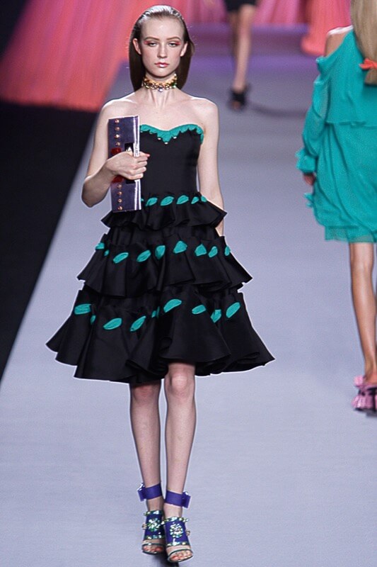 稱得上娃娃服,當然不能缺少在結尾部分出現的多款 A-line 公主晚裝裙,例如黑色喱士拼藍色網紗裙,以及最後的婚紗造型,成就此夢幻又能勾起童年回憶的系列。