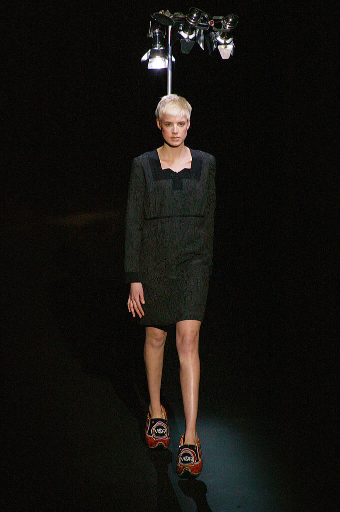 這一年他們瘋狂得把本該在天橋上方的spotlight也安裝在模特兒身上,讓人不得不「聚焦」在服飾上。可憐模特兒要踩著高踭荷蘭木鞋、背著鋼架和射燈走秀。而衣服領口、衣肩、或裙邊等位置則被夾在鋼架上,令衣服能伸展開來,展示出不一樣的形態。頸上的民族風項鏈、格紋、純白色緊口襯衫等元素靈感其實來自荷蘭民間裝束。