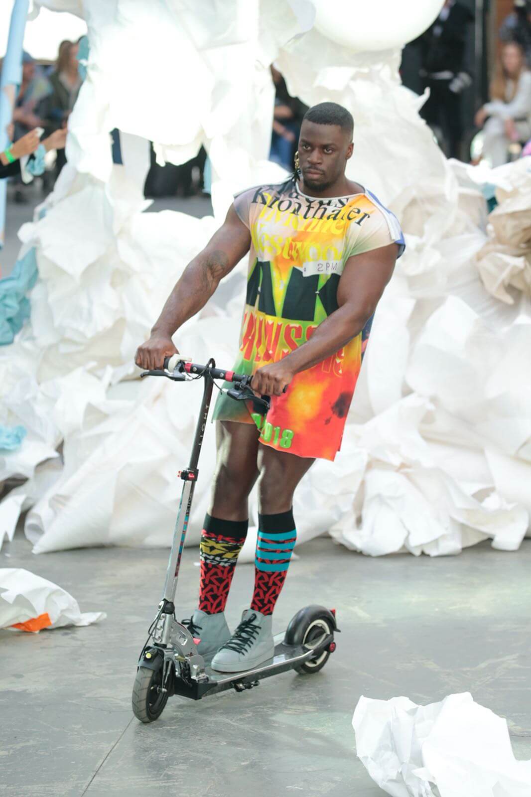主張性別平等和 unisex 的 Westwood不僅繼續讓男穿女裝,也找來知名變裝皇后登上跑道。男生方面,滑板花美男和電動踏板車肌肉男。女生方面也遵循了她一貫的審美,頭頂假髮,結構複雜的裙子,亞文化 street style。