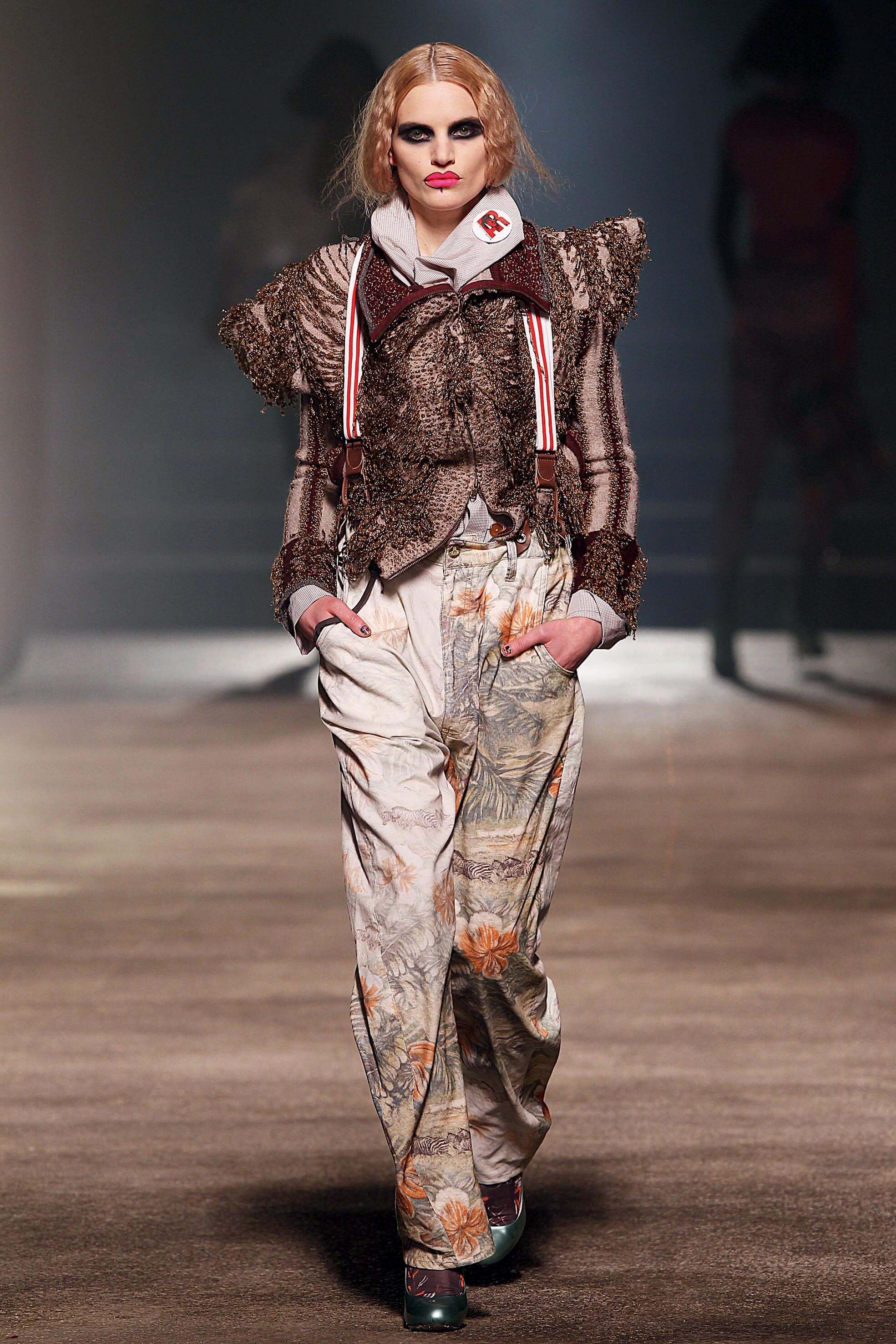 我行我素的 Vivienne Westwood,將運動元素混合她最喜愛的 punk、誇張的顏色配搭加上瘋狂的造型、奇異的化妝讓模特兒像男又像女,撕破了的 sweatshirt 配裇衫,像隨手將毛氈拿來往身上披的披肩長外套、像一個大垃圾膠袋的大褸、將多件小布碎合併而成的吊帶裙,看起來就像一班有型的流浪漢!