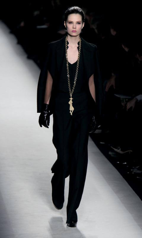 YStefano Pilati 擅長以簡單的時裝說故事,他的設計每每有牽動人們情緒的能耐。秋冬系列幾乎是清一色的全黑與白色, 素淨的顏色,簡單的線條、完美的剪裁,帶有一份宗教的味道,美得叫人傷感。其中全黑斗篷連身裙、斗篷外套、大領巾白裇衫配黑色輕紗透視襯衣,配過膝 maxi dress,均沉重得叫人屏着氣息。為了 減低系列的沉重感覺,Pilati 加入了少量跳脫的顏色如桃紅、藍、紫等,並以一款人形金屬吊墜長頸鏈作點綴, 為系列加入一點愉悅的氣氛。