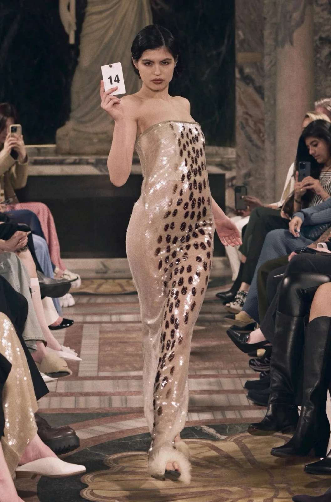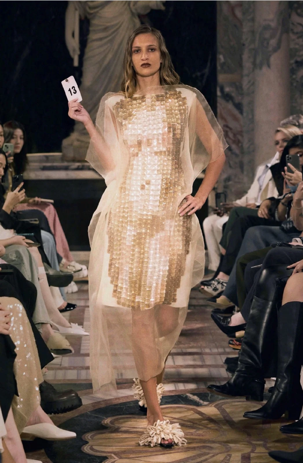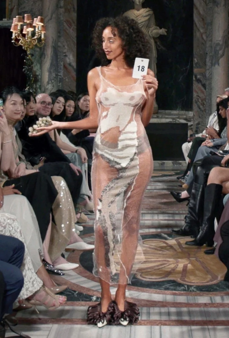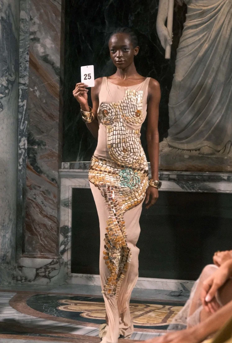 在 SS25 系列中,有兩件以馬賽克為概念的作品令我印象非常深刻。因為這個材料本身沒有孔,我們要先把它黏在有孔的珠片上,再一顆顆縫上去。其中一件衣服大部份是我利用下班或週末時間,一個人坐著慢慢縫的。在製作過程中,我可以隨時調整顏色、形狀及胸部的輪廓。那一刻我其實重新找回了最初的初心,就是很喜歡做手工。因為全部都是石頭,所以成衣完成後非常沉重,也讓我特別有成就感。